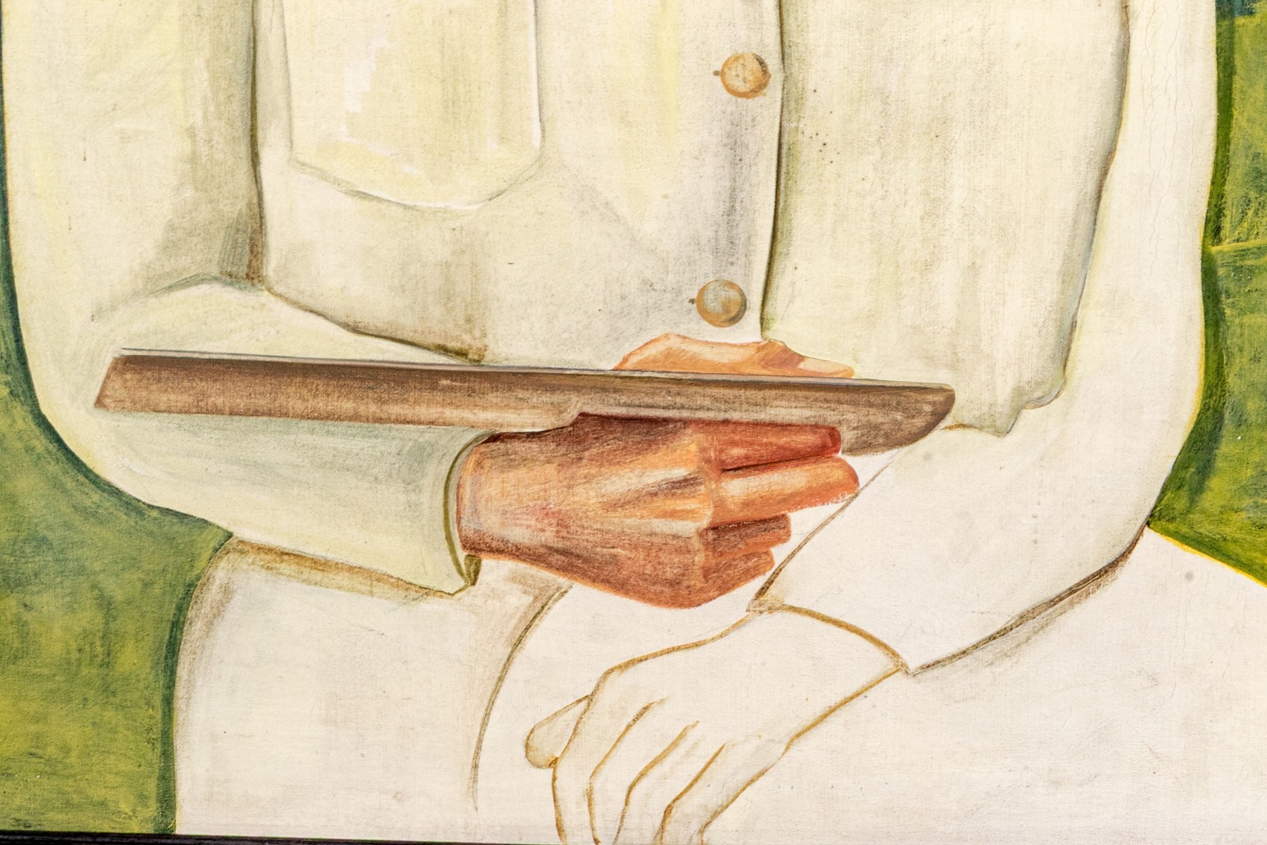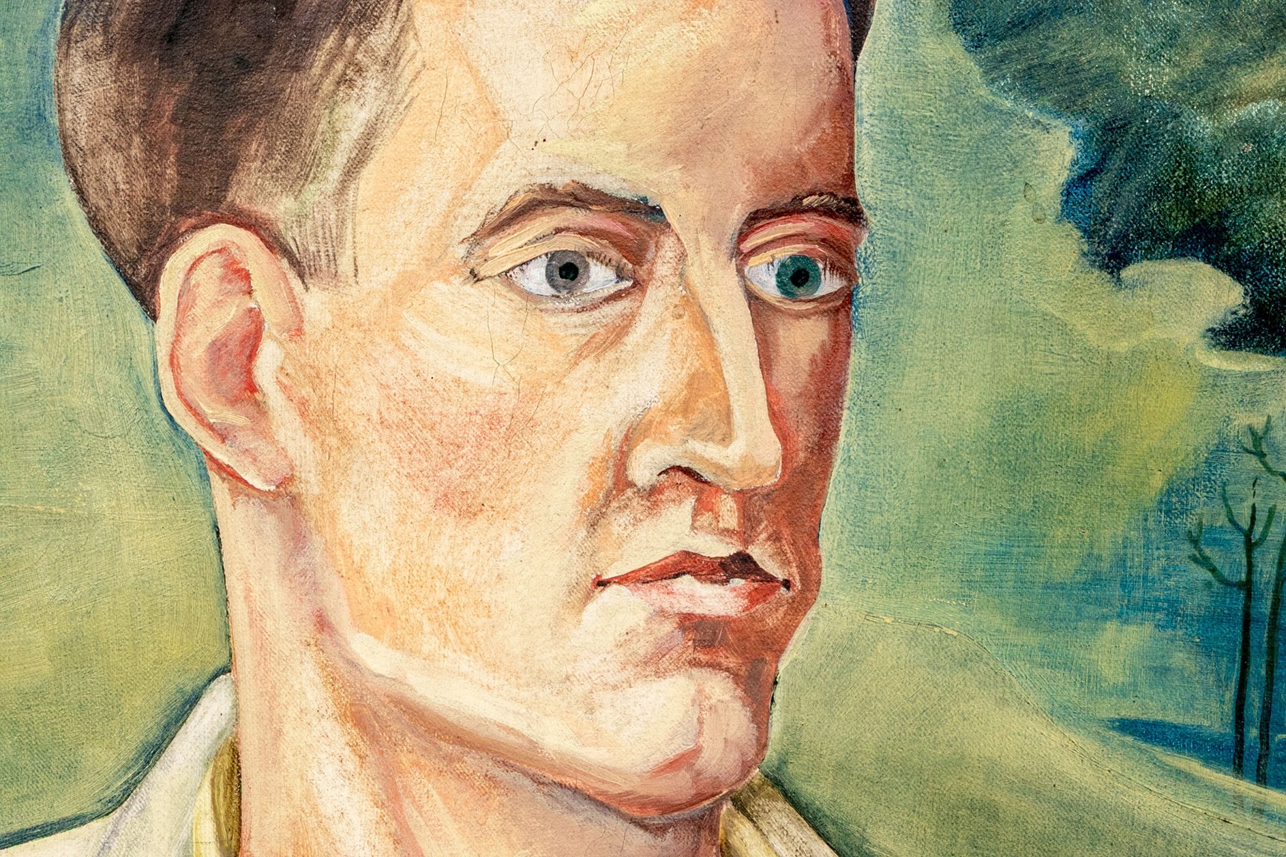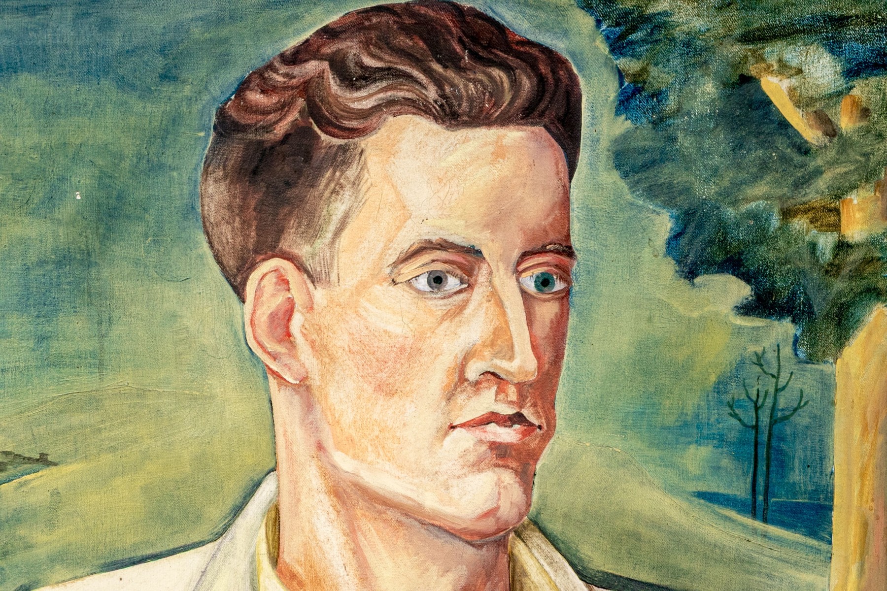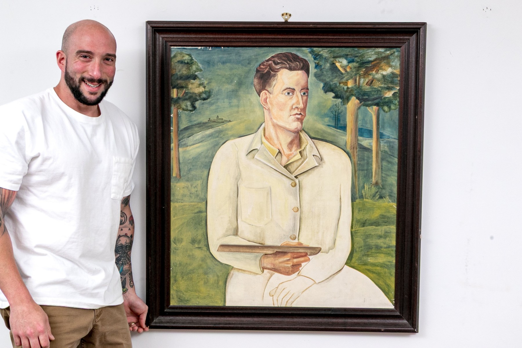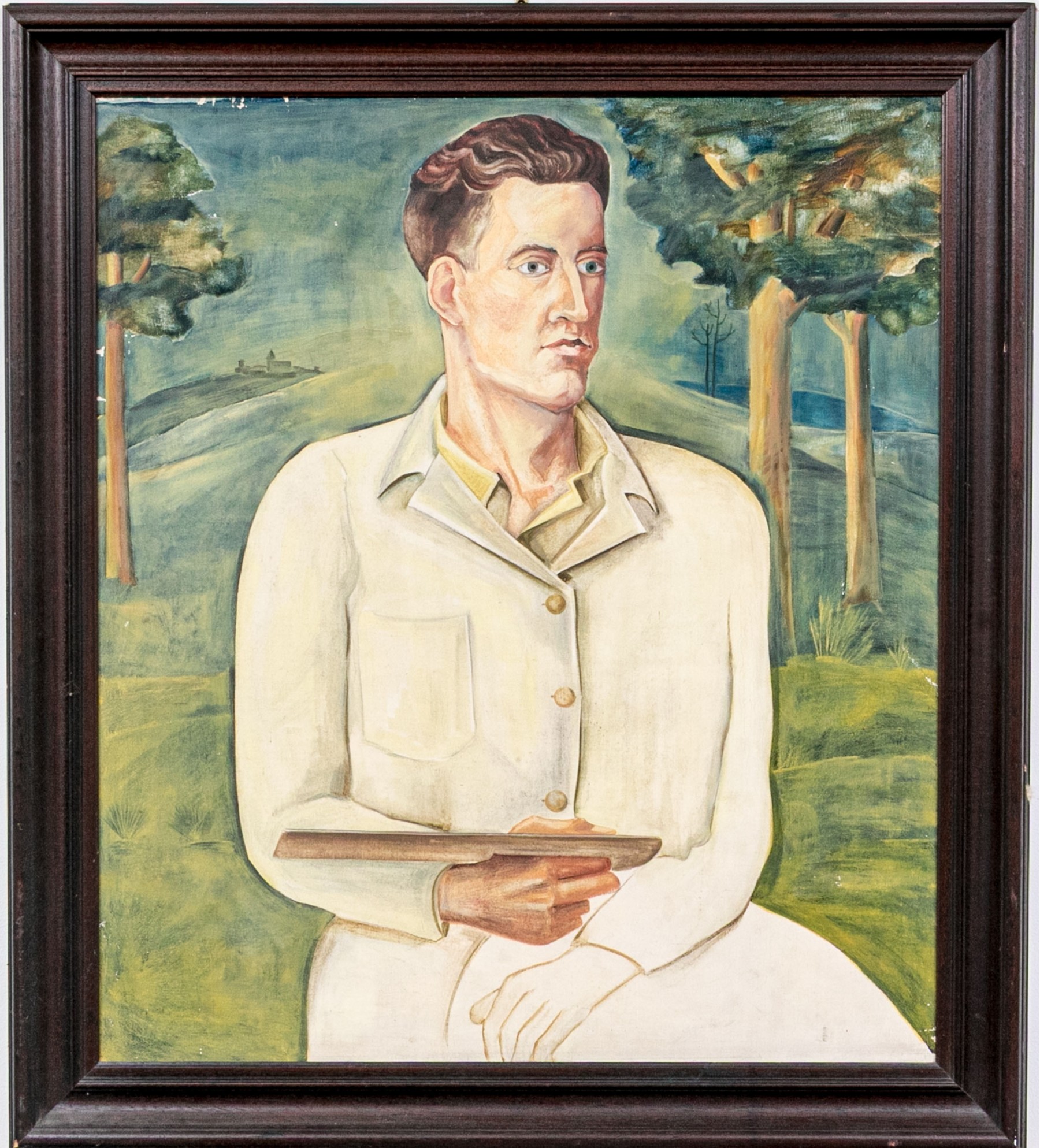 A nicely detailed and well sized oil painting on canvas depicting a gentleman, perhaps the artist in self portrait, with slicked back brown hair wearing a white collared jacket and yellow shirt holding what appears to be a wood palette. The man poses in three-quarter profile looking to the right, seated against a natural landscape with yellow-green grass and trees leading to a small pond at the back right. Appears to be unsigned.