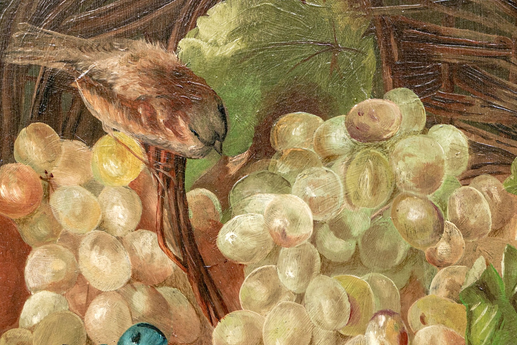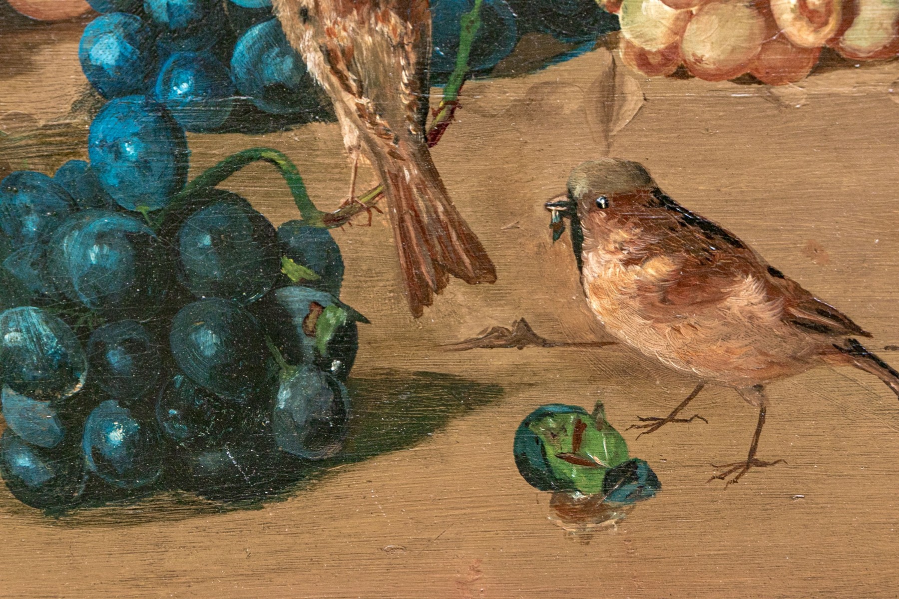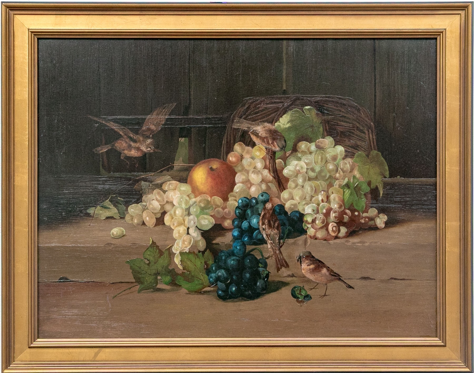 Unframed. a sweet scene with devilish sparrows flying to and eating the grapes and peach that have fallen out of a basket onto the floor. Presented in a black and gilt frame.