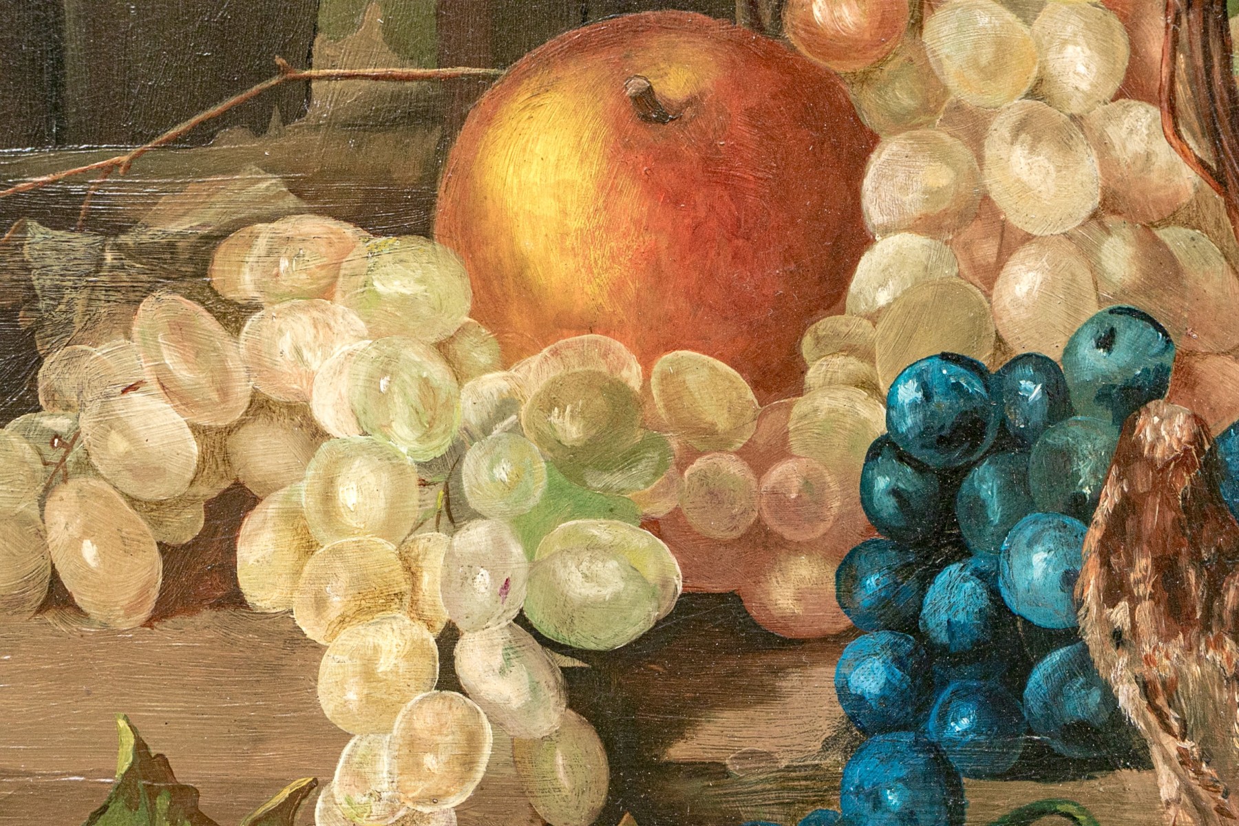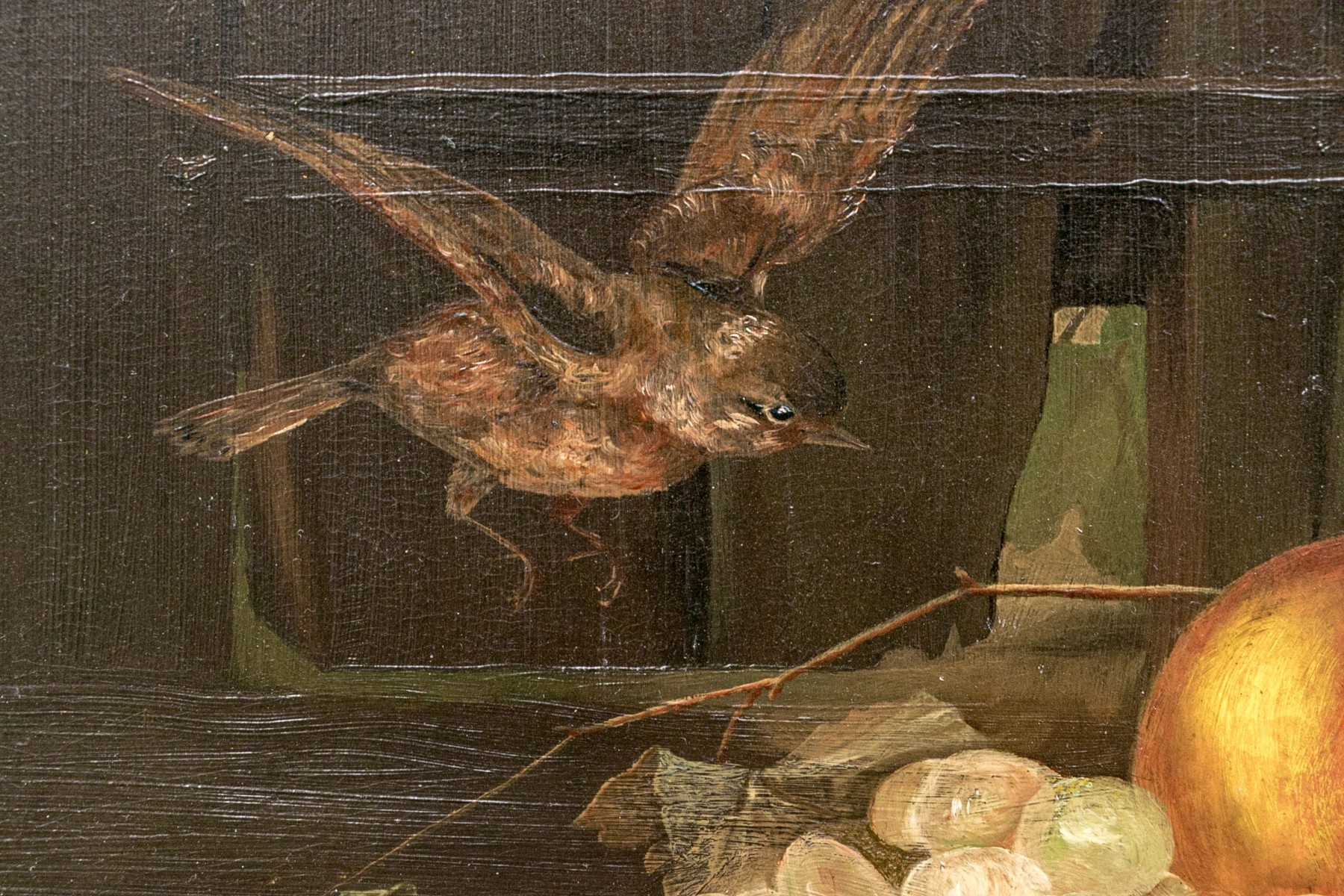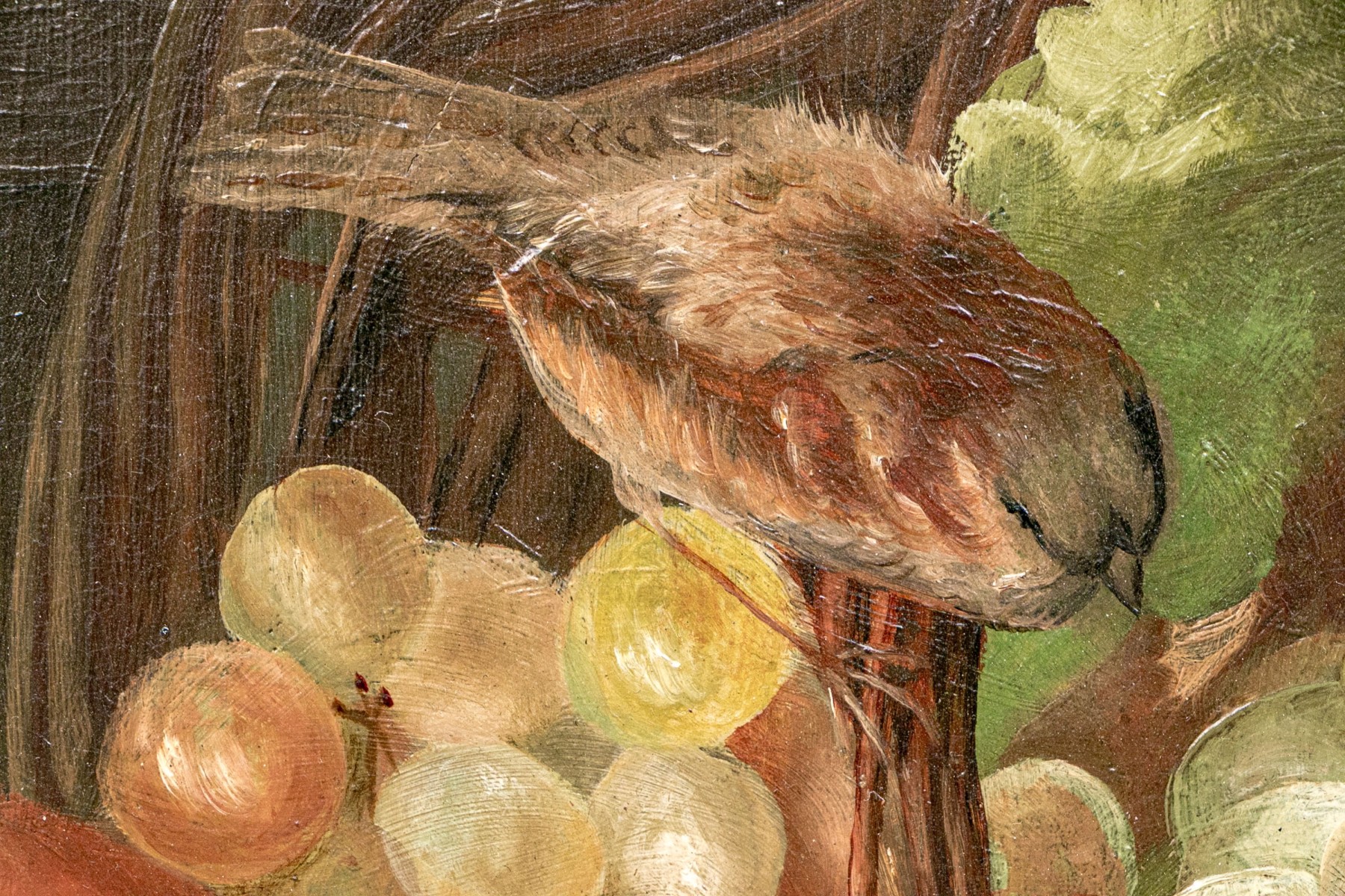 Unframed. a sweet scene with devilish sparrows flying to and eating the grapes and peach that have fallen out of a basket onto the floor. Presented in a black and gilt frame.