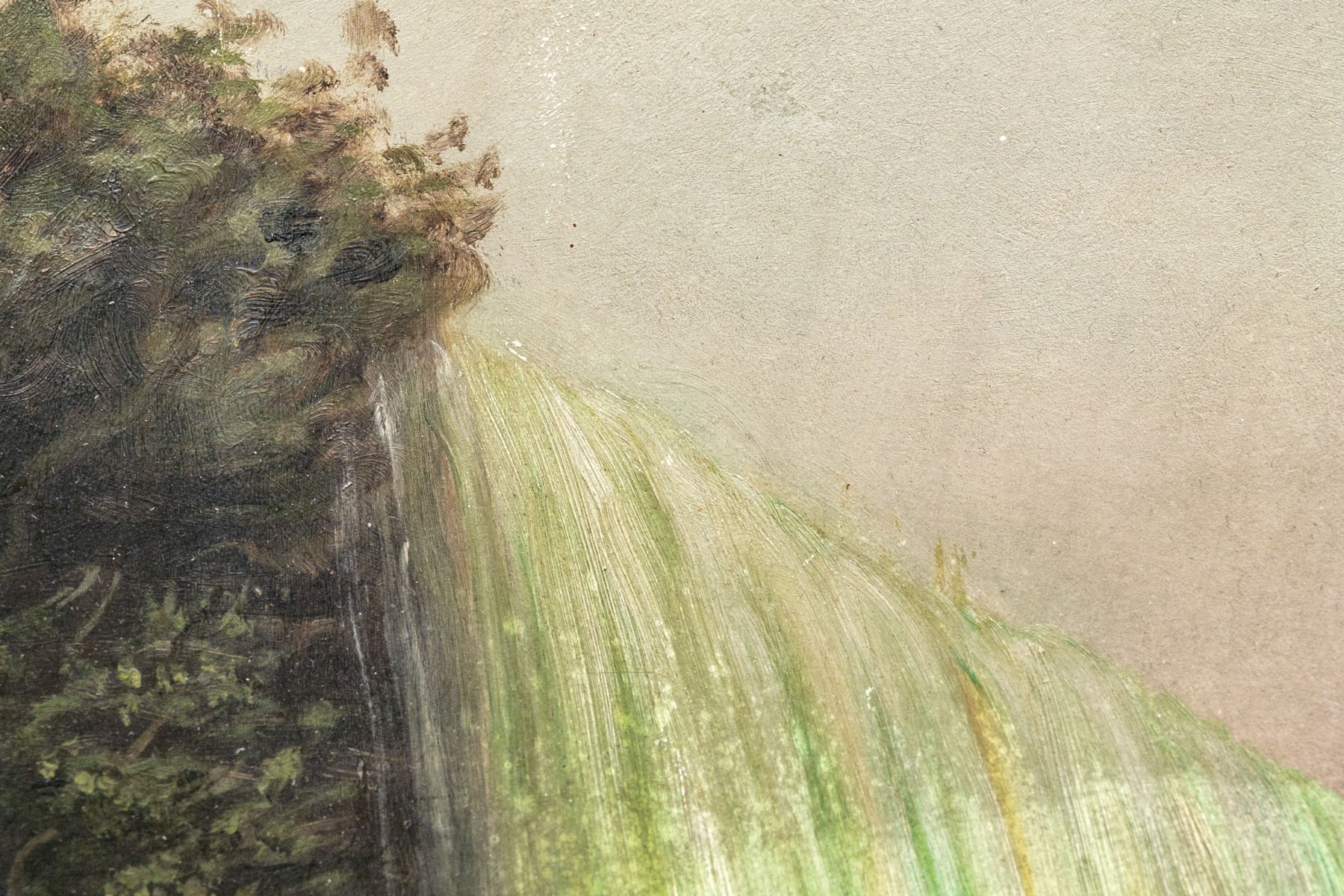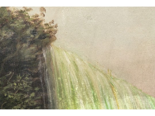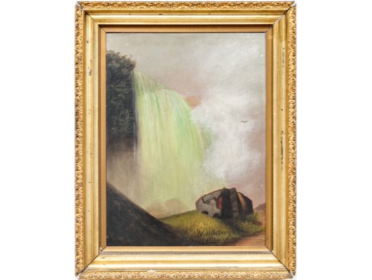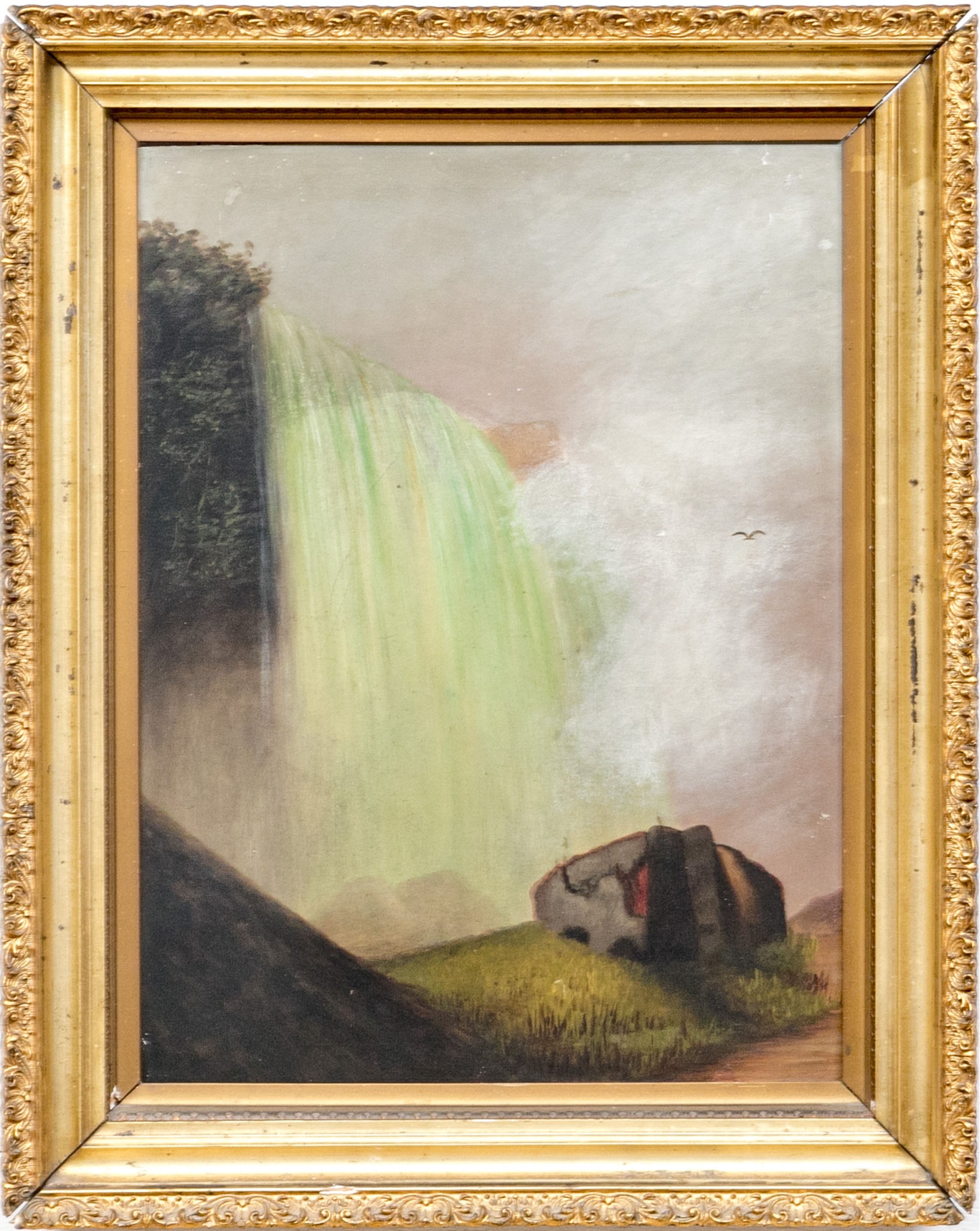 Apparently unsigned. A dark rocky landscape with a green white waterfall in the mist under gray skies. A hut is on the grassy shore with a fire lit inside. Presented in a fine gilt frame.