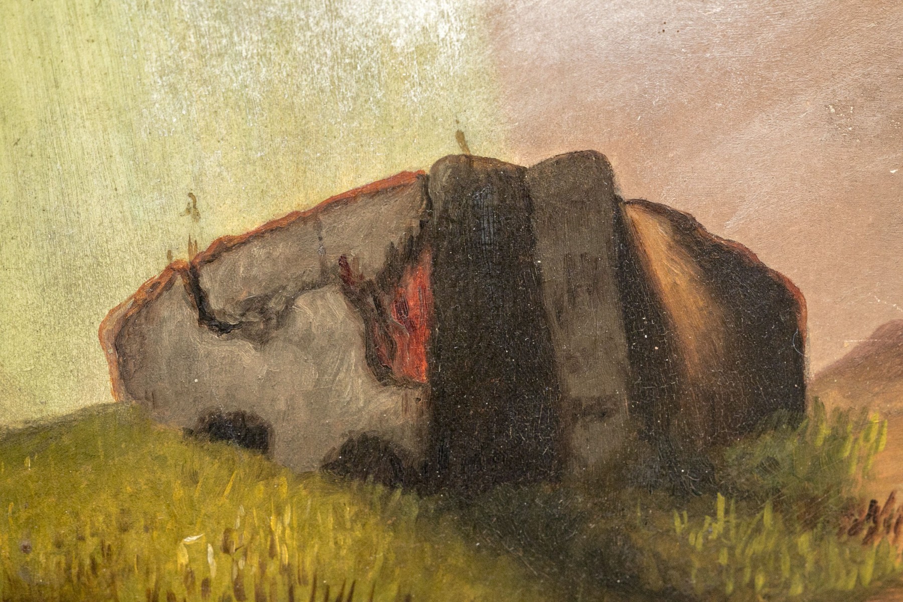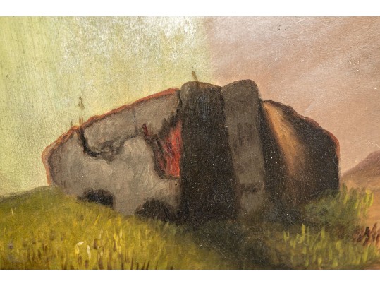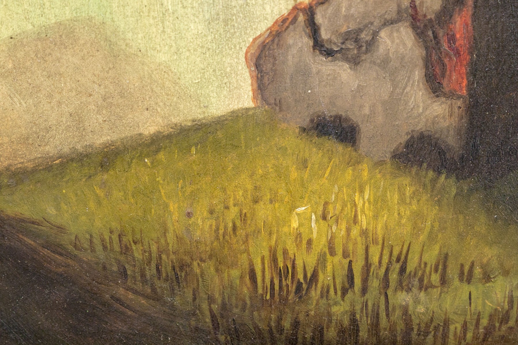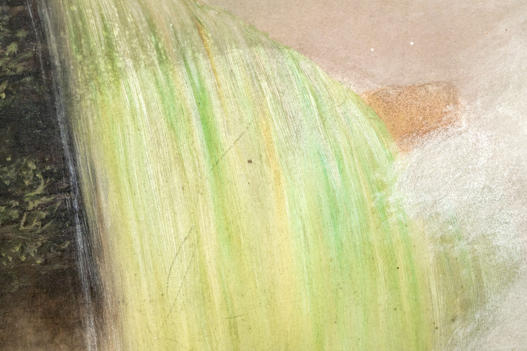 Apparently unsigned. A dark rocky landscape with a green white waterfall in the mist under gray skies. A hut is on the grassy shore with a fire lit inside. Presented in a fine gilt frame.