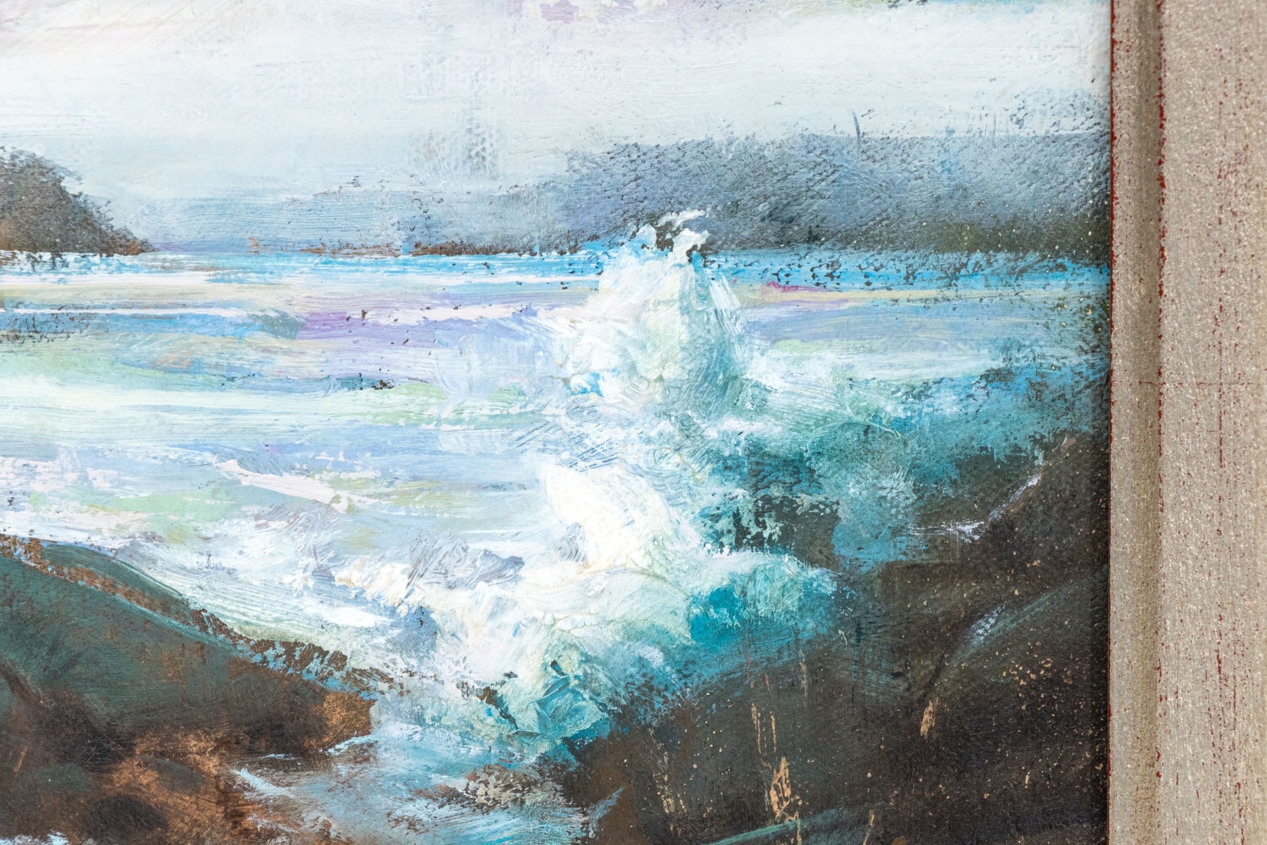 A fantastic oil on board depicting a coastal rockery landscape with waves crashing with white water appearing to spray with ferocity.