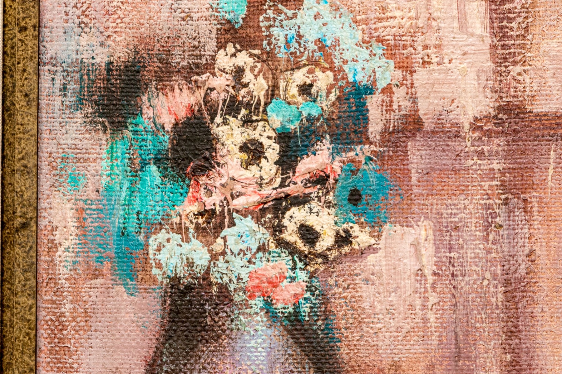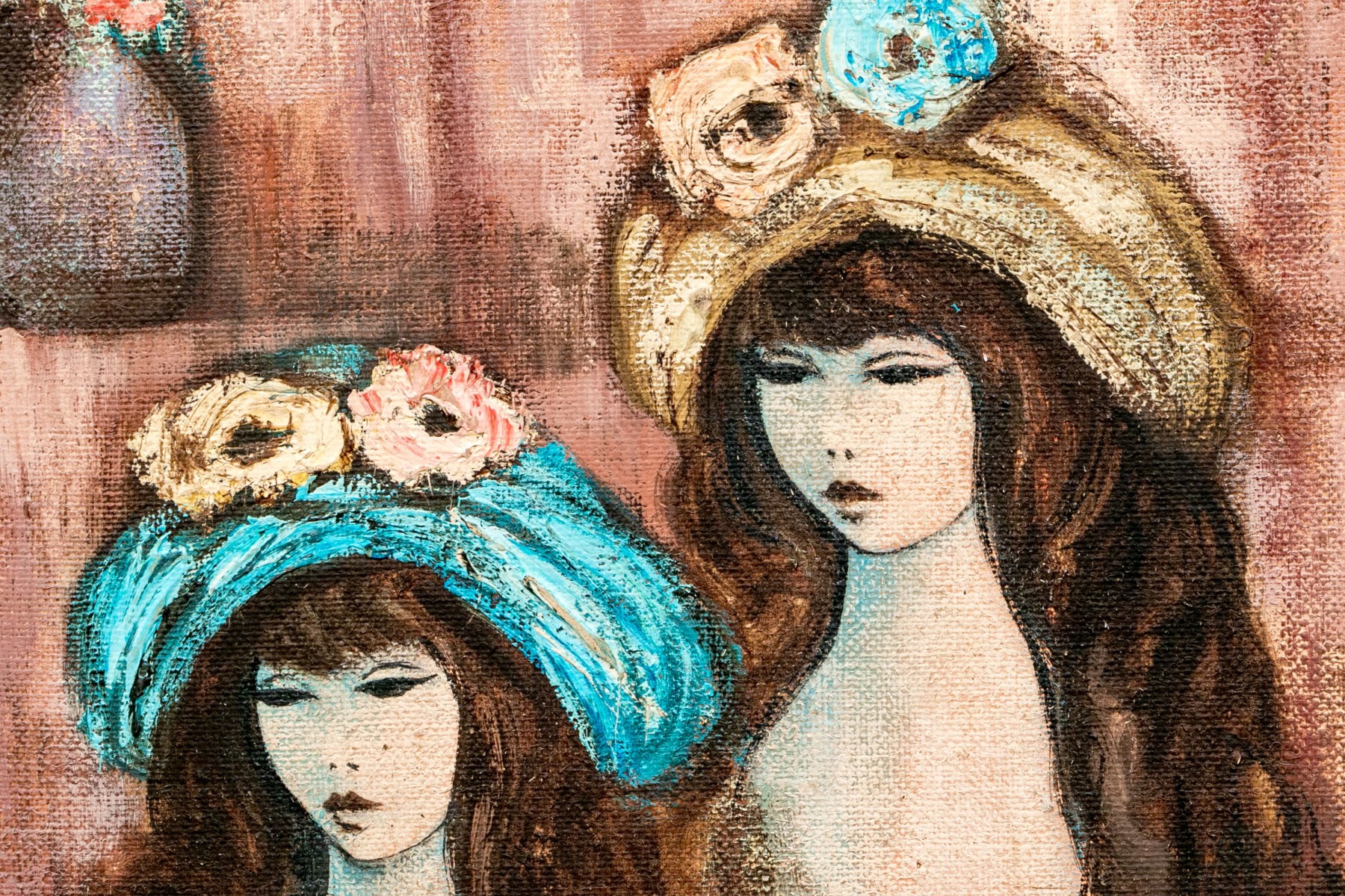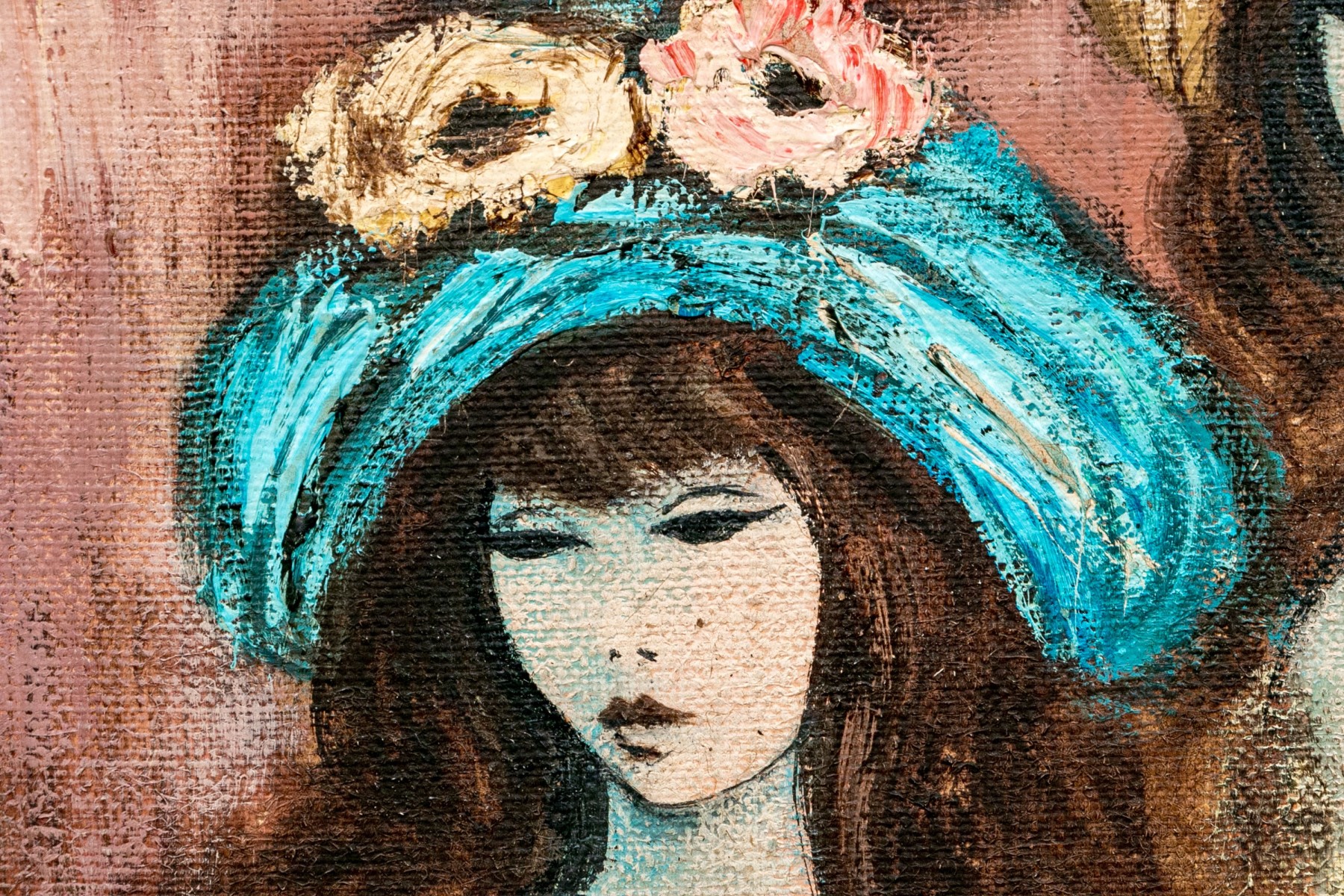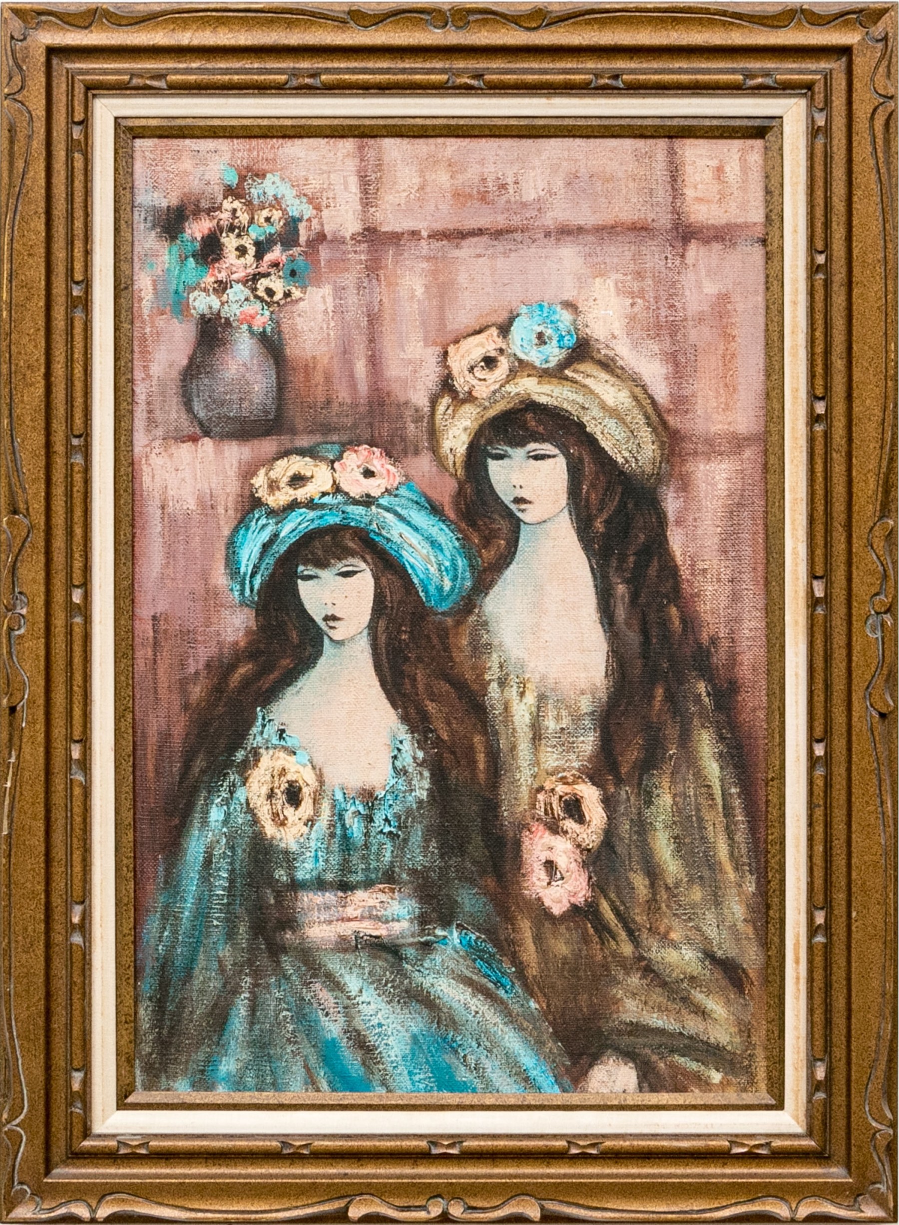 A handsomely painted oil on burlap depicting two women, with dark hair nicely dressed in gowns with hats embellished with flowers. Against a earth toned back ground with a vase with floral bouquet on a shelf in the upper left quadrant.