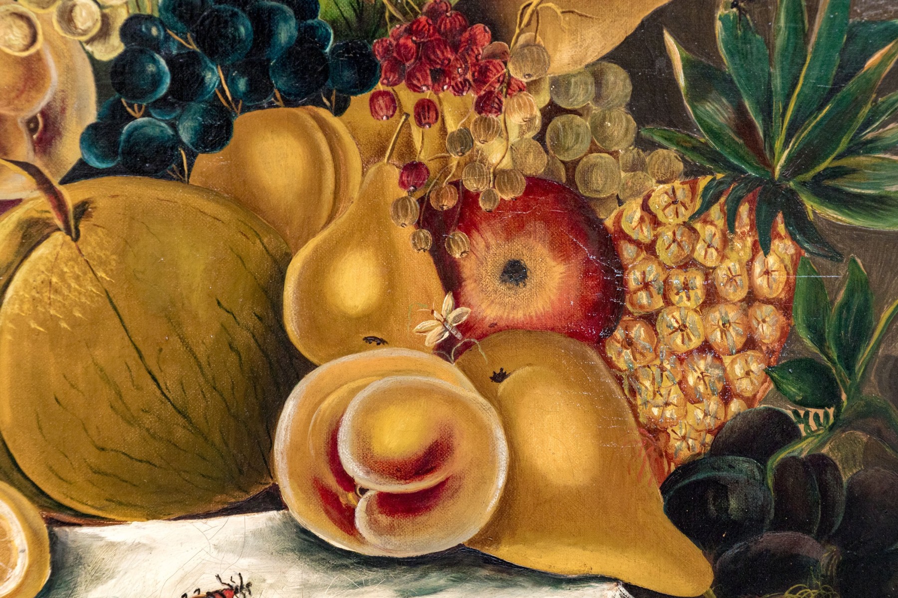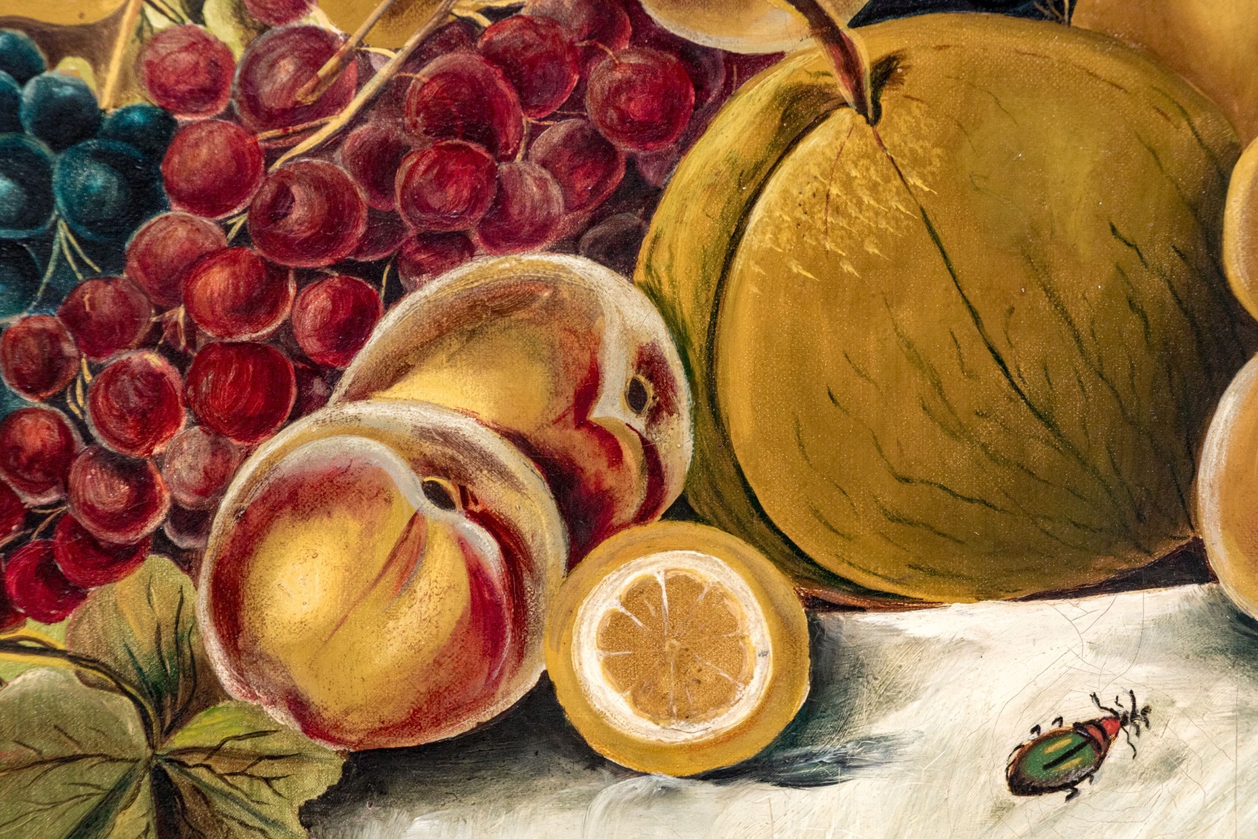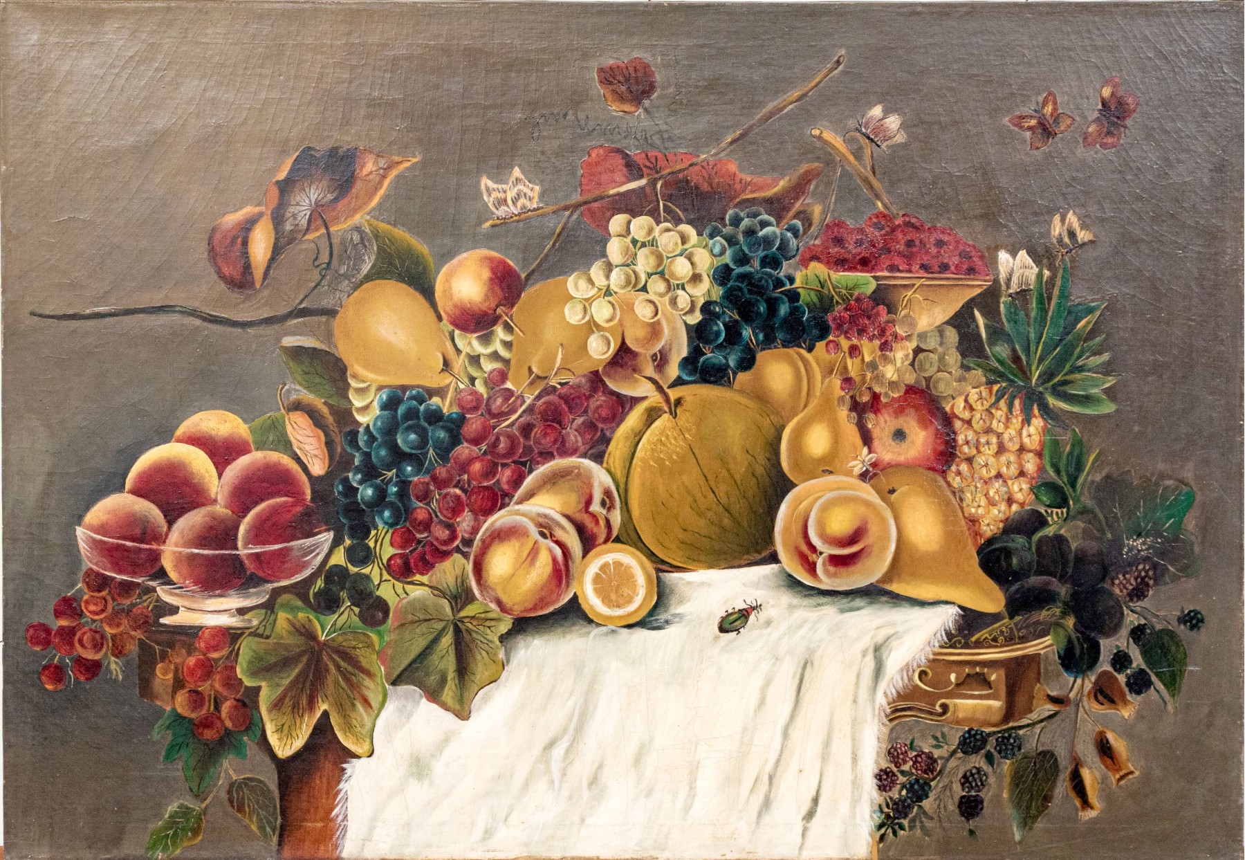 A wonderfully rendered oil painting on canvas depicting a still life of bountiful fruit spread across a table with a white tablecloth. Fruits are well detailed in vibrant color, including a glass bowl of peaches, melons, grapes, pears, lemons, pineapples, and berries; accented with a beetle on the tablecloth and two butterflies flying overhead against a gray background. Appears to be unsigned. The canvas is mounted to a stretcher, unframed.