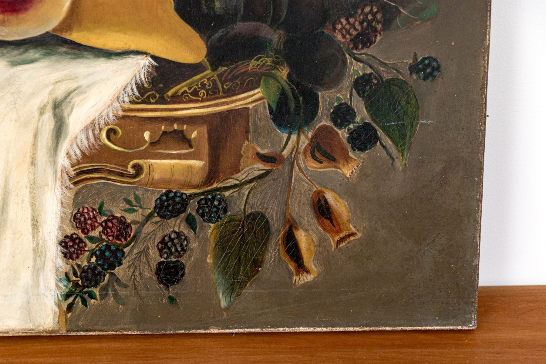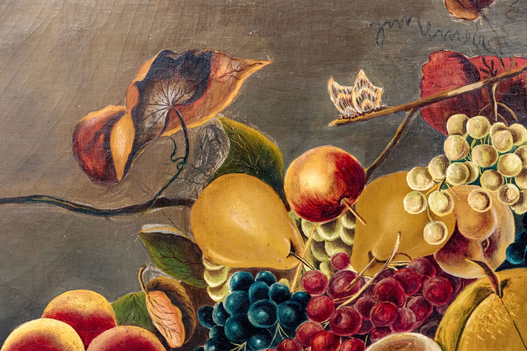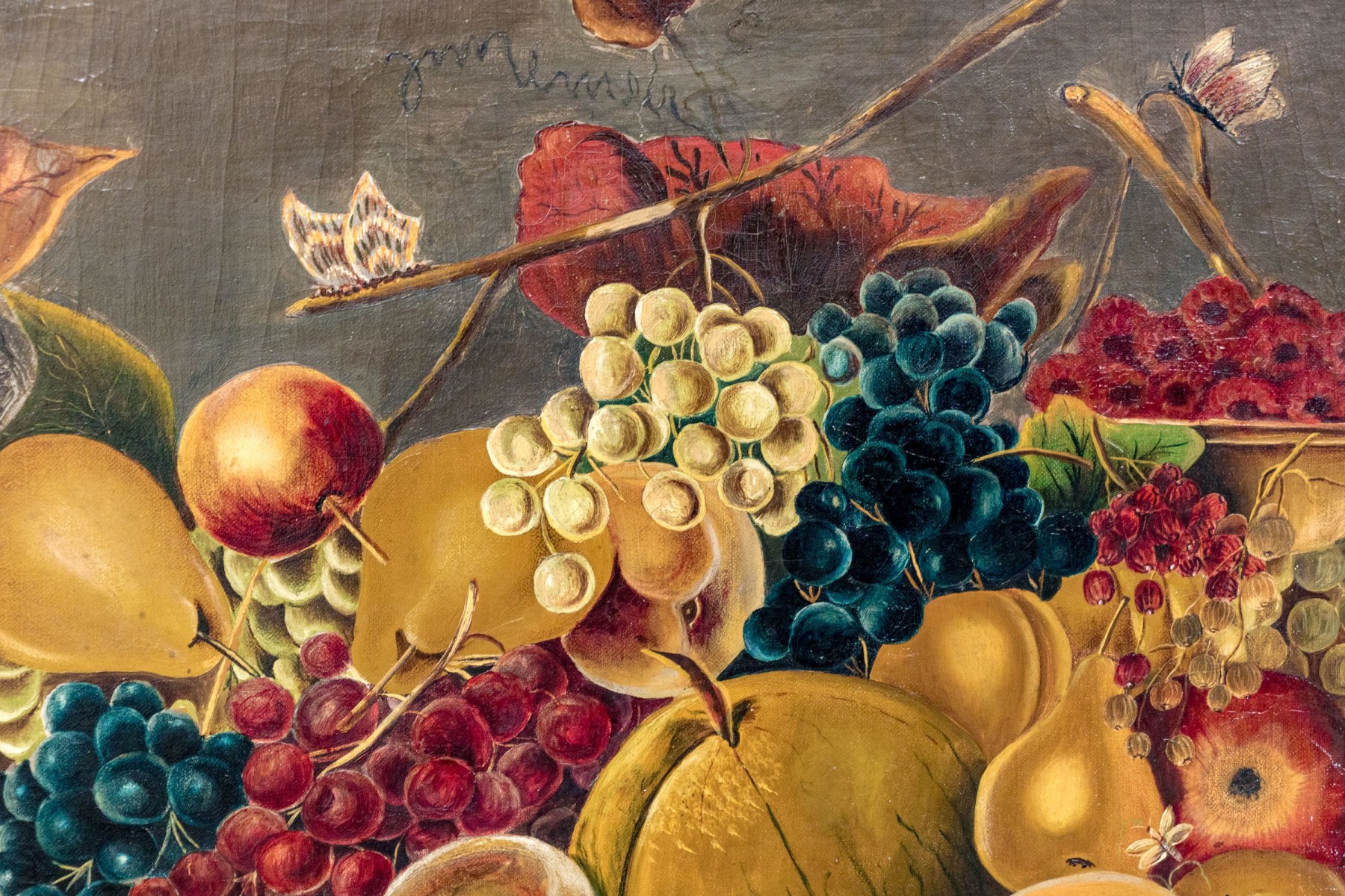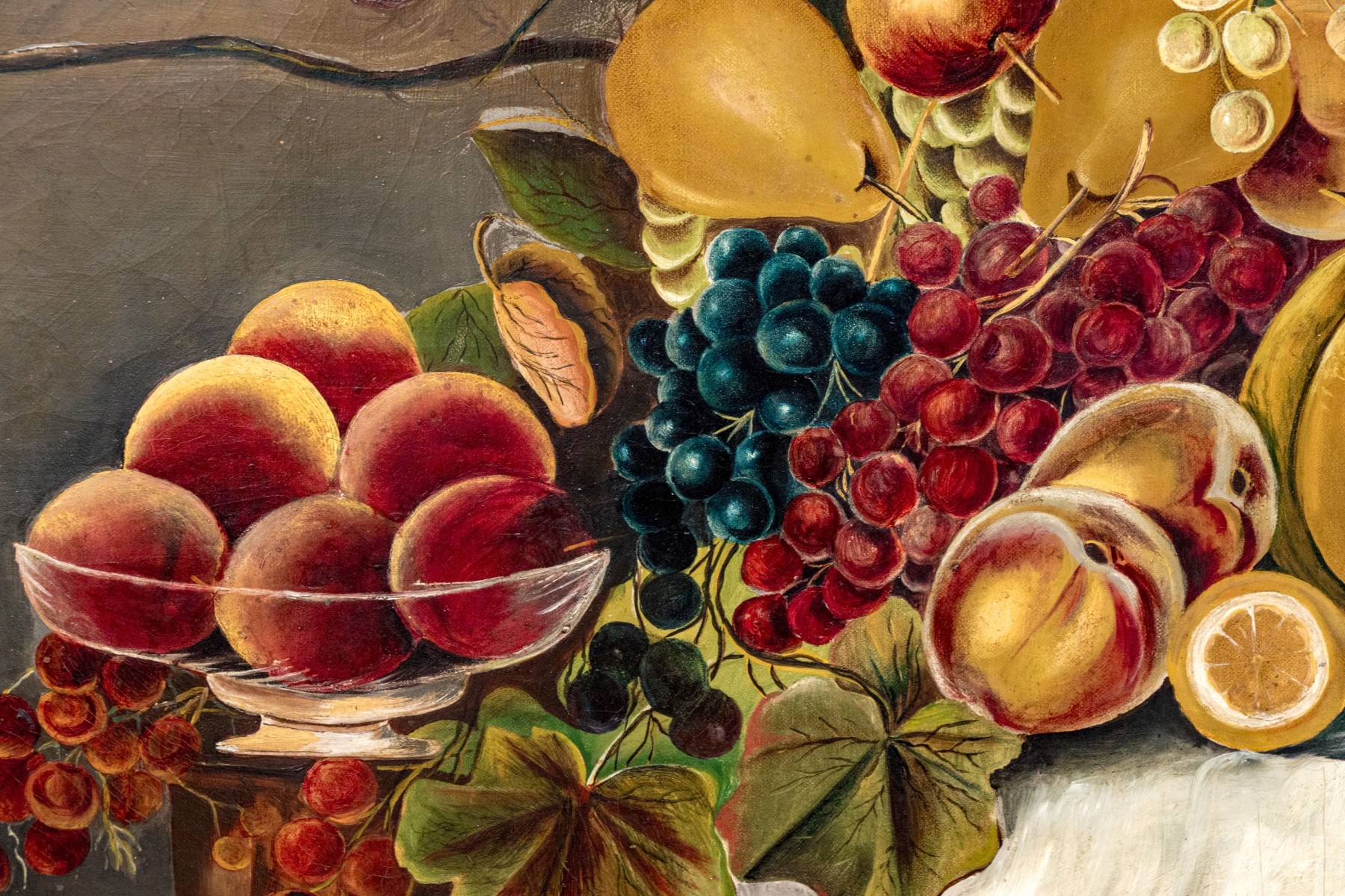 A wonderfully rendered oil painting on canvas depicting a still life of bountiful fruit spread across a table with a white tablecloth. Fruits are well detailed in vibrant color, including a glass bowl of peaches, melons, grapes, pears, lemons, pineapples, and berries; accented with a beetle on the tablecloth and two butterflies flying overhead against a gray background. Appears to be unsigned. The canvas is mounted to a stretcher, unframed.