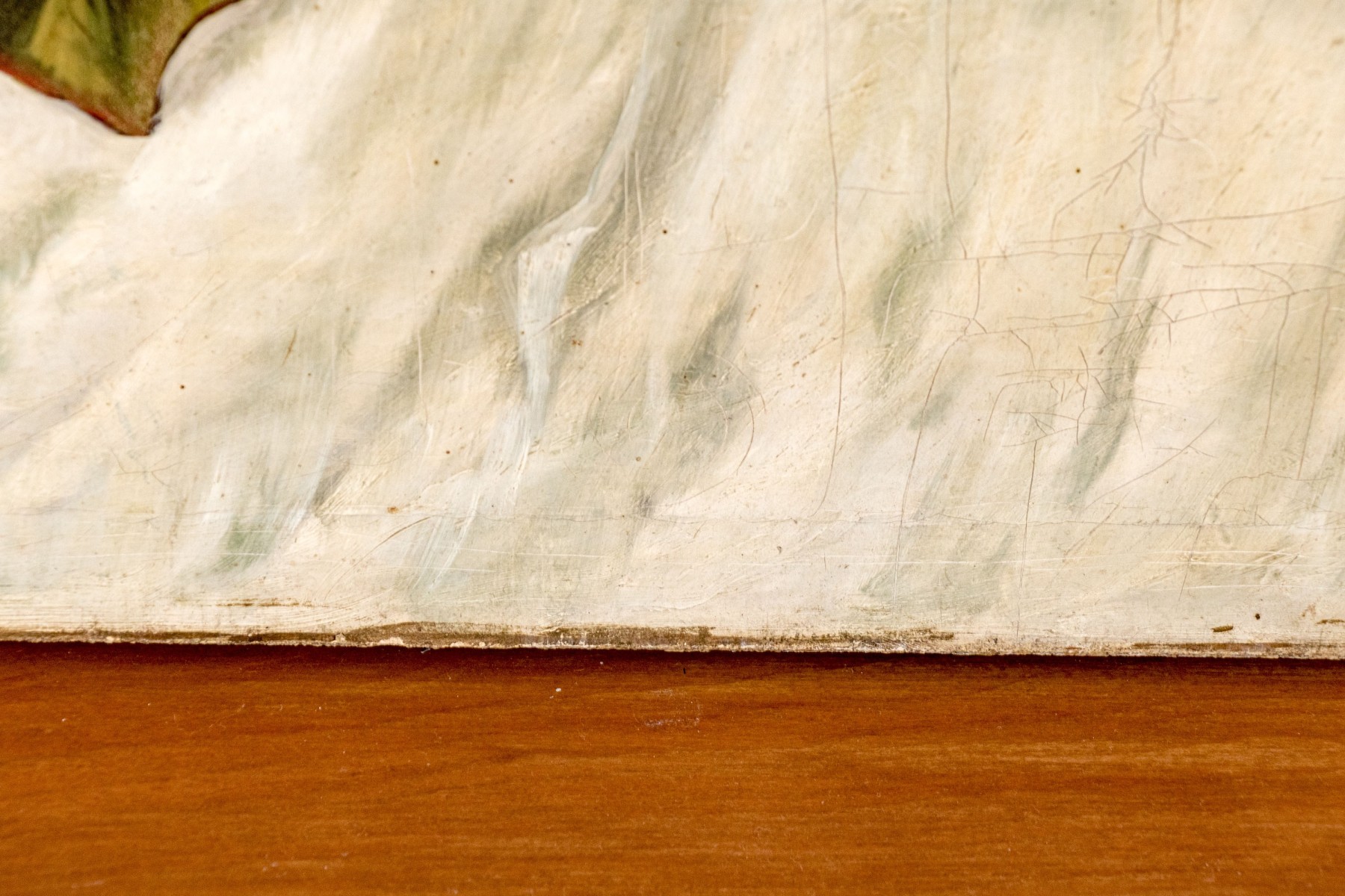 Craquelure and wear around where the canvas is pulled over the stretcher, but still presents well overall.