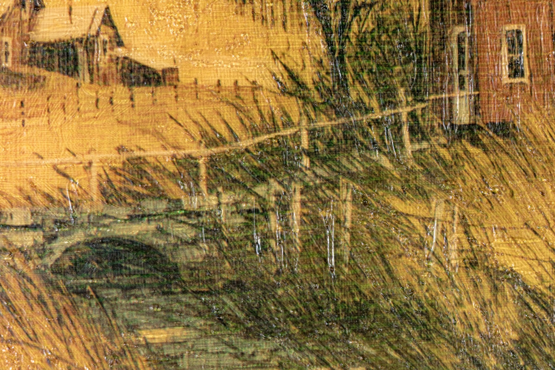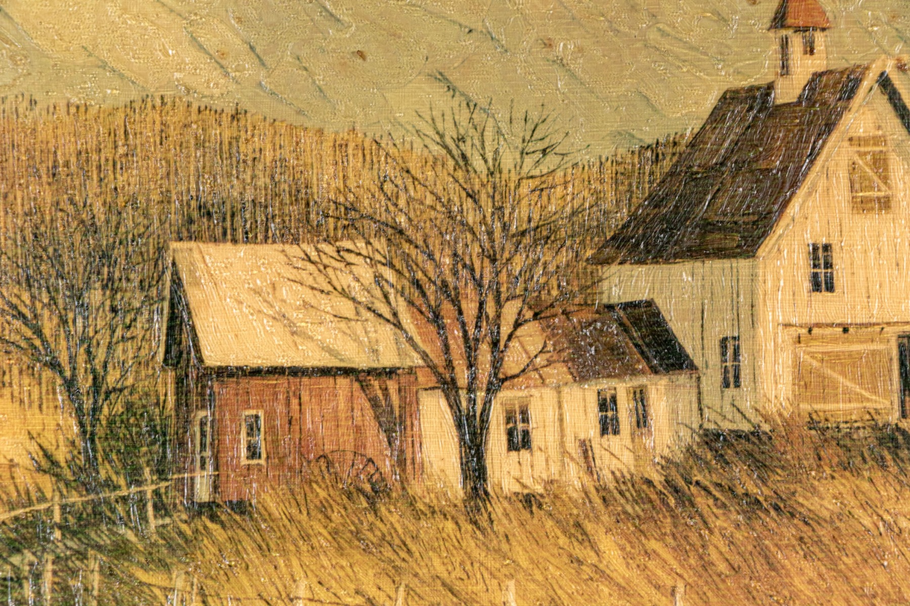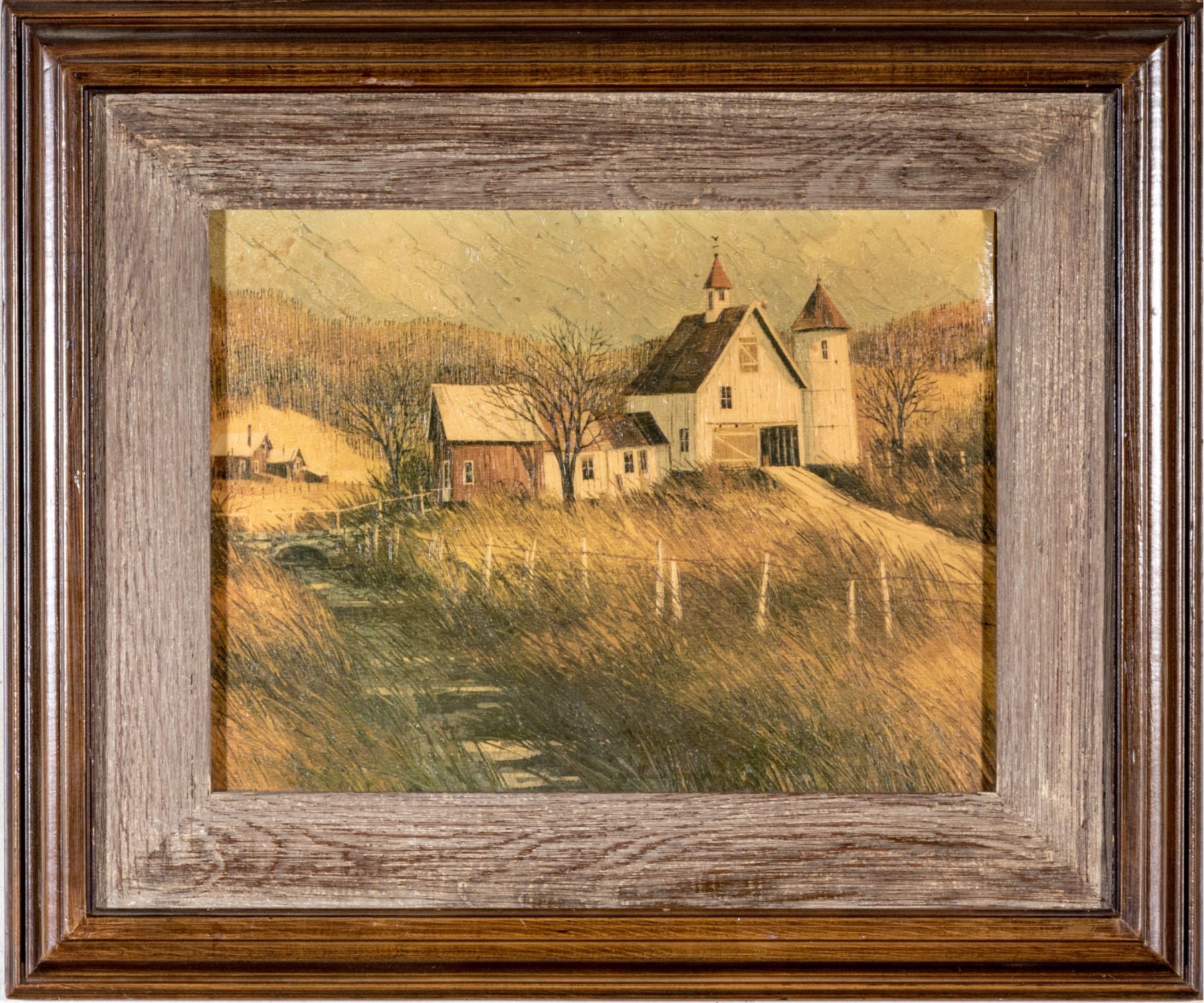 Apparently unsigned. A white farmstead amidst tan grasses near a bridge with a cottage in the distance in a golden landscape. Presented in a wood frame with a natural wood mat.