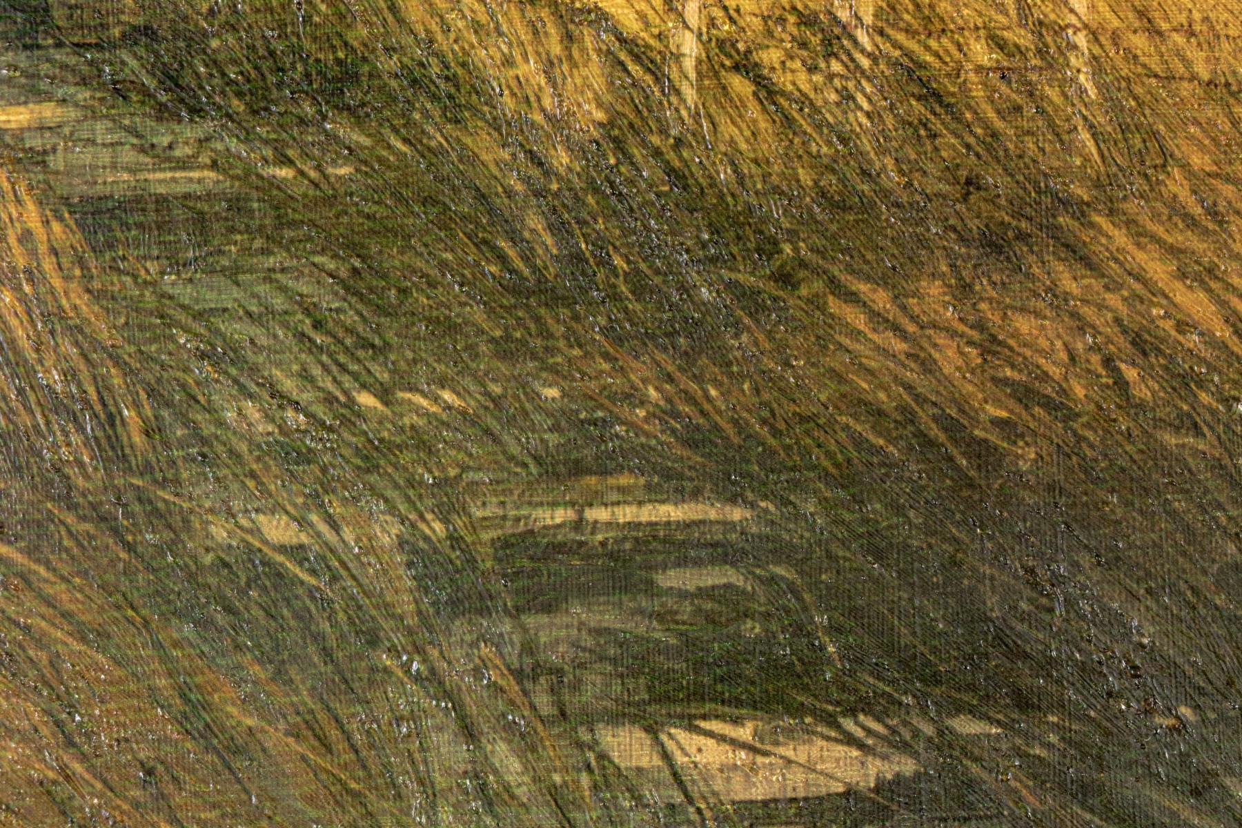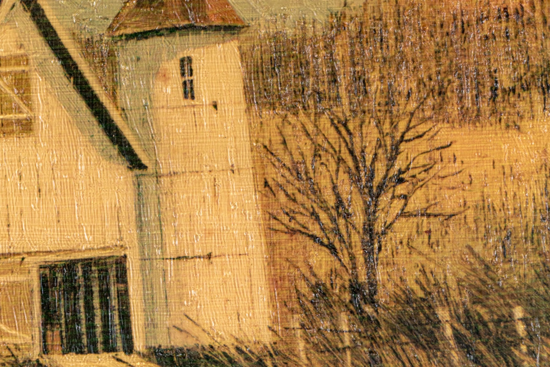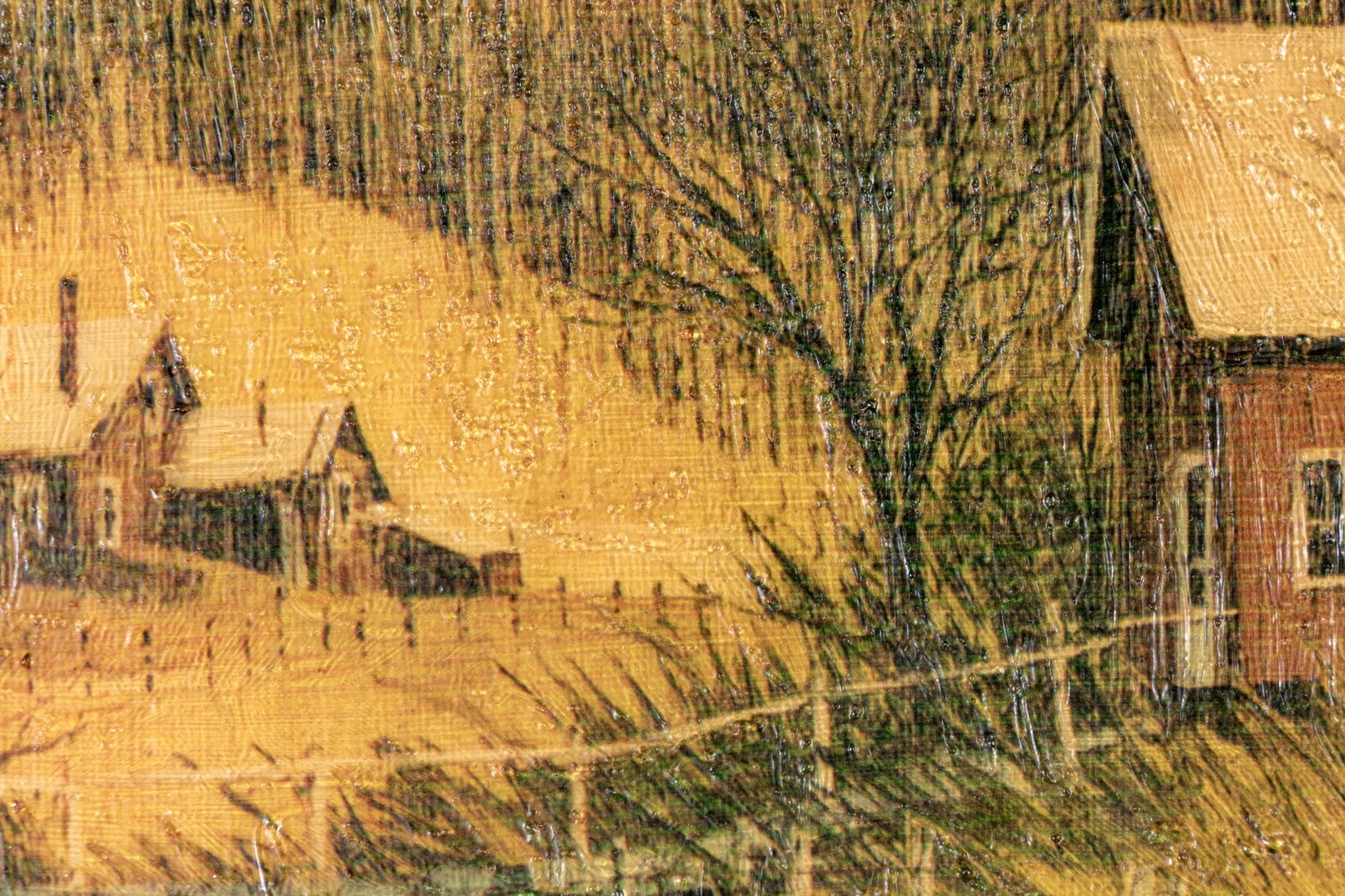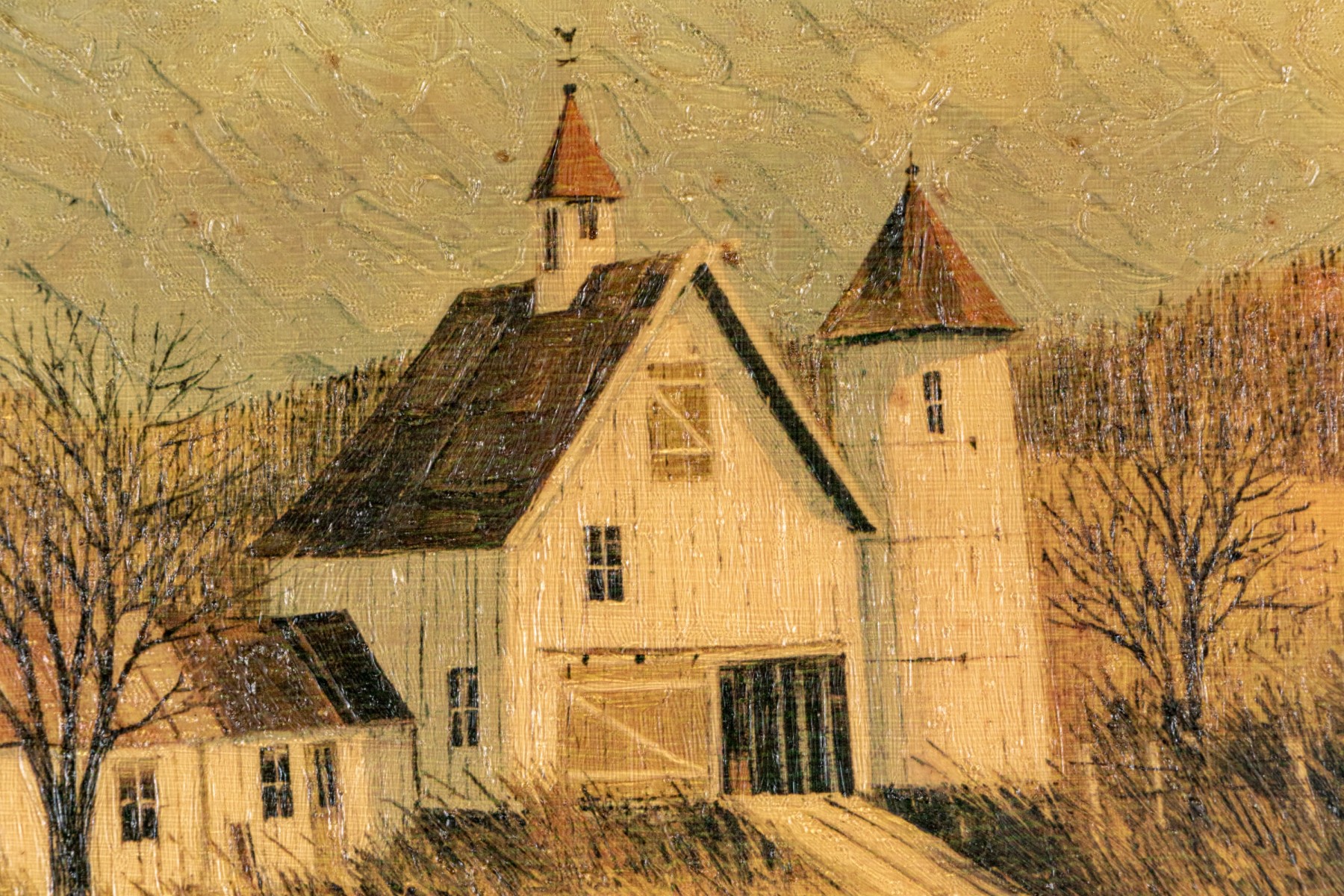 Apparently unsigned. A white farmstead amidst tan grasses near a bridge with a cottage in the distance in a golden landscape. Presented in a wood frame with a natural wood mat.