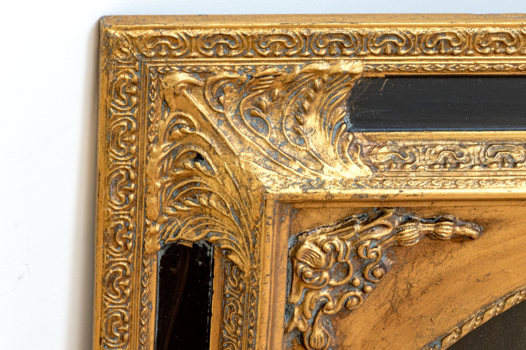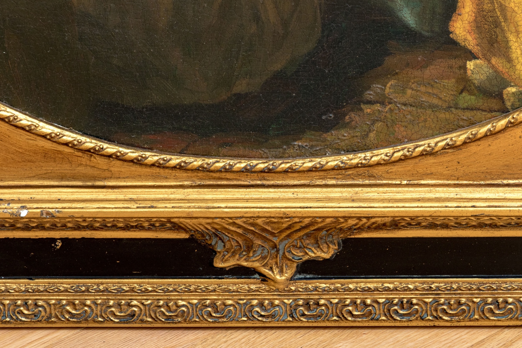 Displayed in a tondo style view within a gorgeous black and gilt finished framed carved with foliate flourishes at the corner and fine borders of relief.
