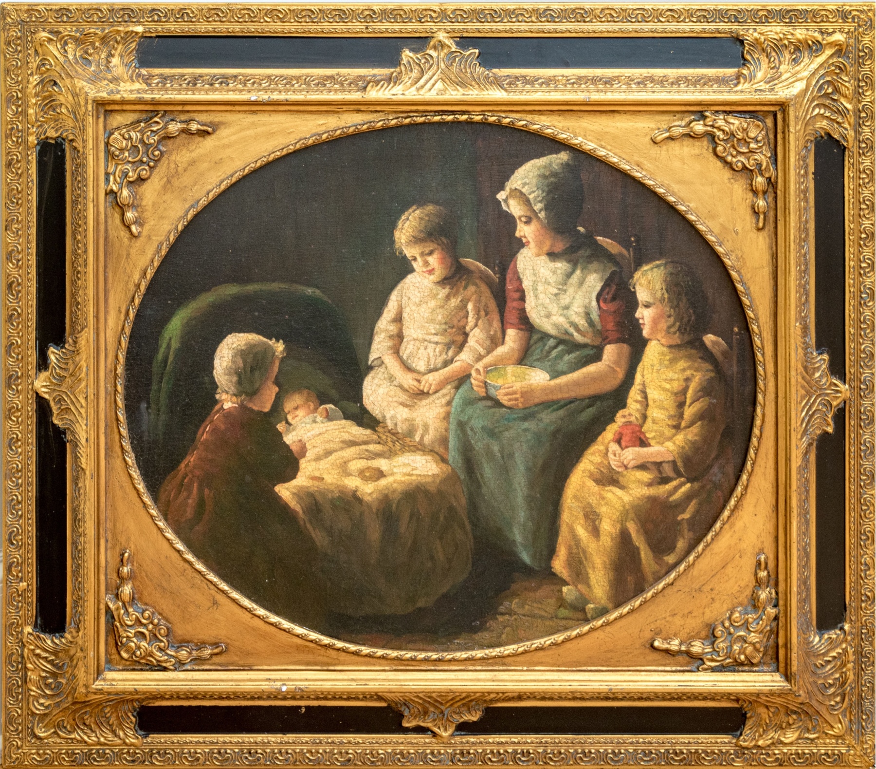 Oil On Canvas, Family Around A Cradle