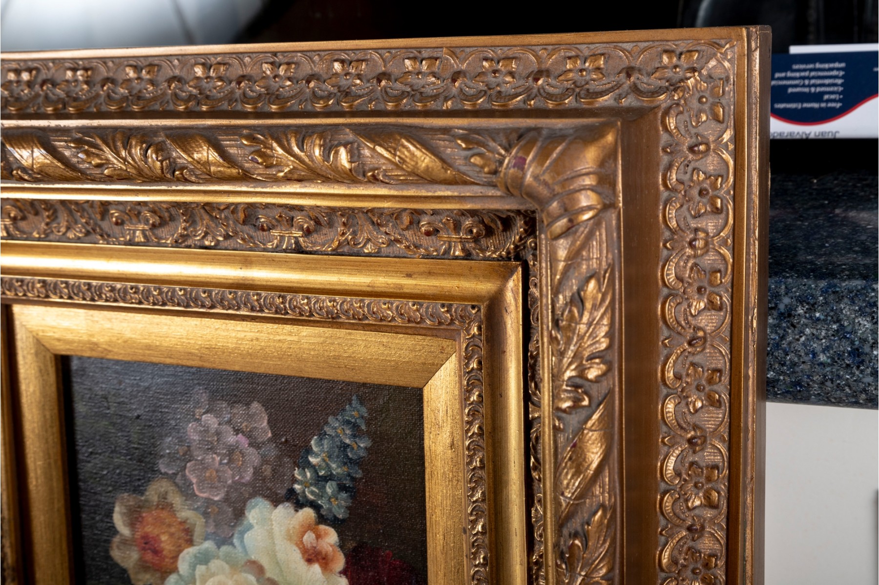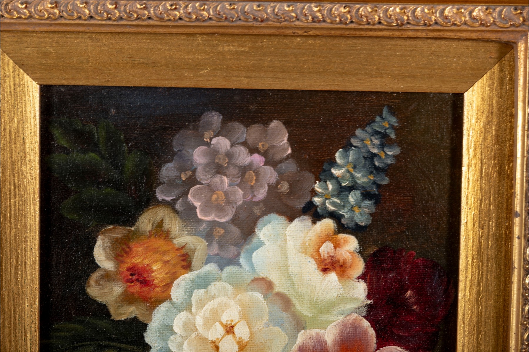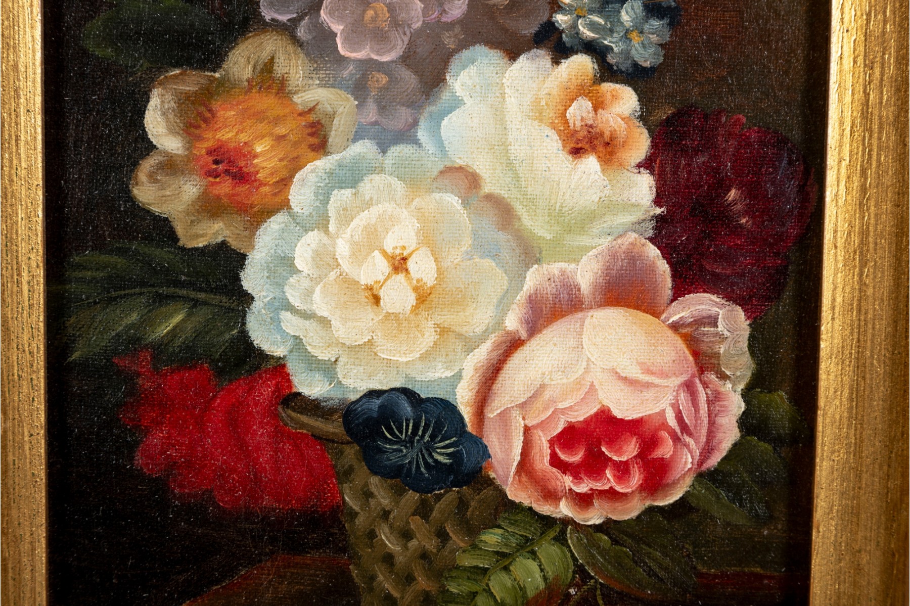 A gorgeous oil on canvas floral still-life painting, signed -- circa early 20th century. The artwork is presented openly within a heavily carved gold-tone wood frame.