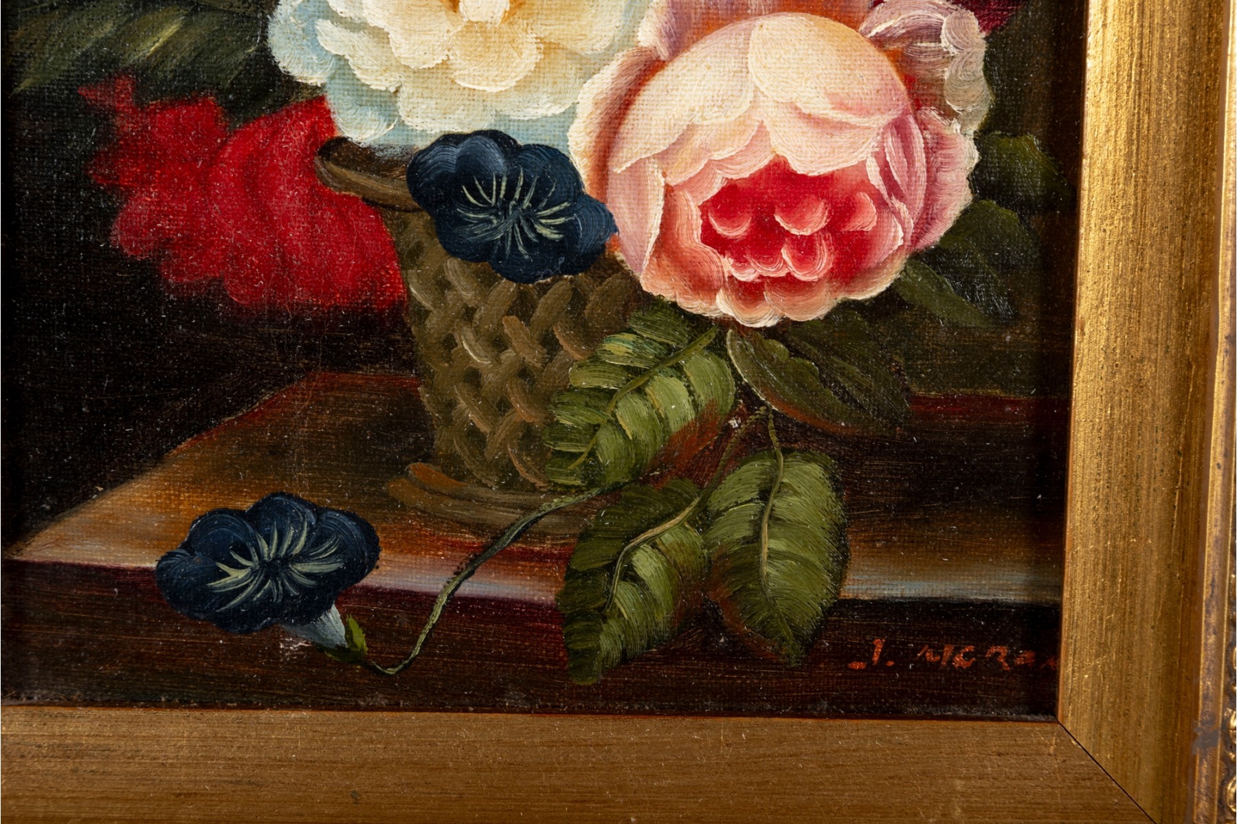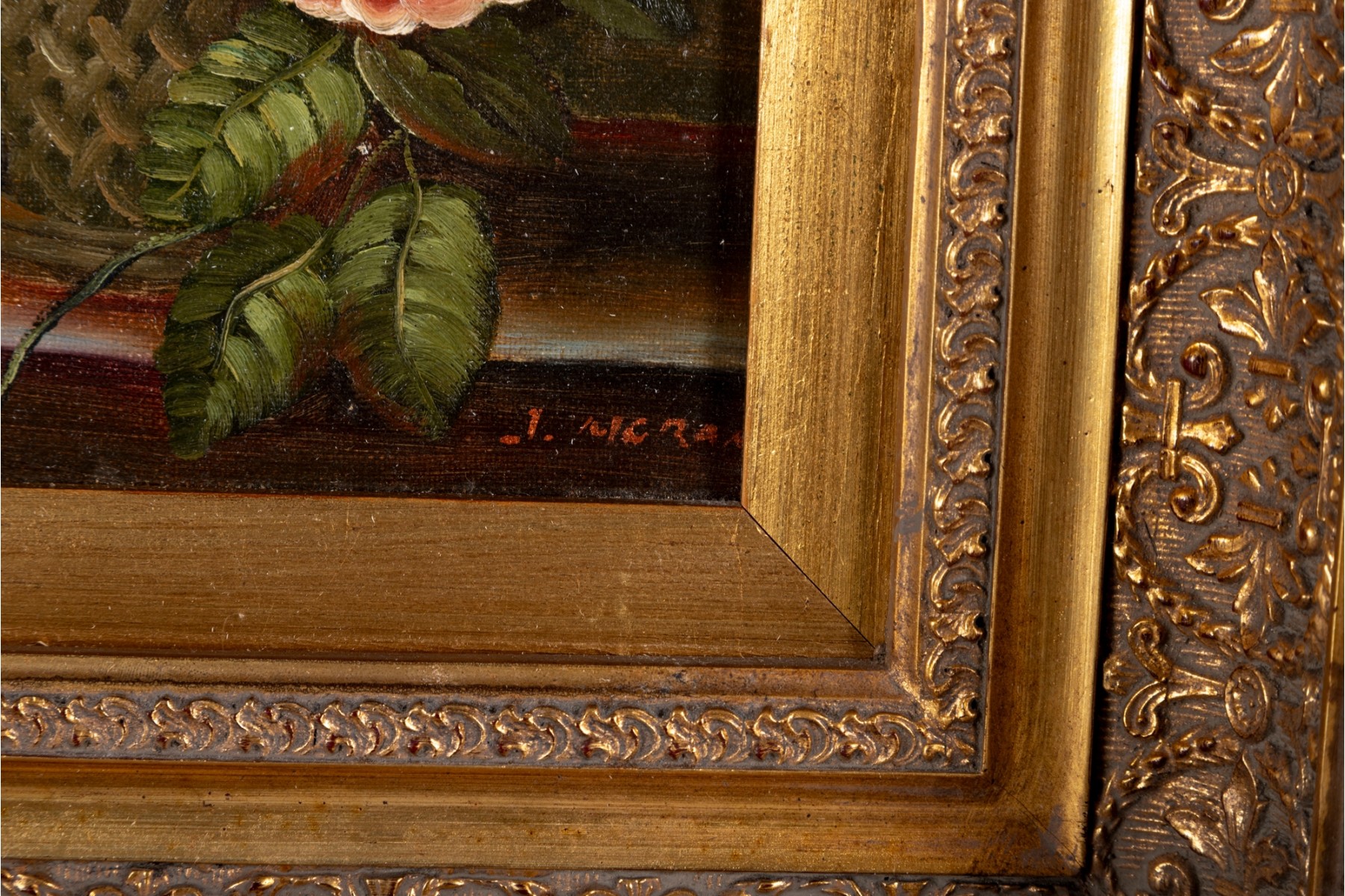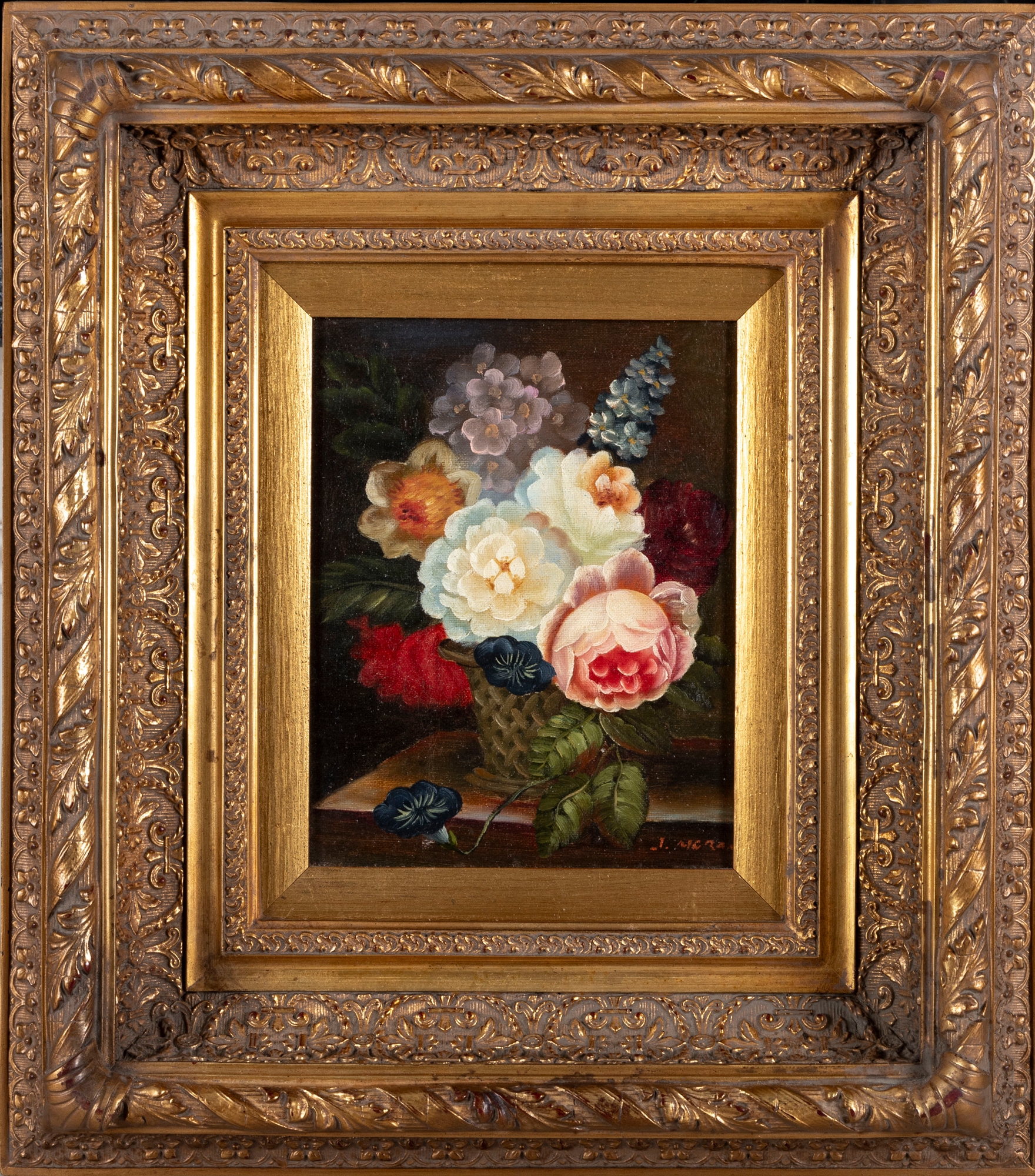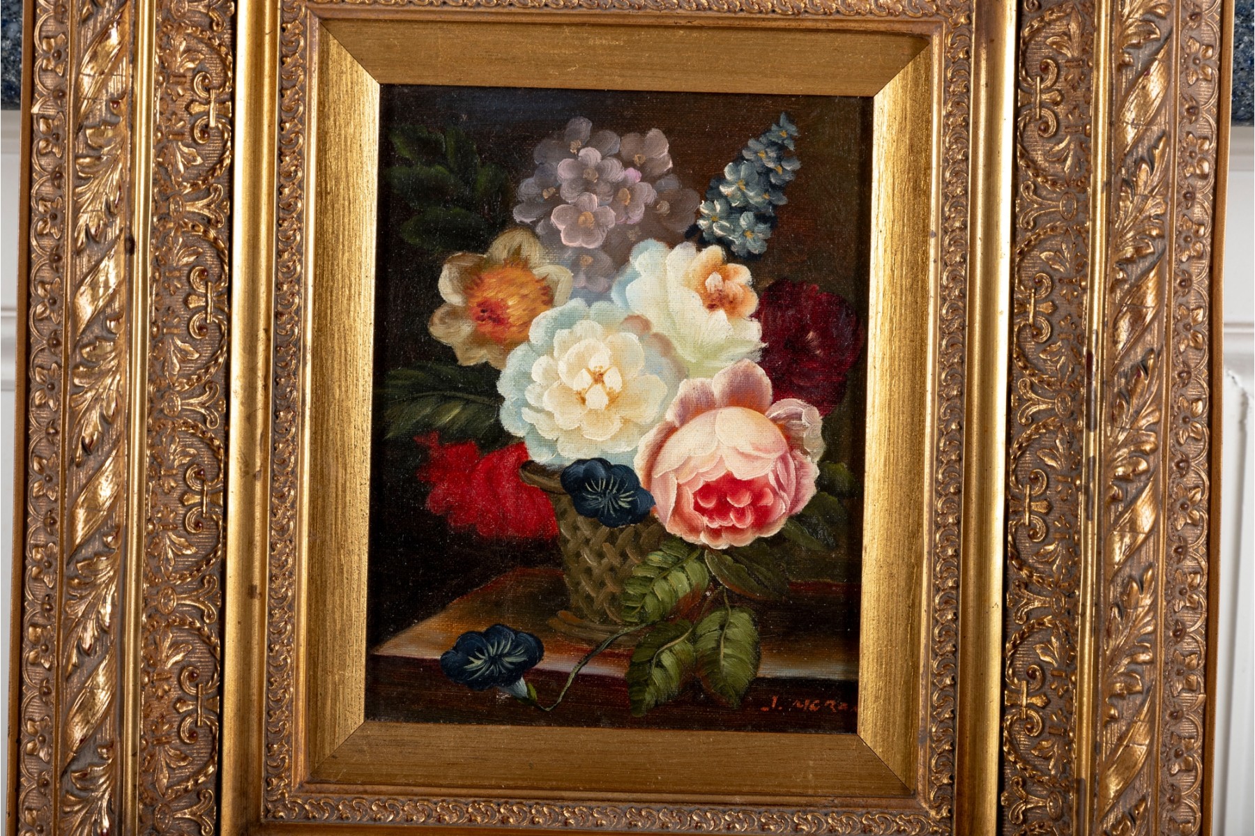 A gorgeous oil on canvas floral still-life painting, signed -- circa early 20th century. The artwork is presented openly within a heavily carved gold-tone wood frame.