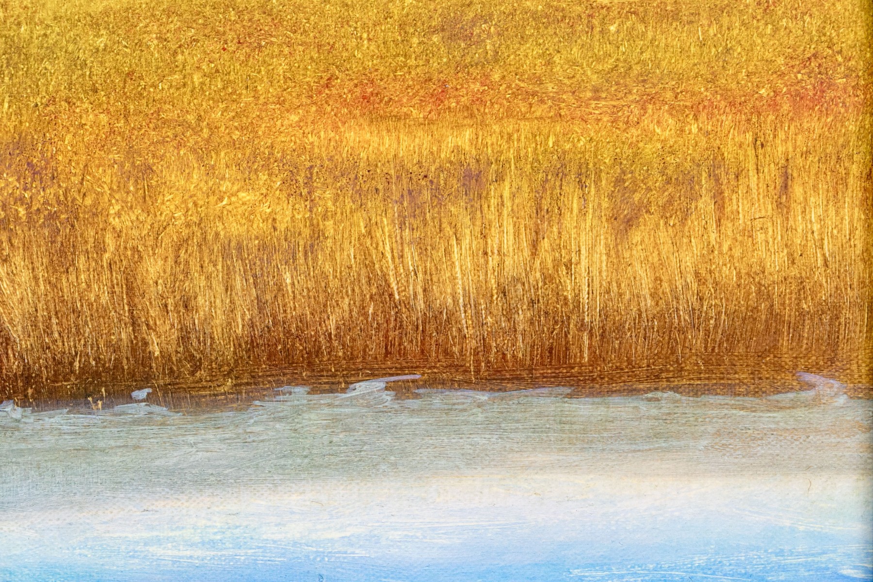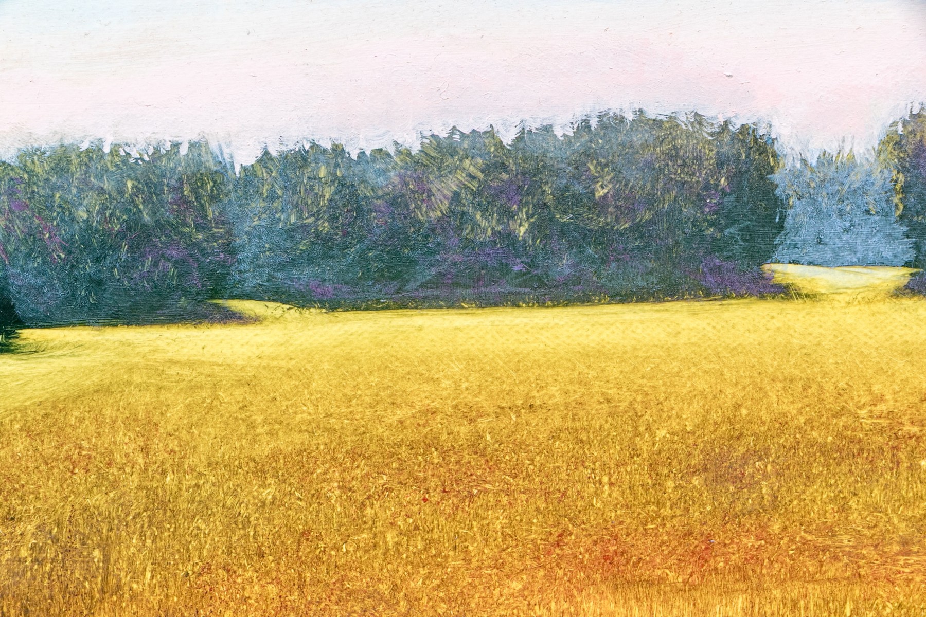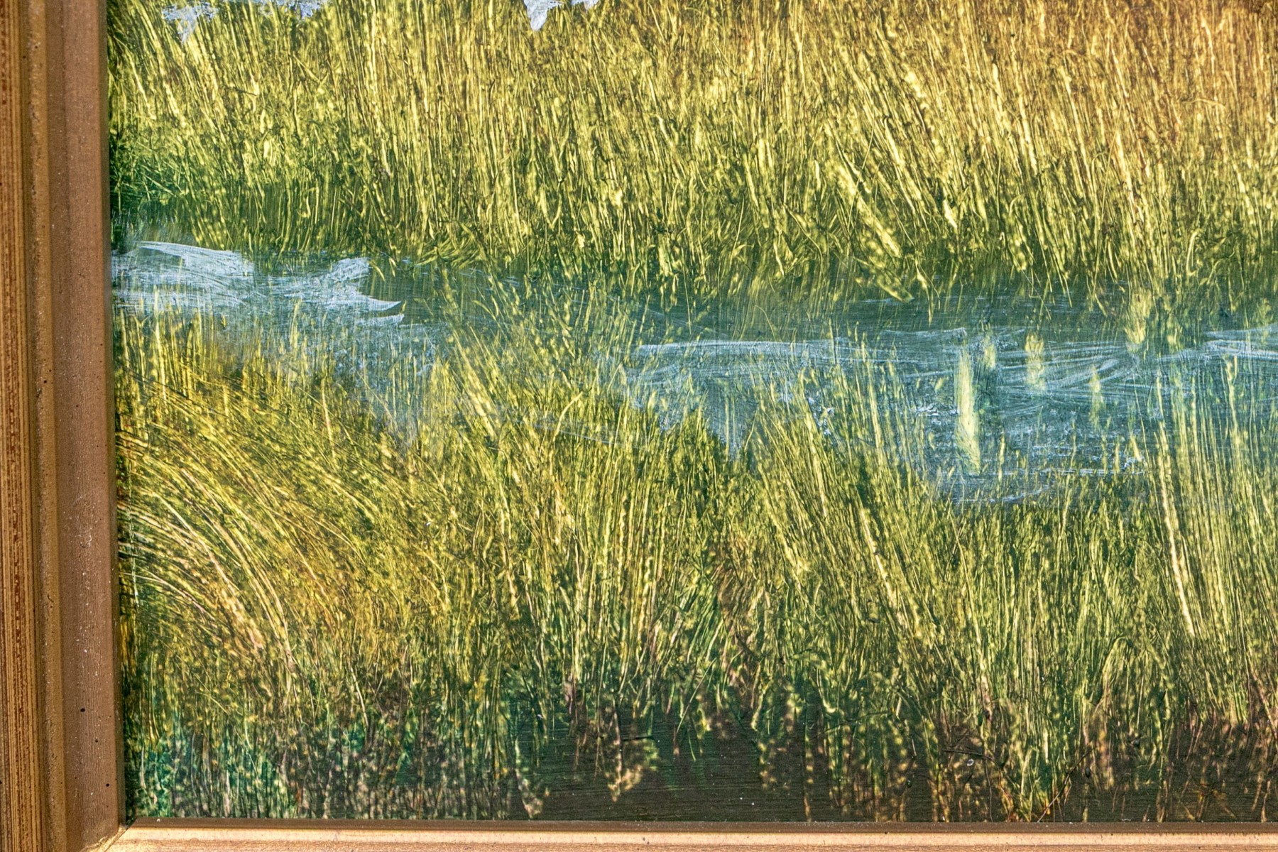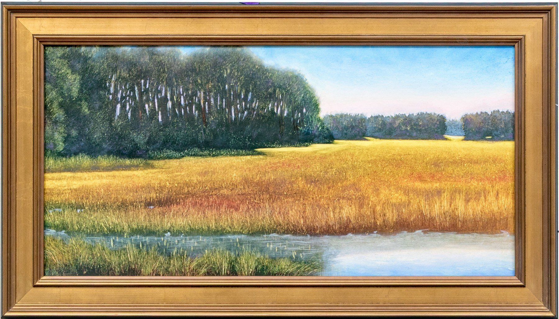 Unsigned. A bucolic landscape with a golden field on the edge of a river marsh beyond the lush green forest. Presented in a gilt frame.