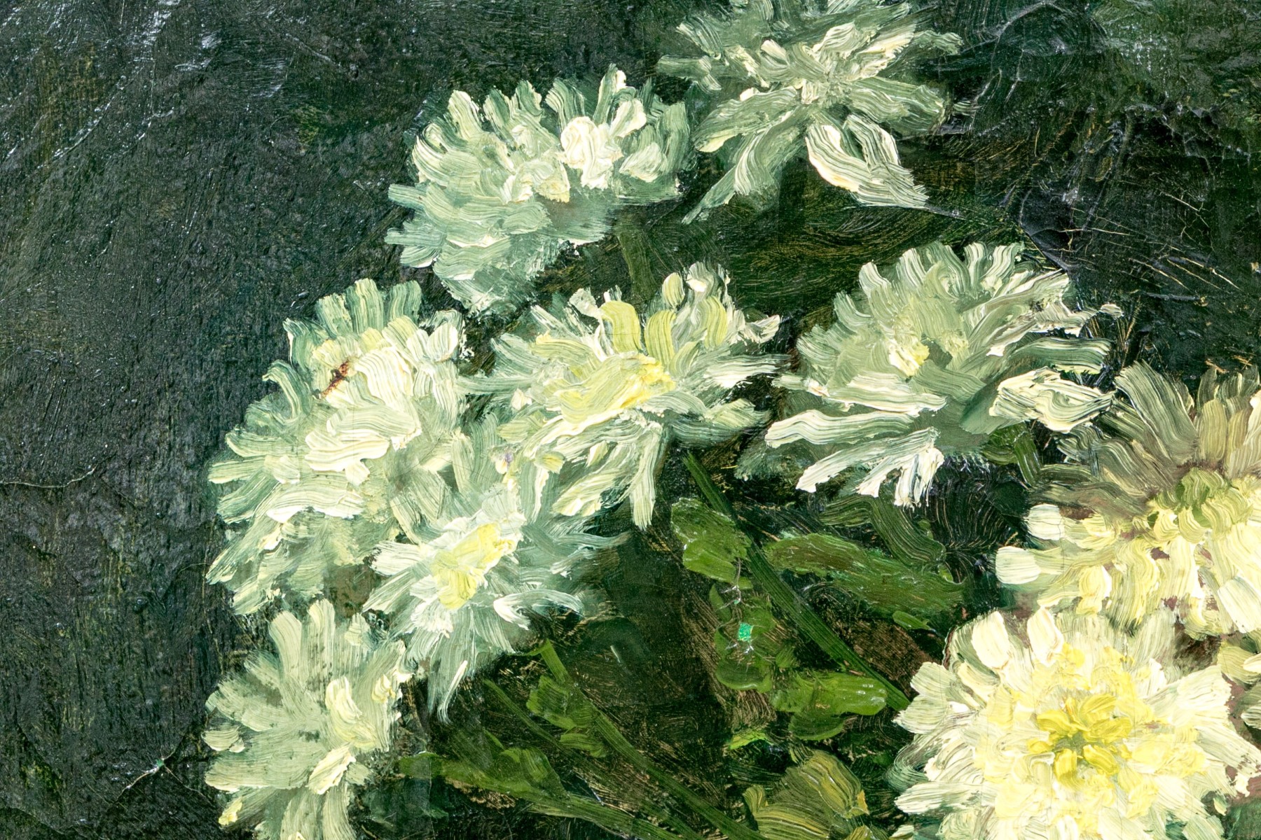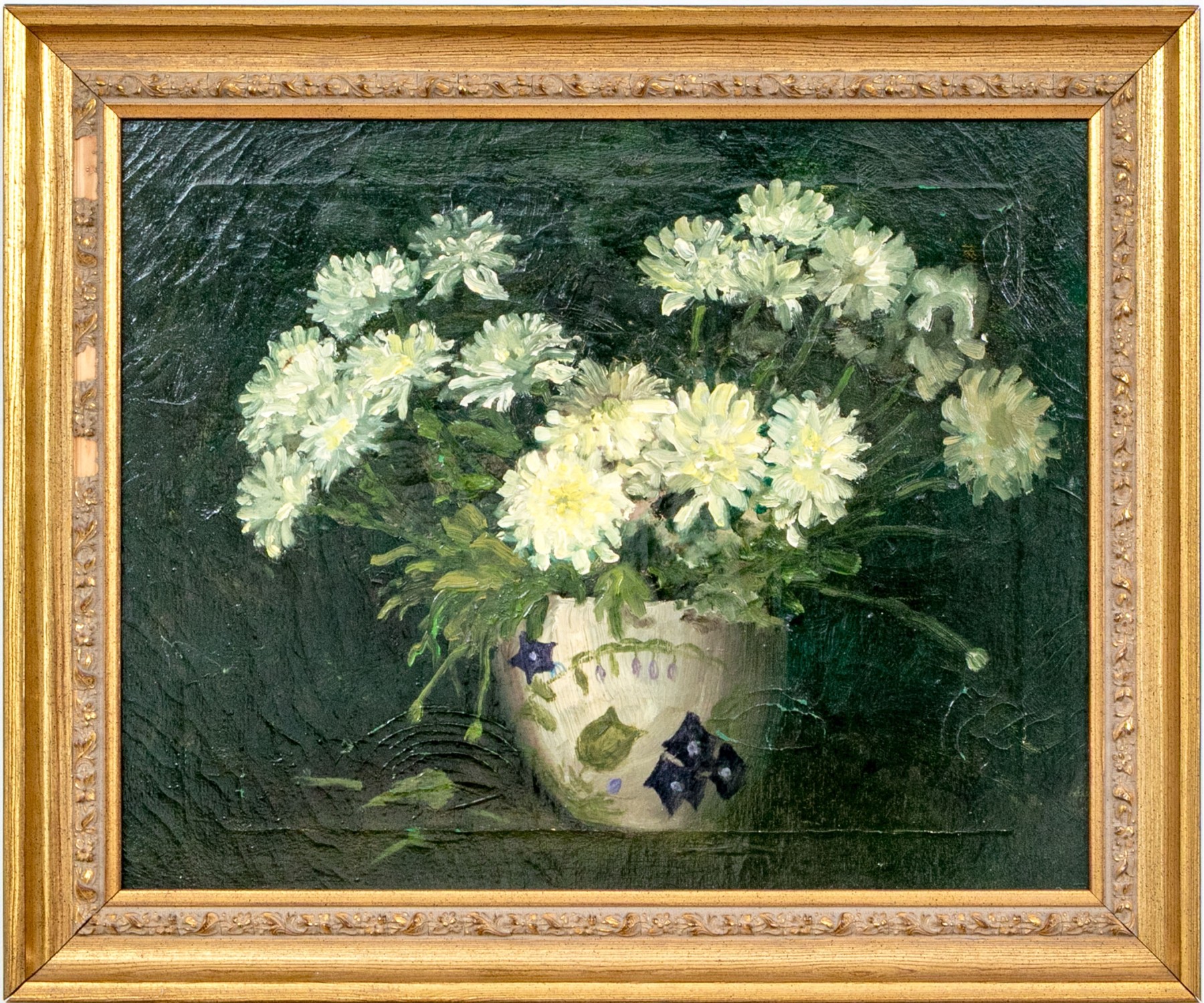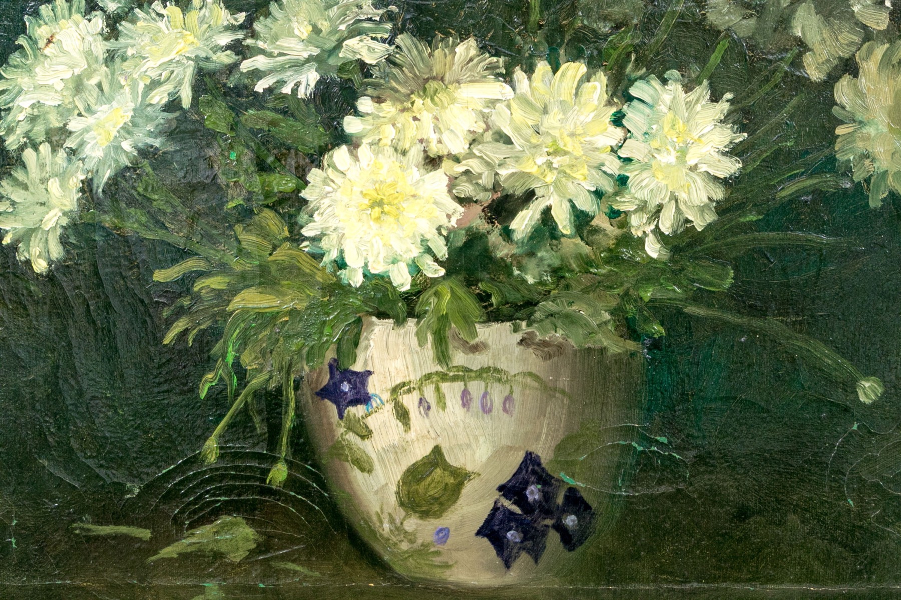 A charming antique oil painting on canvas depicting a still life of a floral arrangement with pretty white and yellow flowers on green stems emerging from a white ceramic vase decorated with indigo flowers and green stems. Appears to be unsigned.
