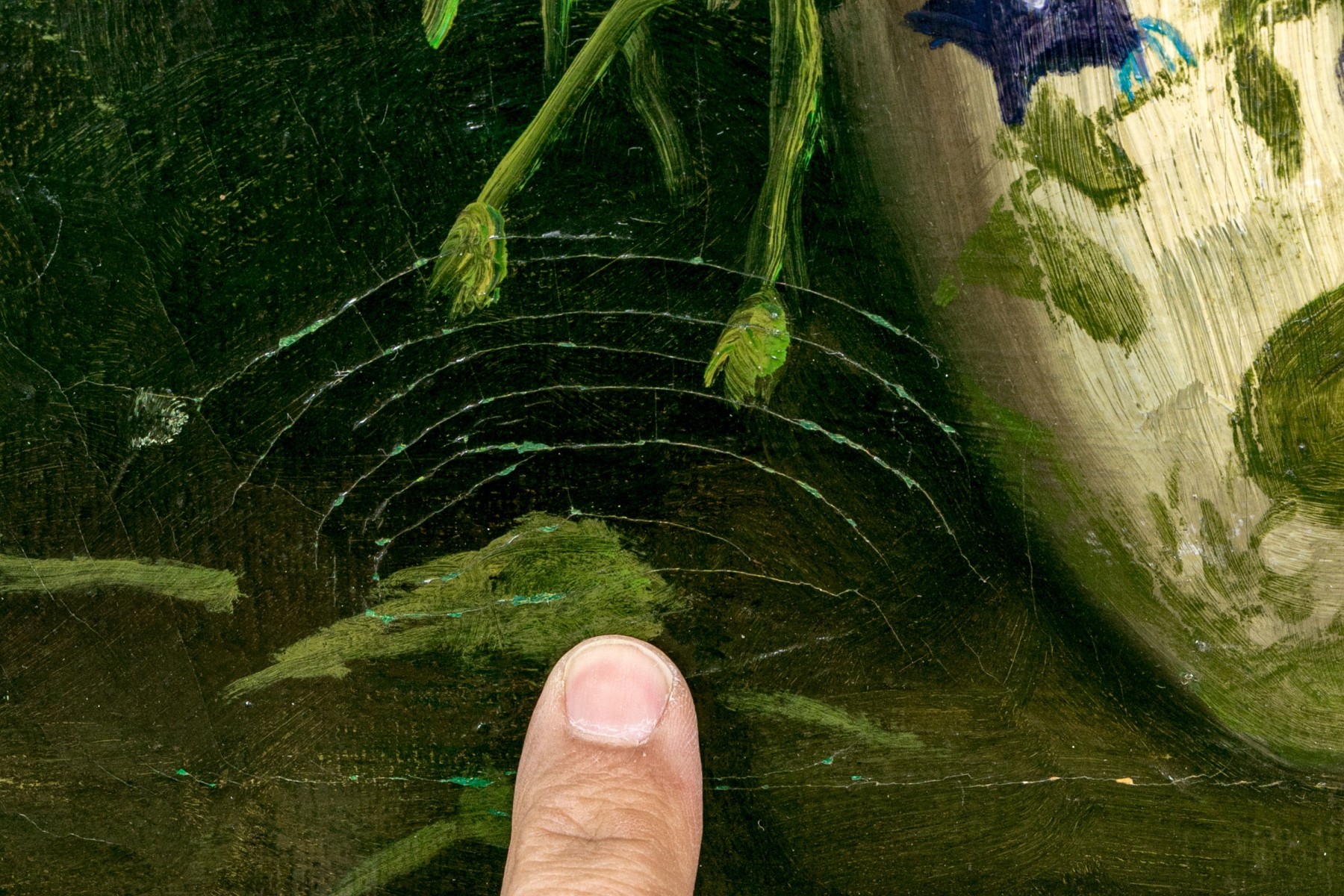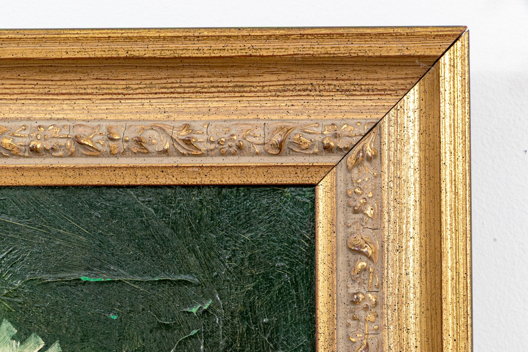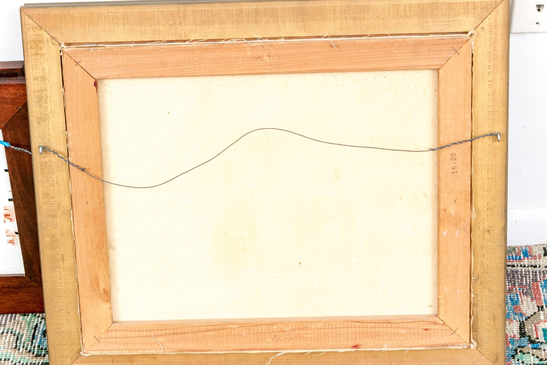 Tiny spots of paint loss around the craquelure and faint indentation around the stretcher perimeter. Loss to the relief border on the frame. Despite wear still presents very nicely overall.