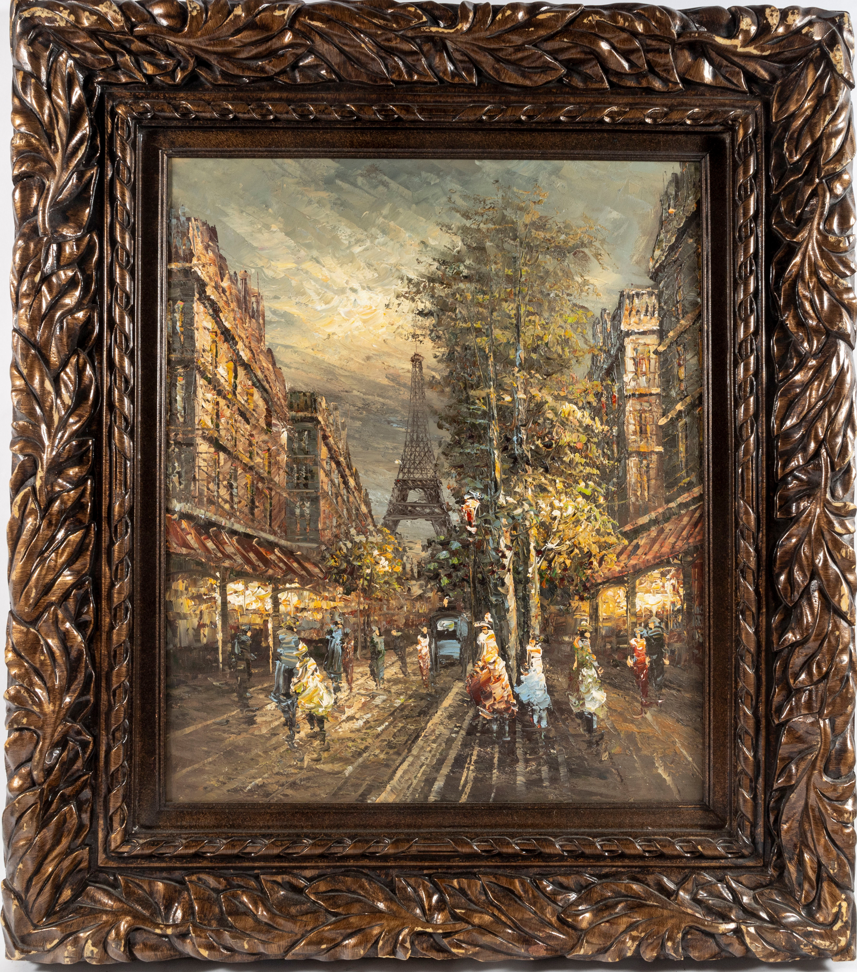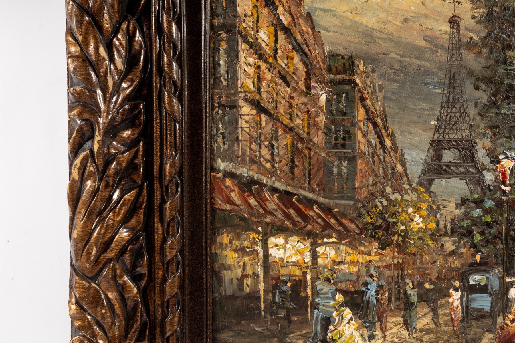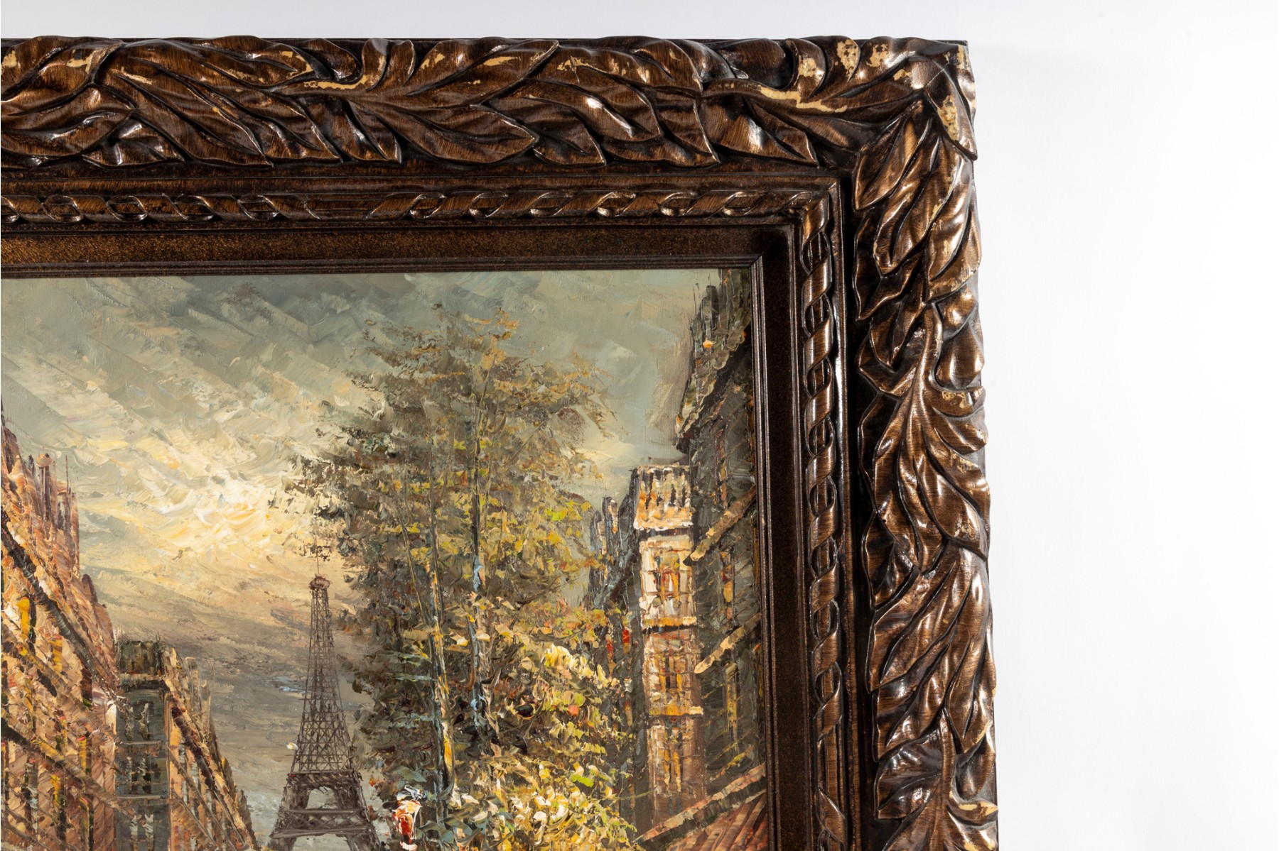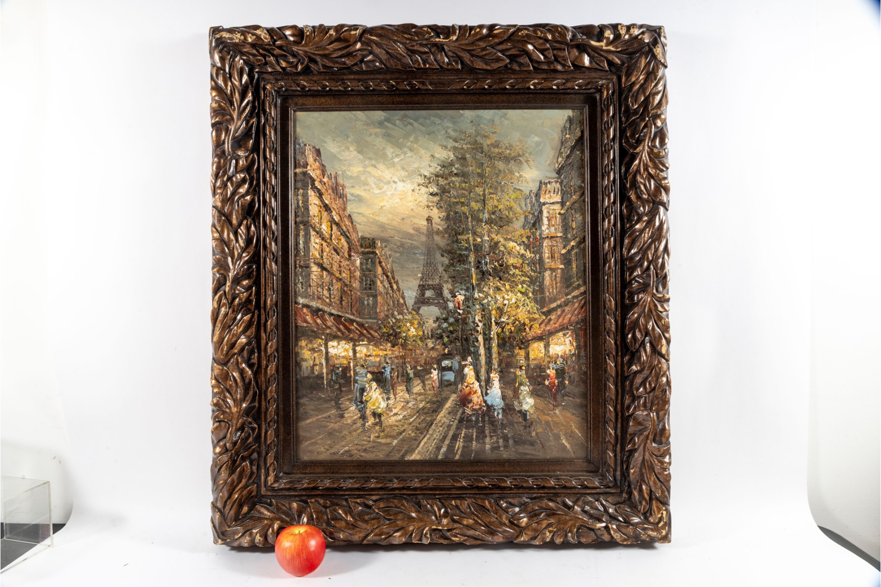 A large oil on canvas painting depicting a bustling Paris city landscape being overshadowed by the Eiffel Tower, No signature -- unknown artist. The painting is presented openly within a wood frame with carved vine details.