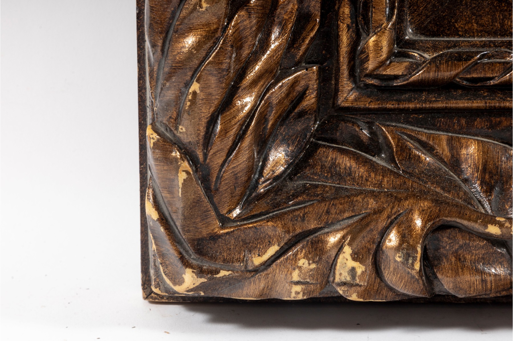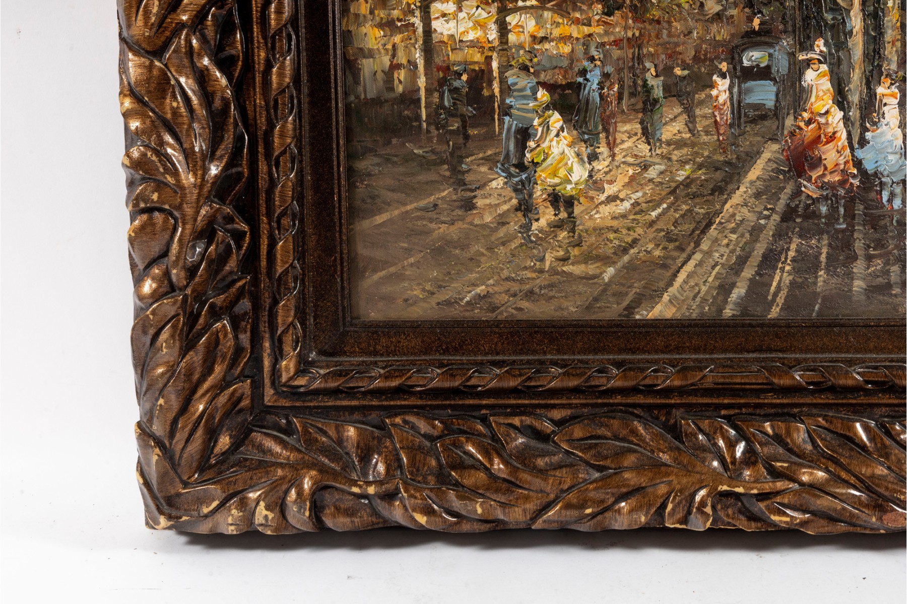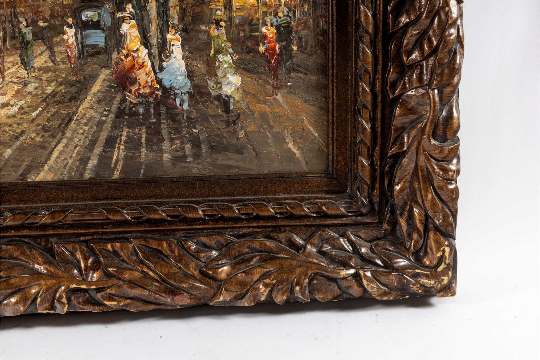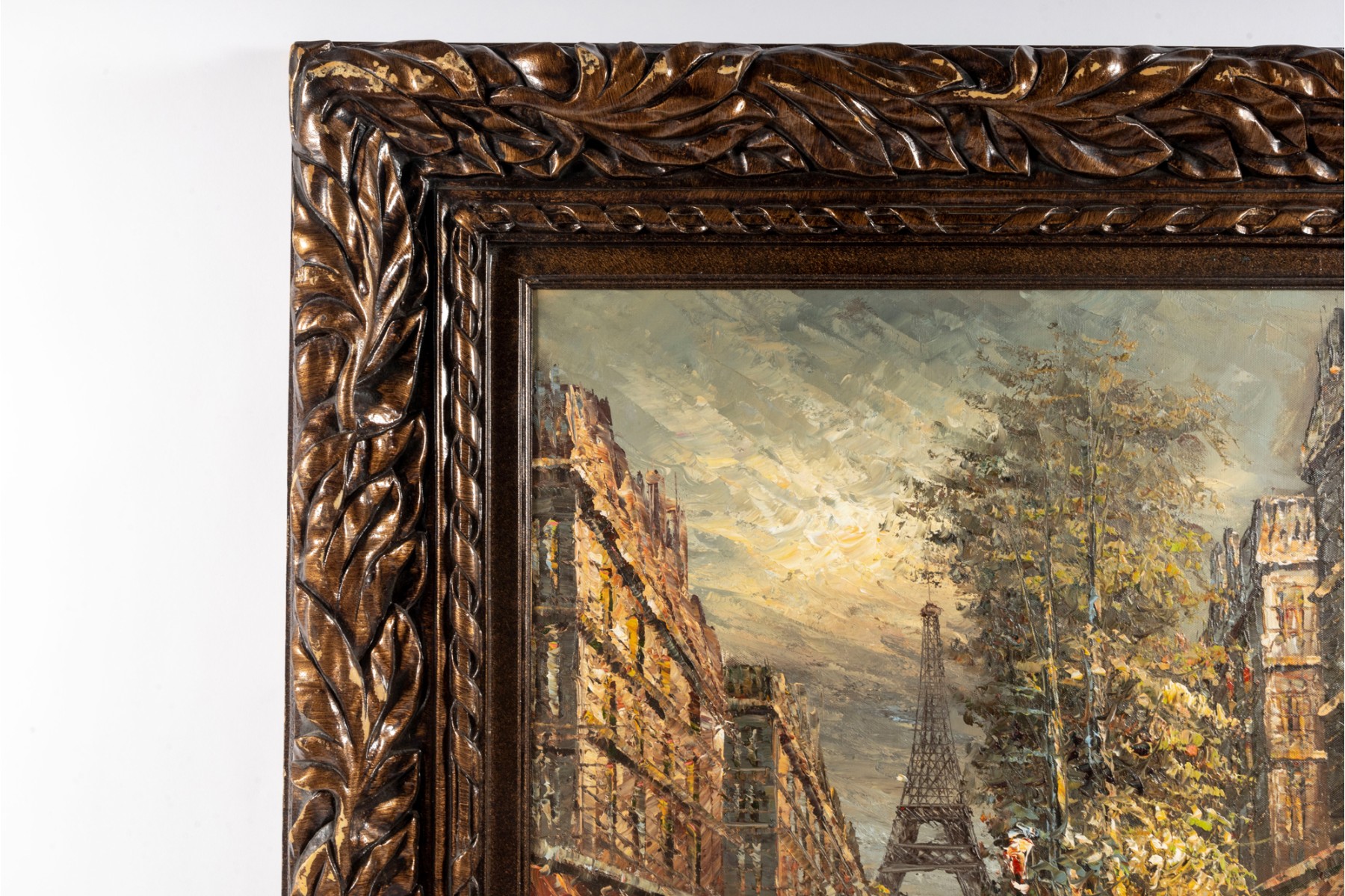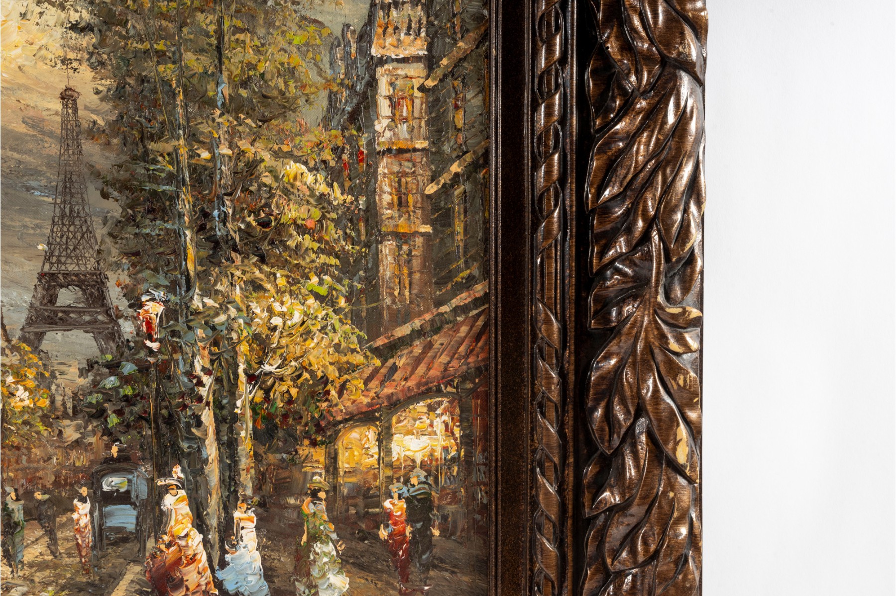 A large oil on canvas painting depicting a bustling Paris city landscape being overshadowed by the Eiffel Tower, No signature -- unknown artist. The painting is presented openly within a wood frame with carved vine details.
