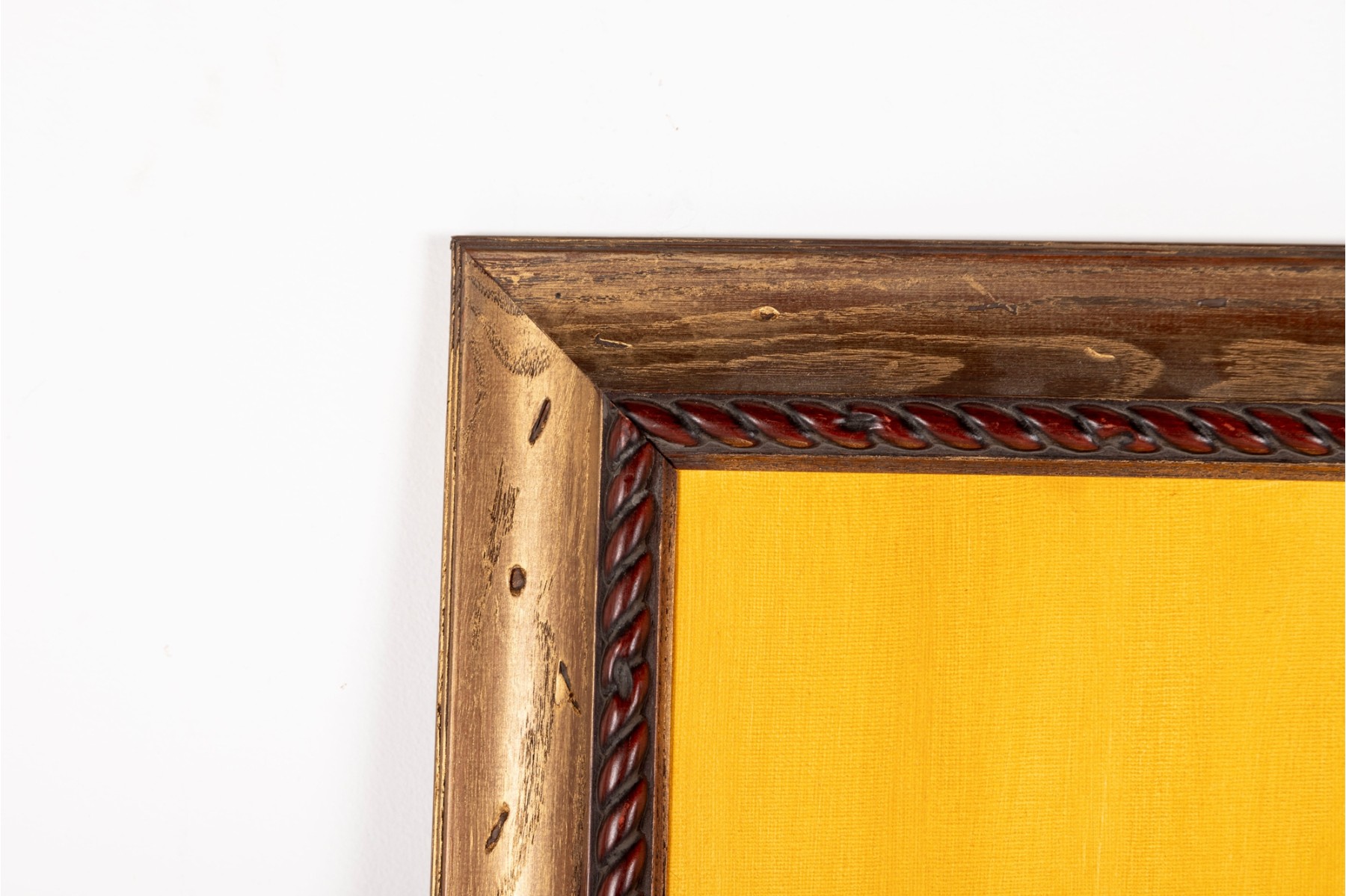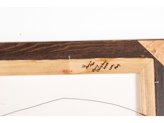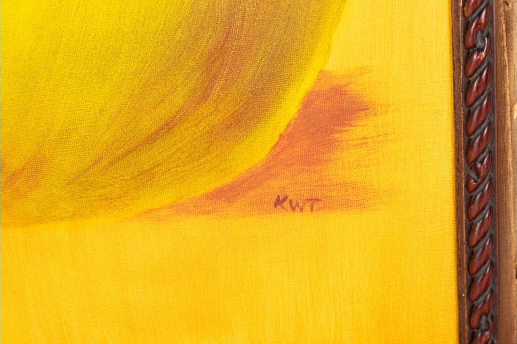 A simplistic still life of a person canvas -- signed "TWD" in bottom right corner, presented openly within a a contemporary gold-tone frame.