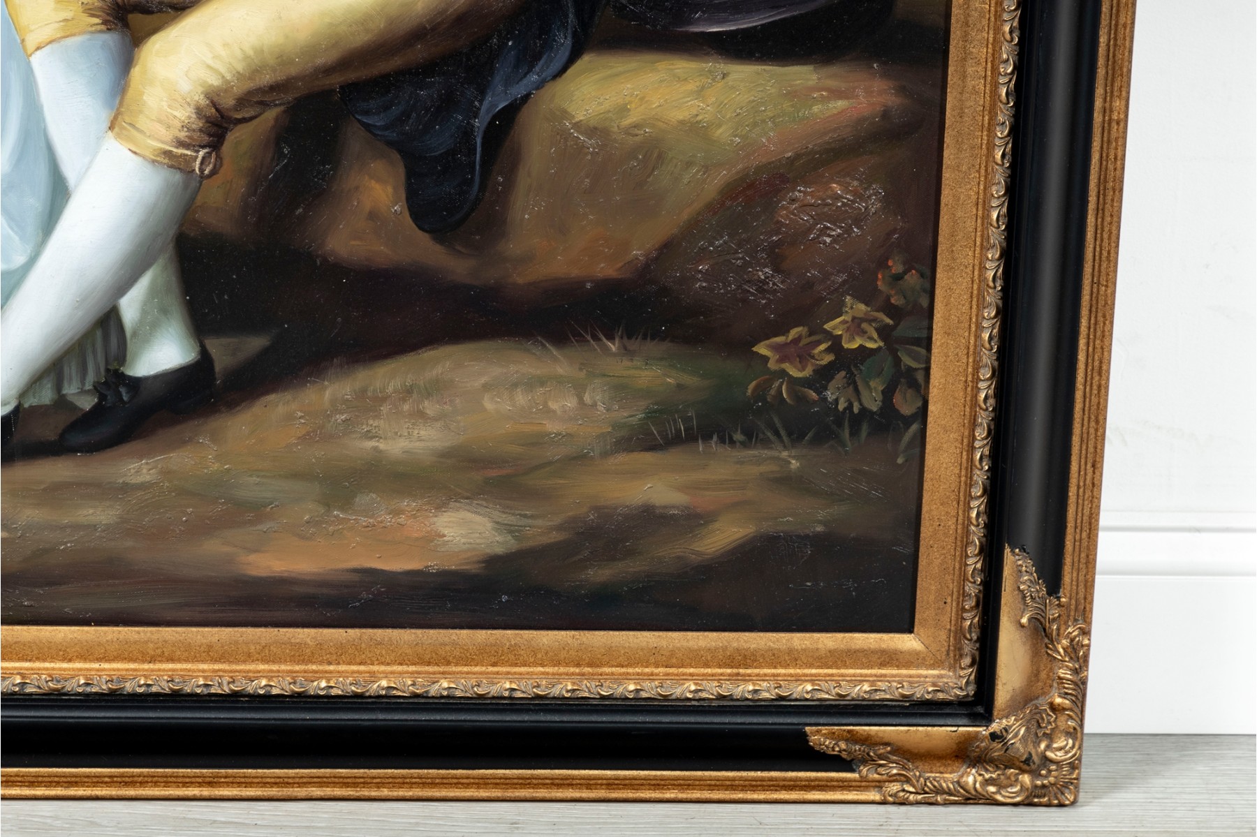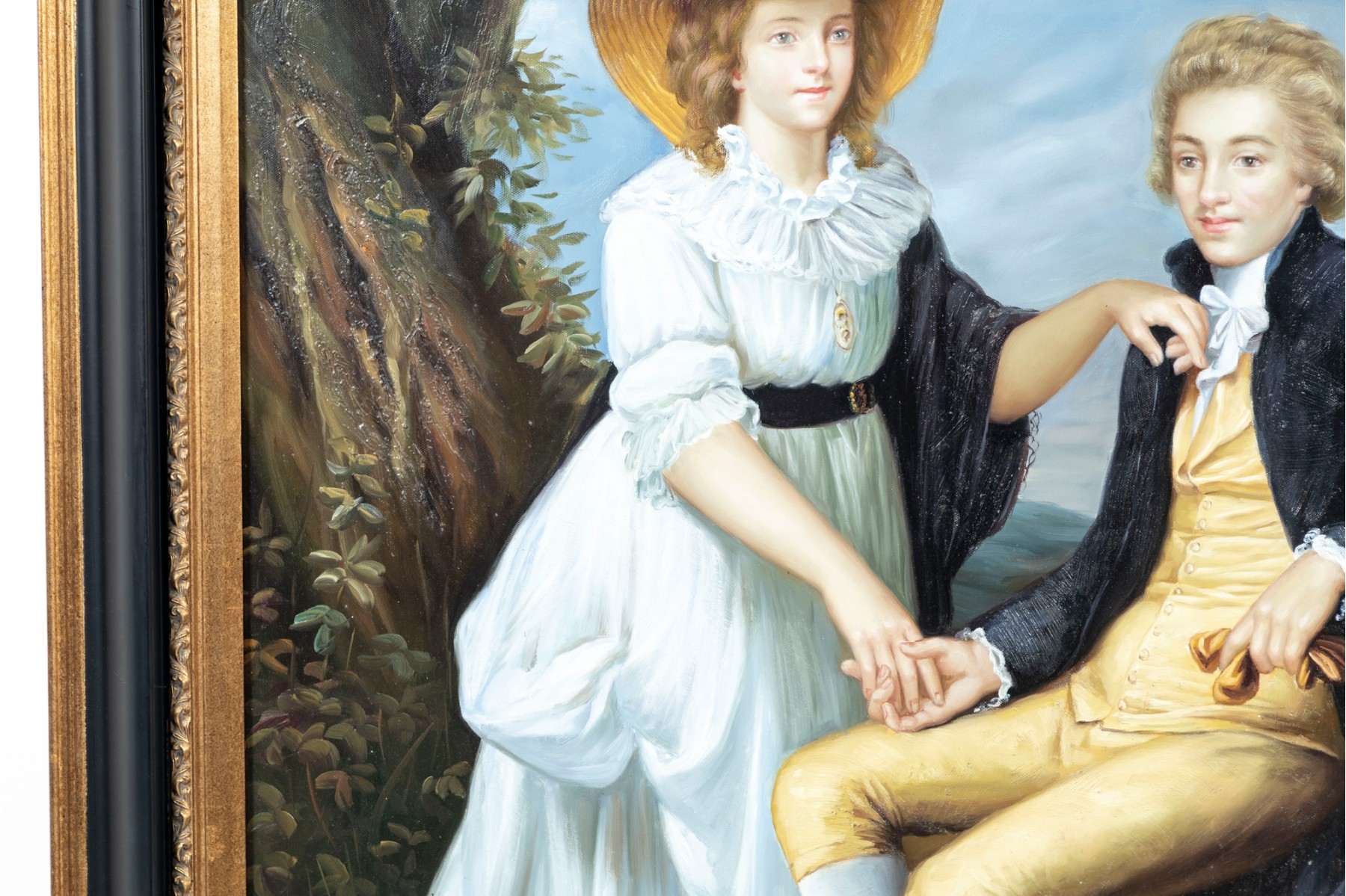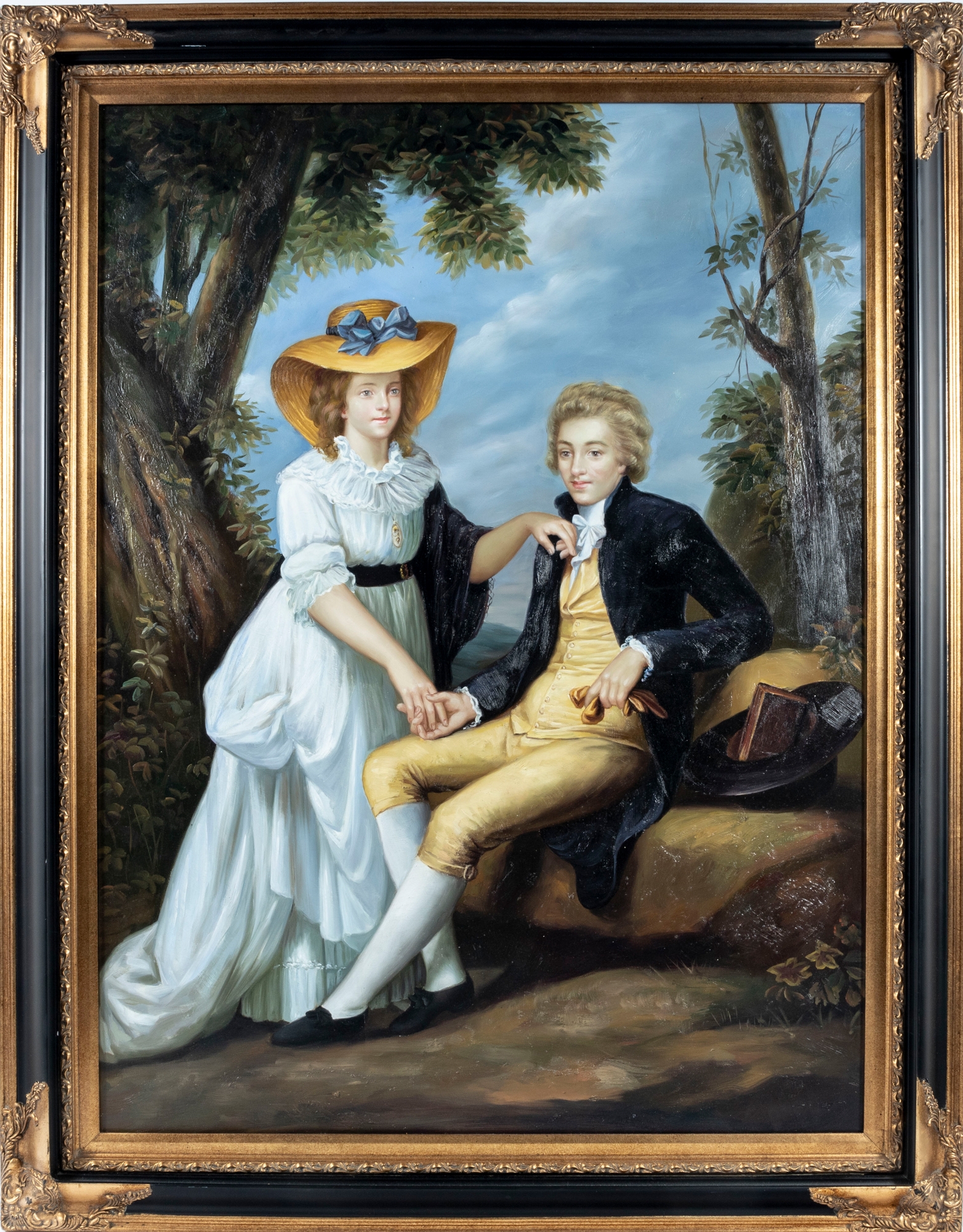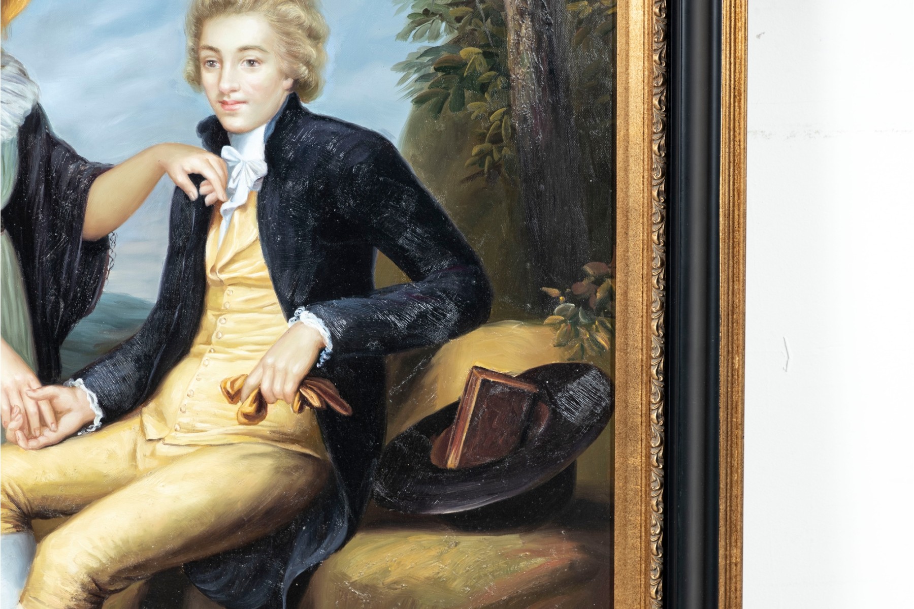 This oil on canvas captures a rendition of an early Victorian portrait of Robert Stearne Tighe and his wife Catherine, rendered with exquisite detail. The artist skillfully portrays the couple in traditional attire, reflecting their status and character, with an emphasis on fine textures and lifelike expressions. The artwork is displayed in an ornate black frame with gold-tone details.
