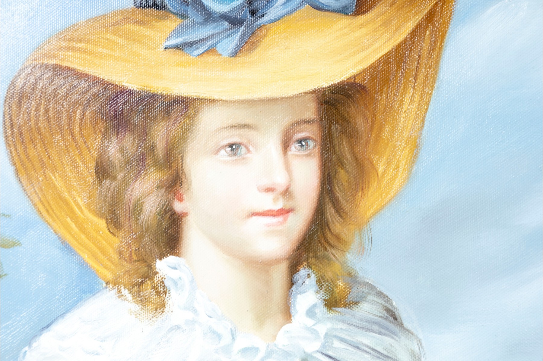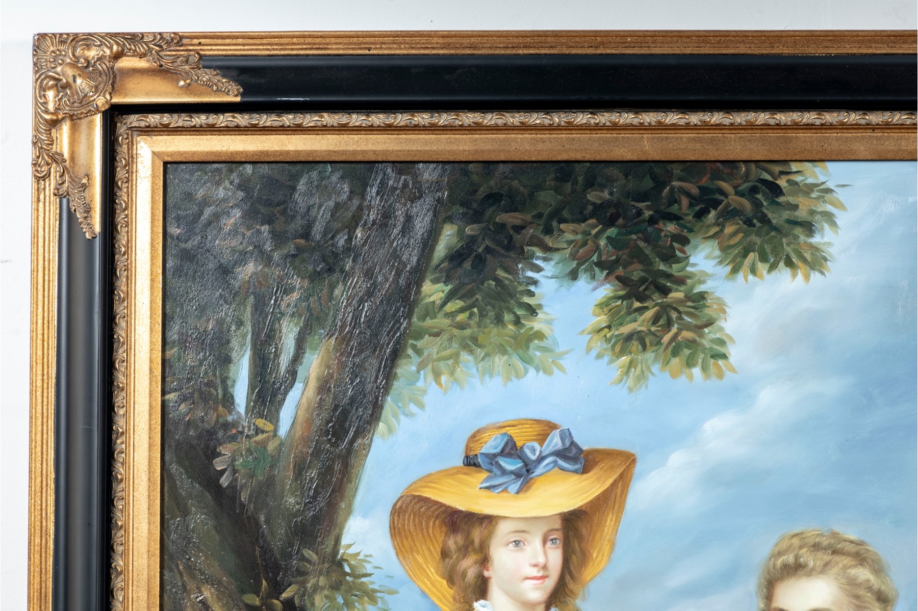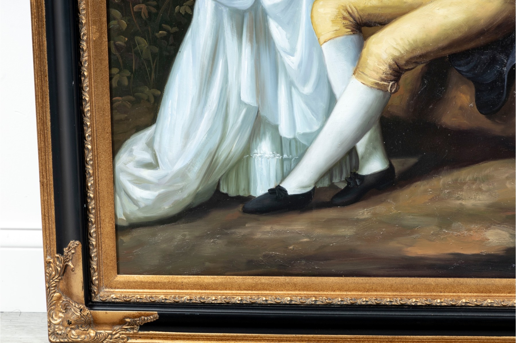 This oil on canvas captures a rendition of an early Victorian portrait of Robert Stearne Tighe and his wife Catherine, rendered with exquisite detail. The artist skillfully portrays the couple in traditional attire, reflecting their status and character, with an emphasis on fine textures and lifelike expressions. The artwork is displayed in an ornate black frame with gold-tone details.