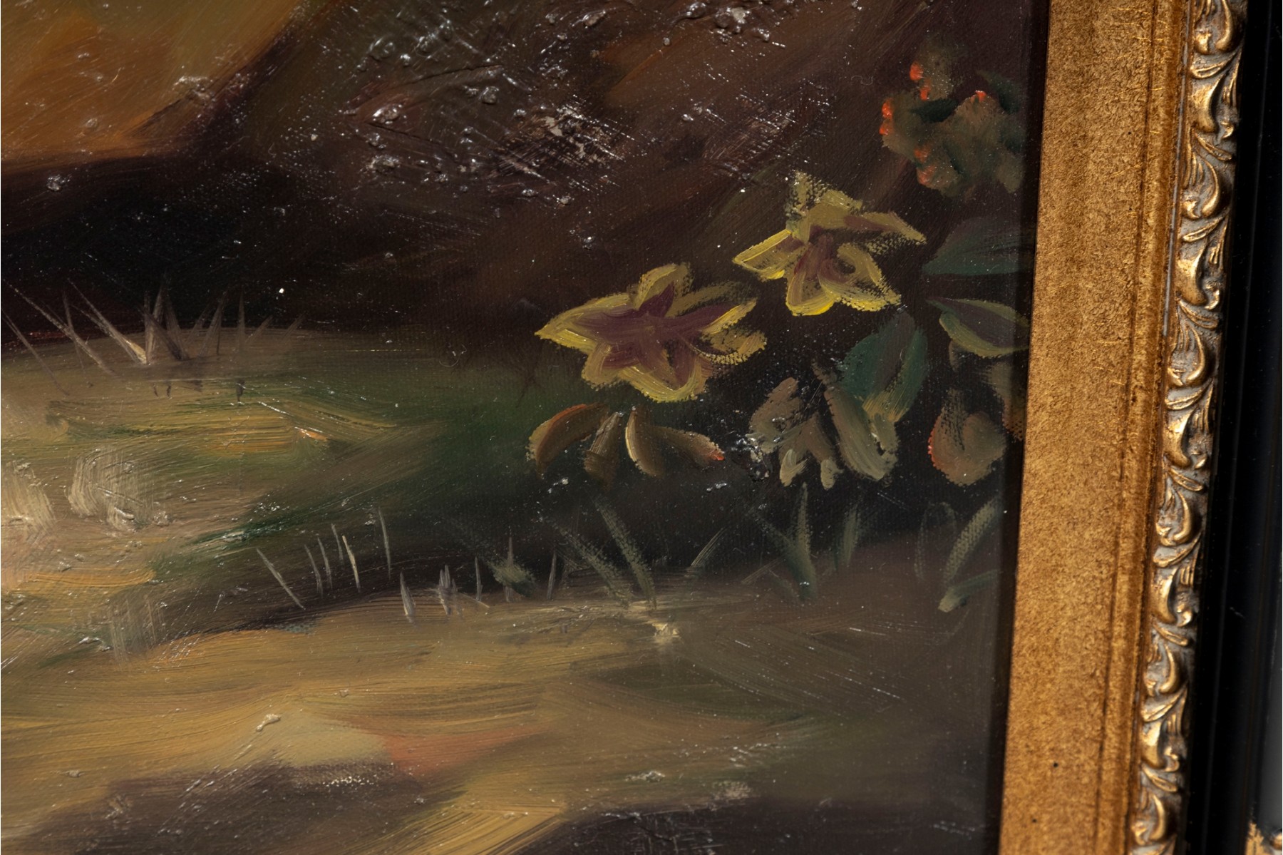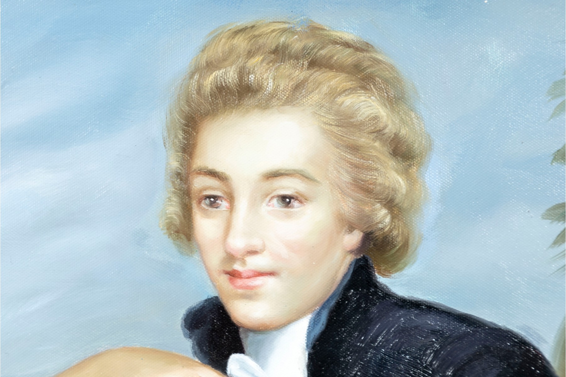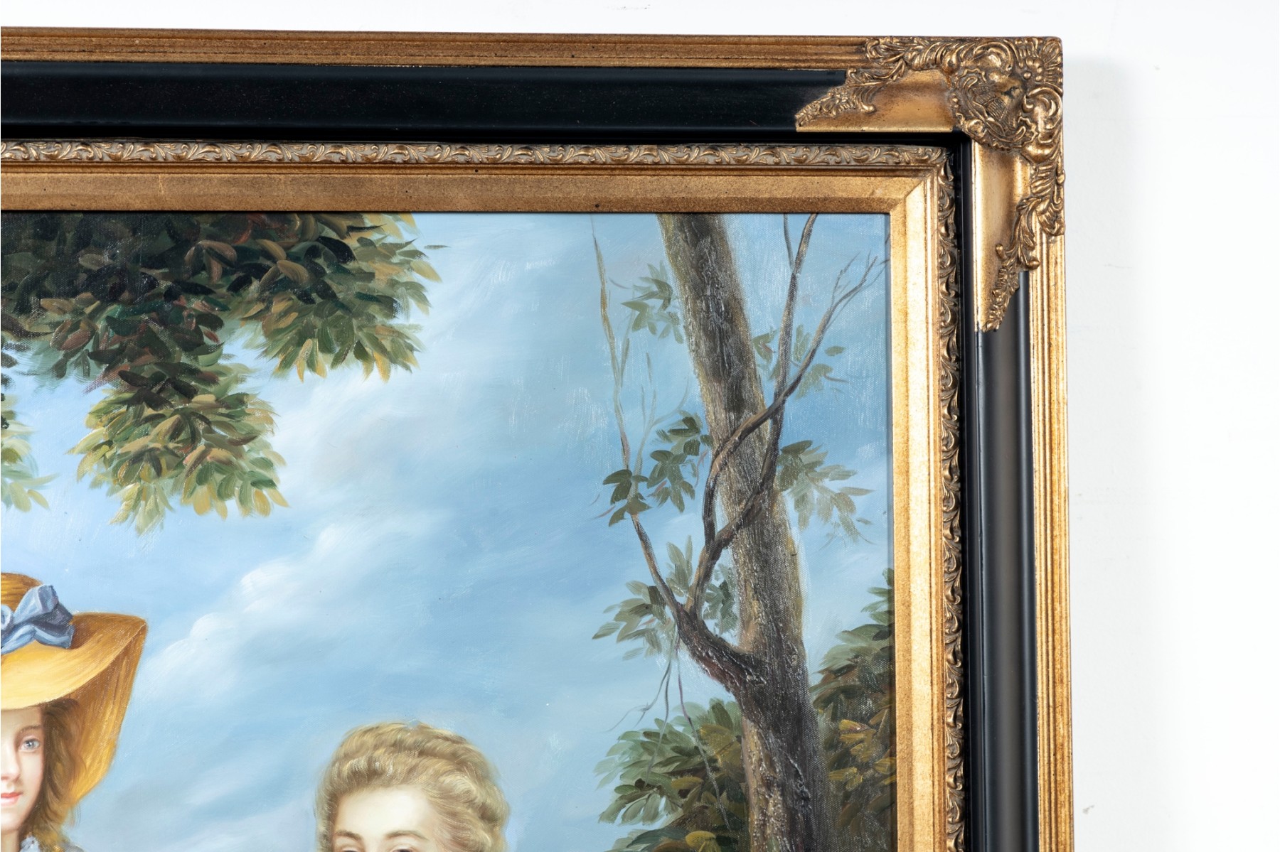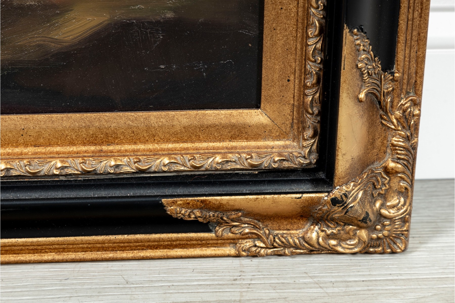 This oil on canvas captures a rendition of an early Victorian portrait of Robert Stearne Tighe and his wife Catherine, rendered with exquisite detail. The artist skillfully portrays the couple in traditional attire, reflecting their status and character, with an emphasis on fine textures and lifelike expressions. The artwork is displayed in an ornate black frame with gold-tone details.