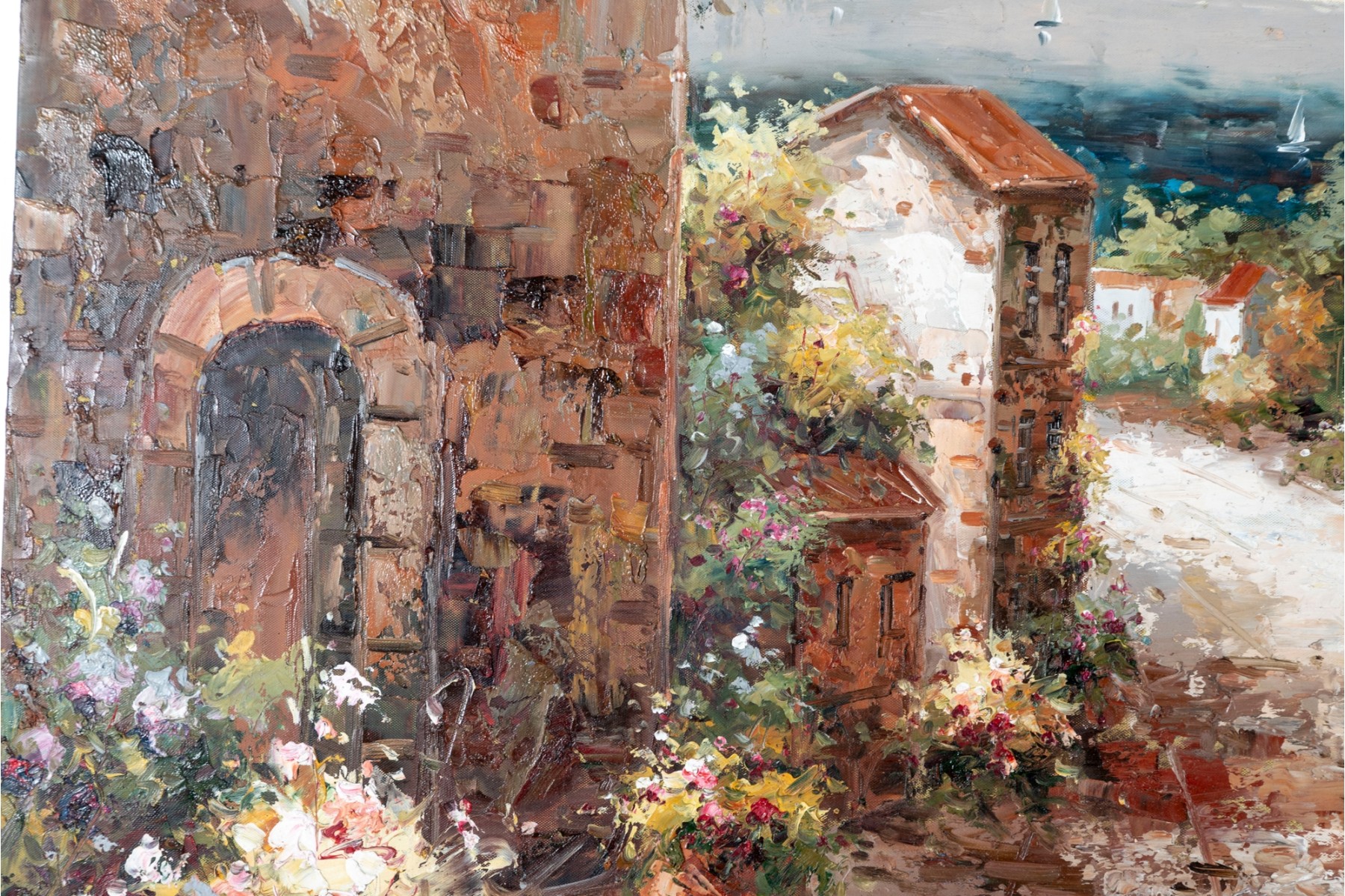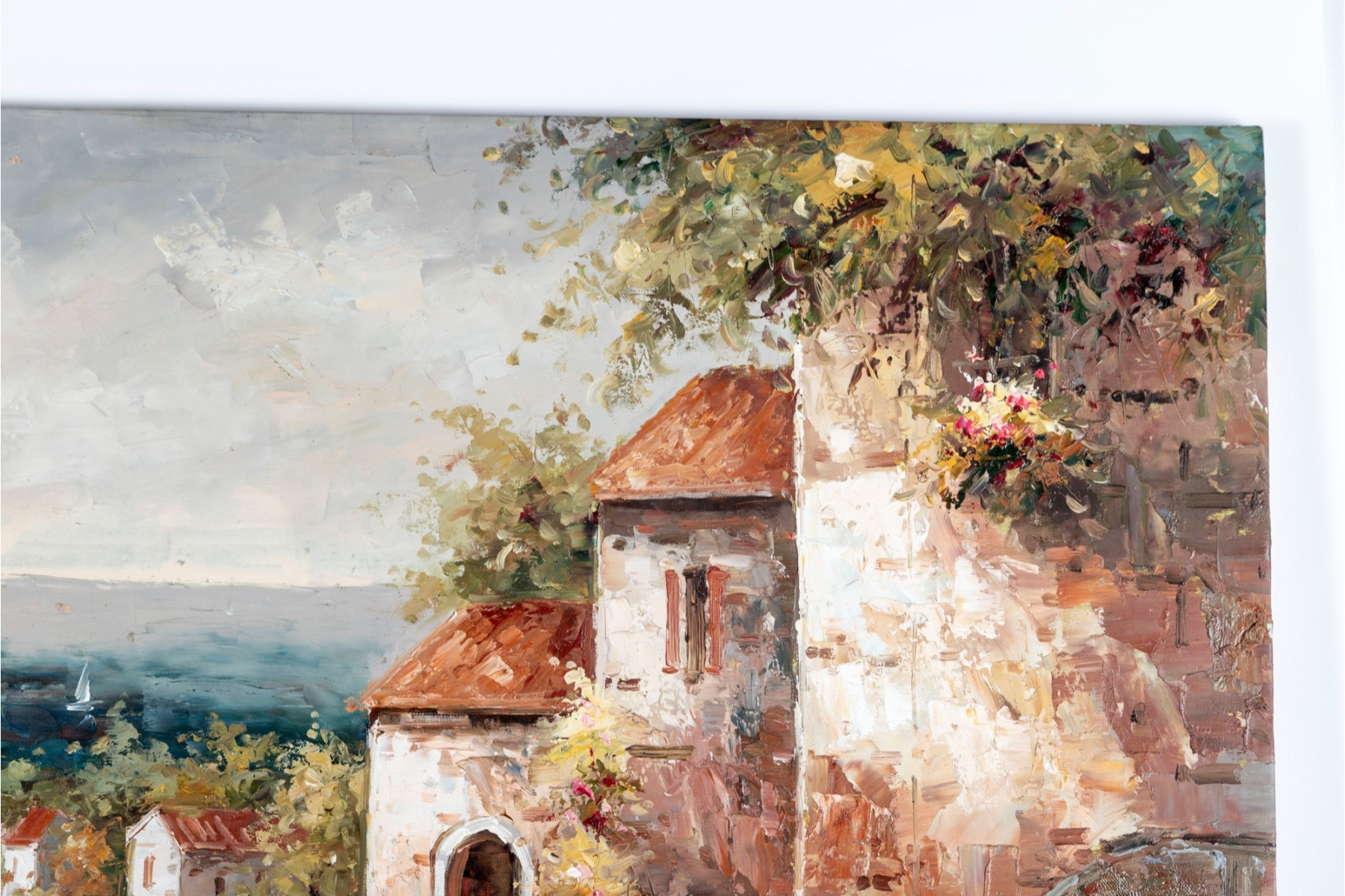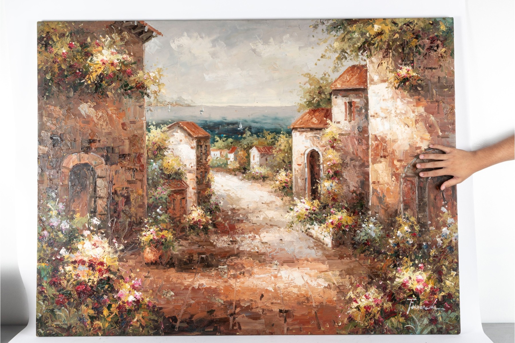 A large, charming oil on canvas painting depicting a sunlit Tuscan village, with warm earth tones, rustic architecture and rich fauna. The painting is presented unframed on stretched canvas.