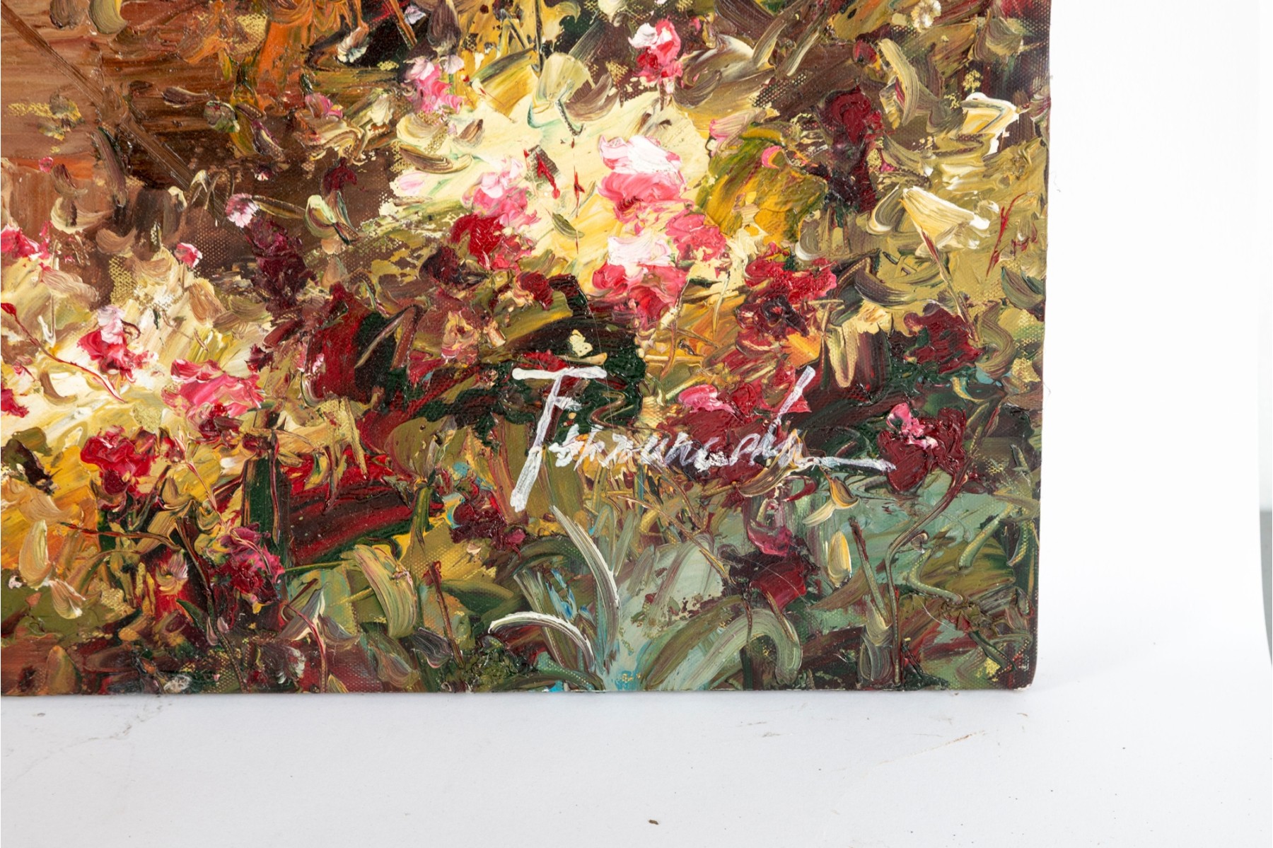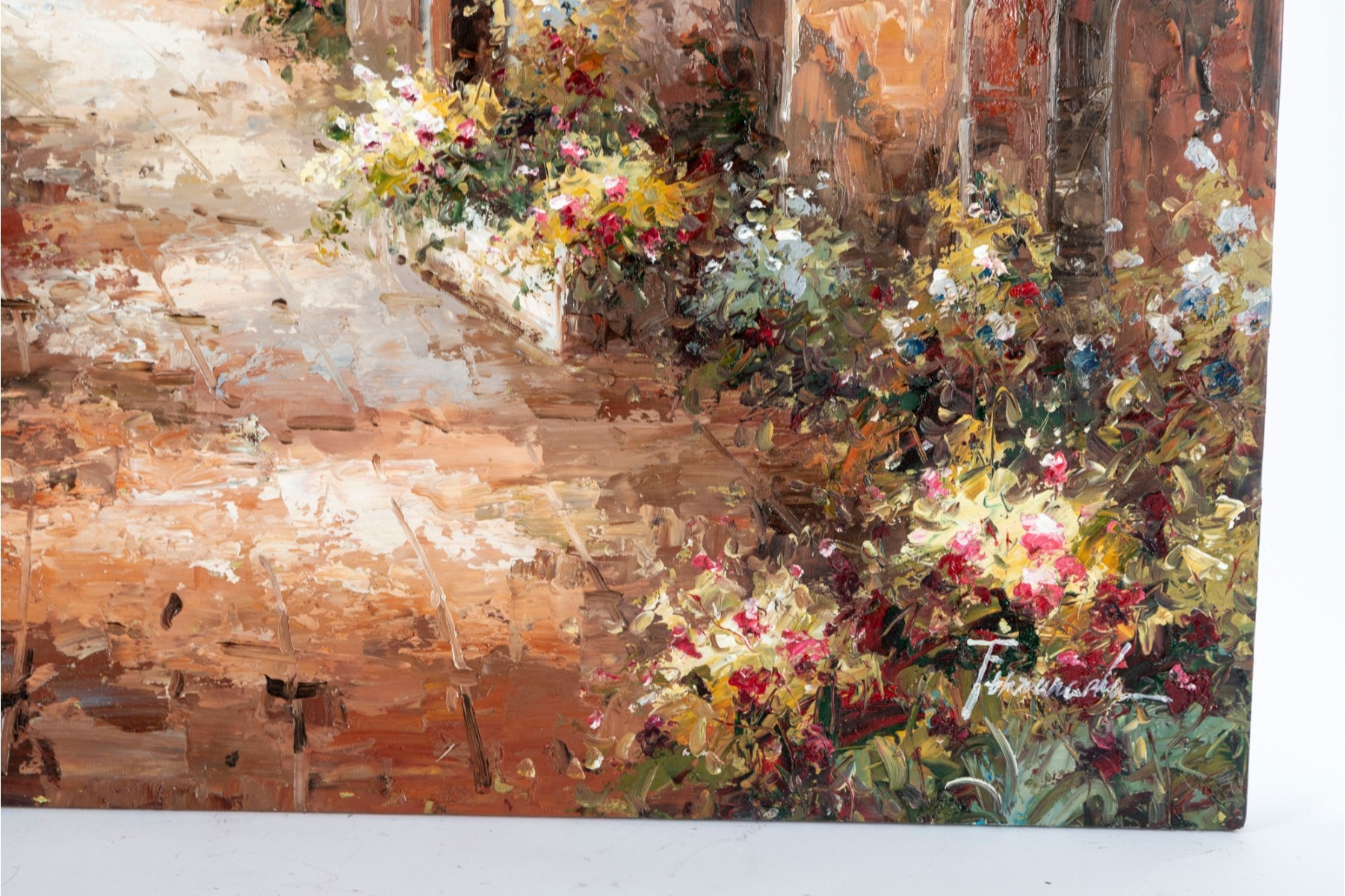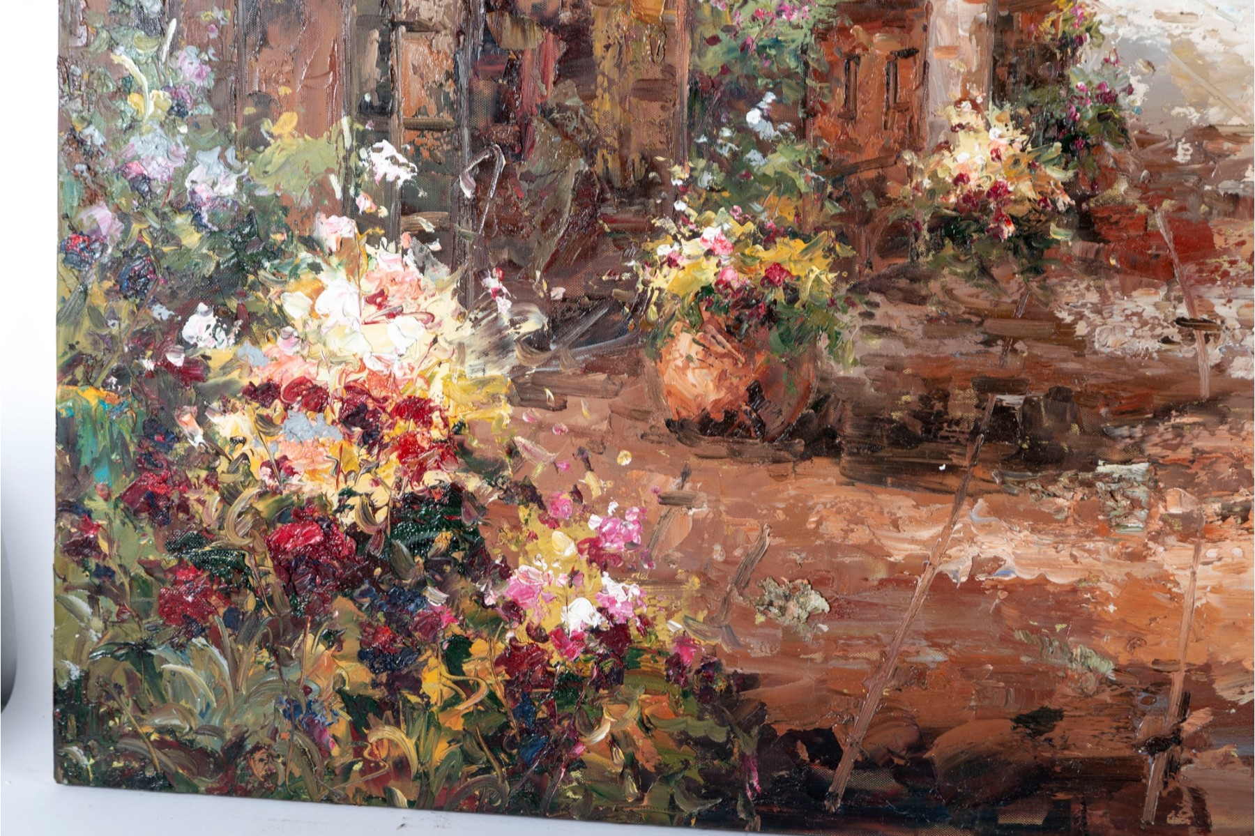 A large, charming oil on canvas painting depicting a sunlit Tuscan village, with warm earth tones, rustic architecture and rich fauna. The painting is presented unframed on stretched canvas.