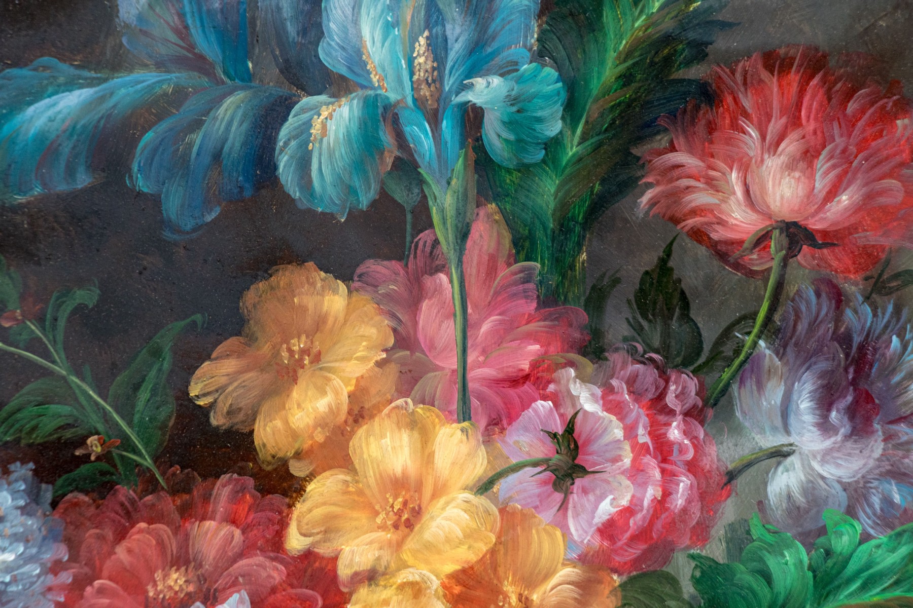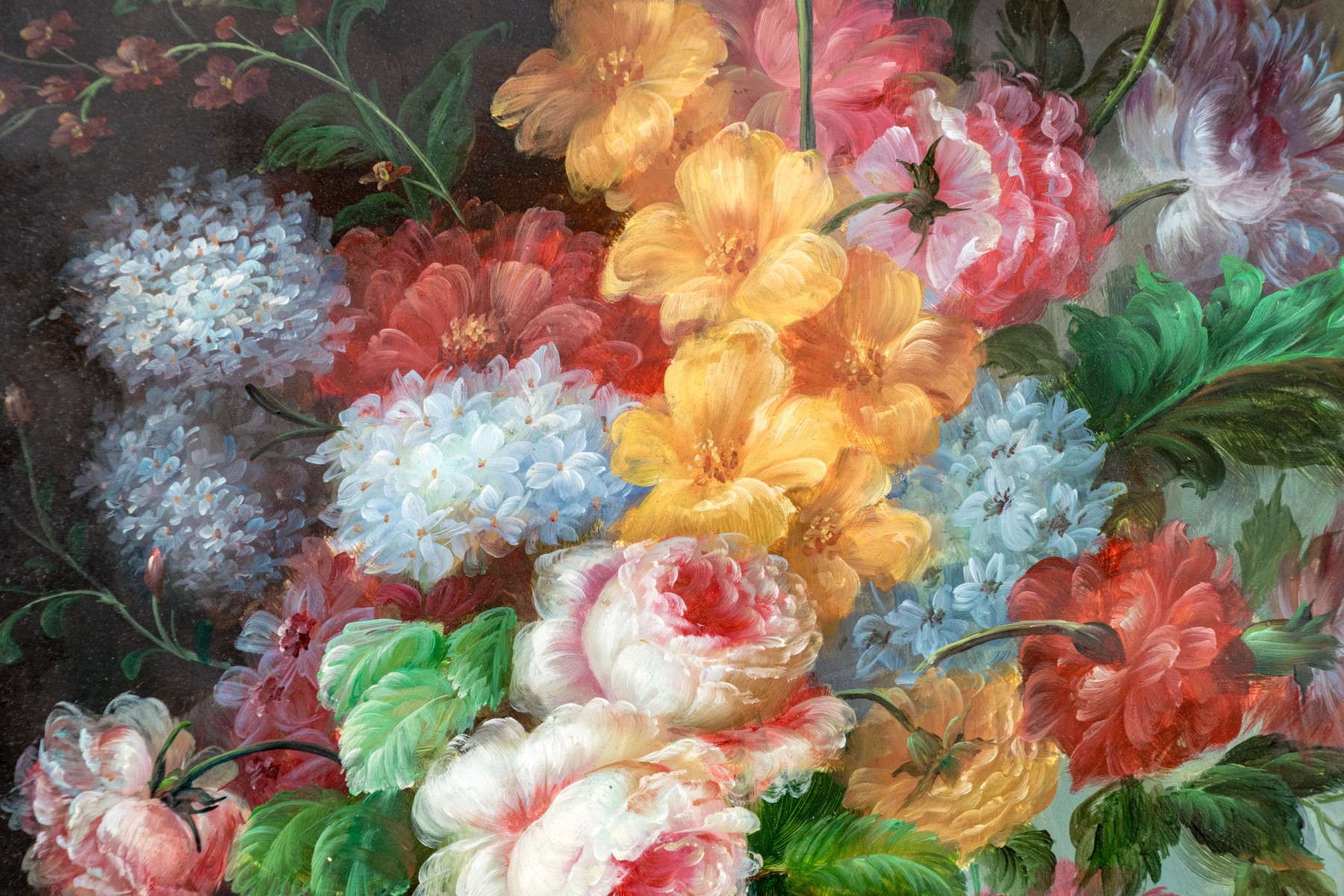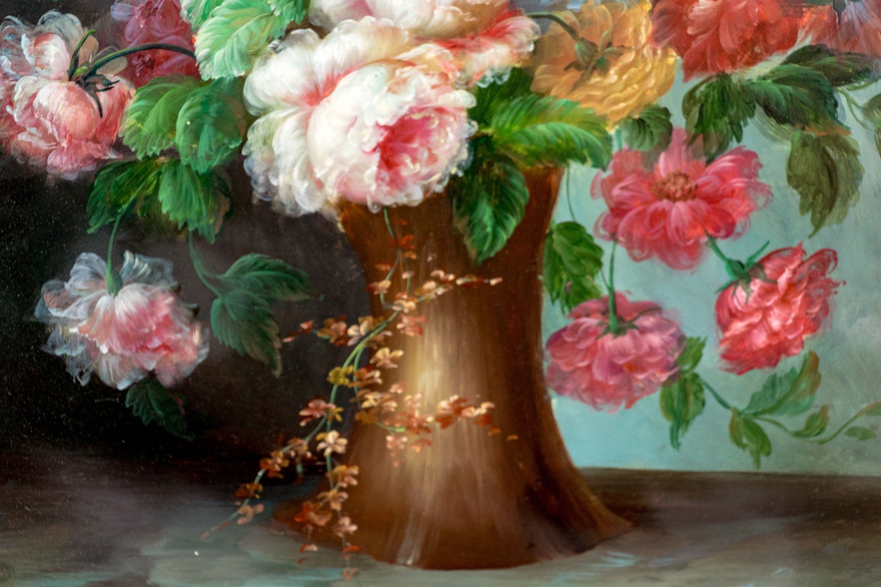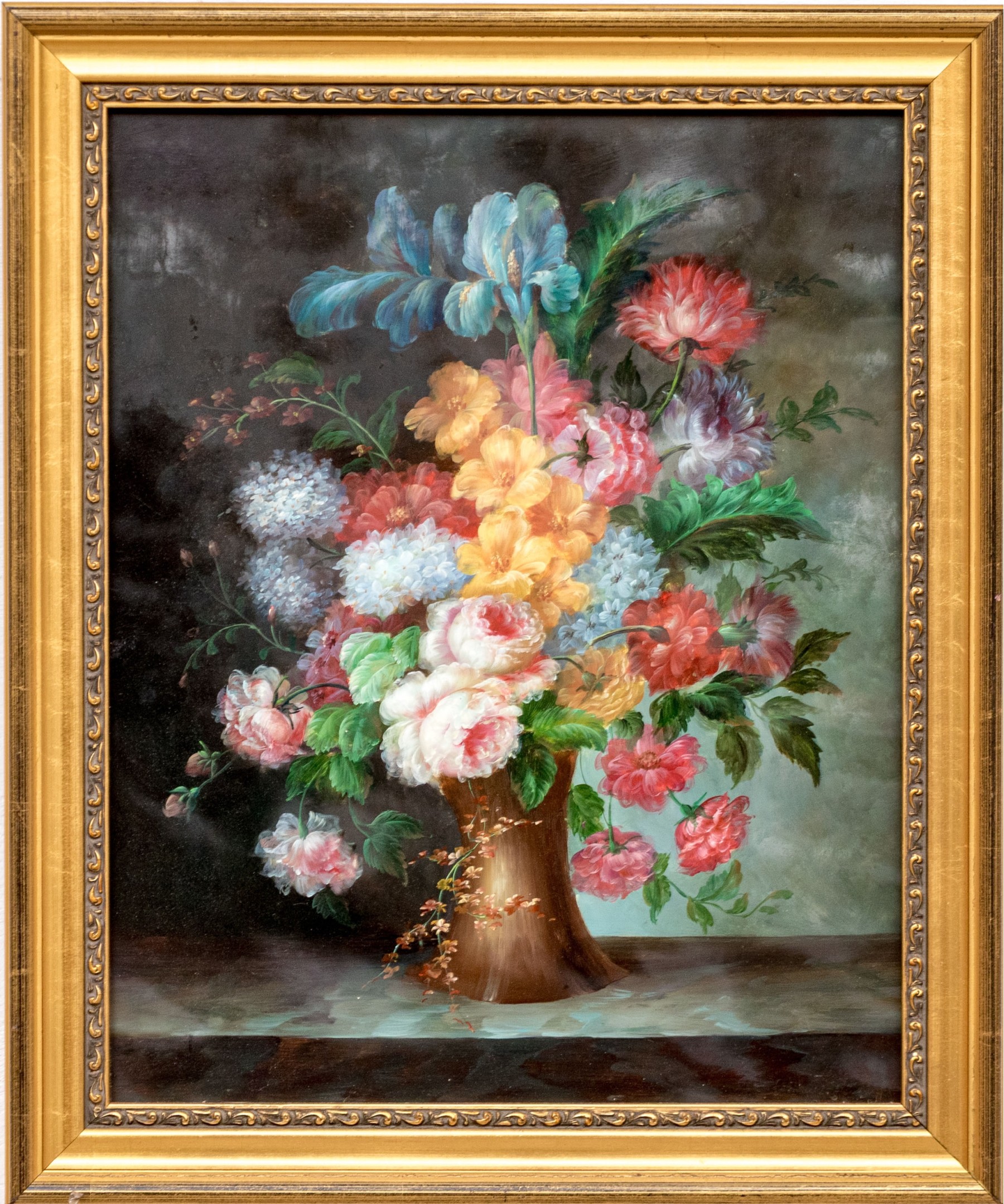 Unsigned. A tall bouquet of colorful various flowers with roses, peonies and hydrangeas in a tan vase. Presented in a gilt frame.