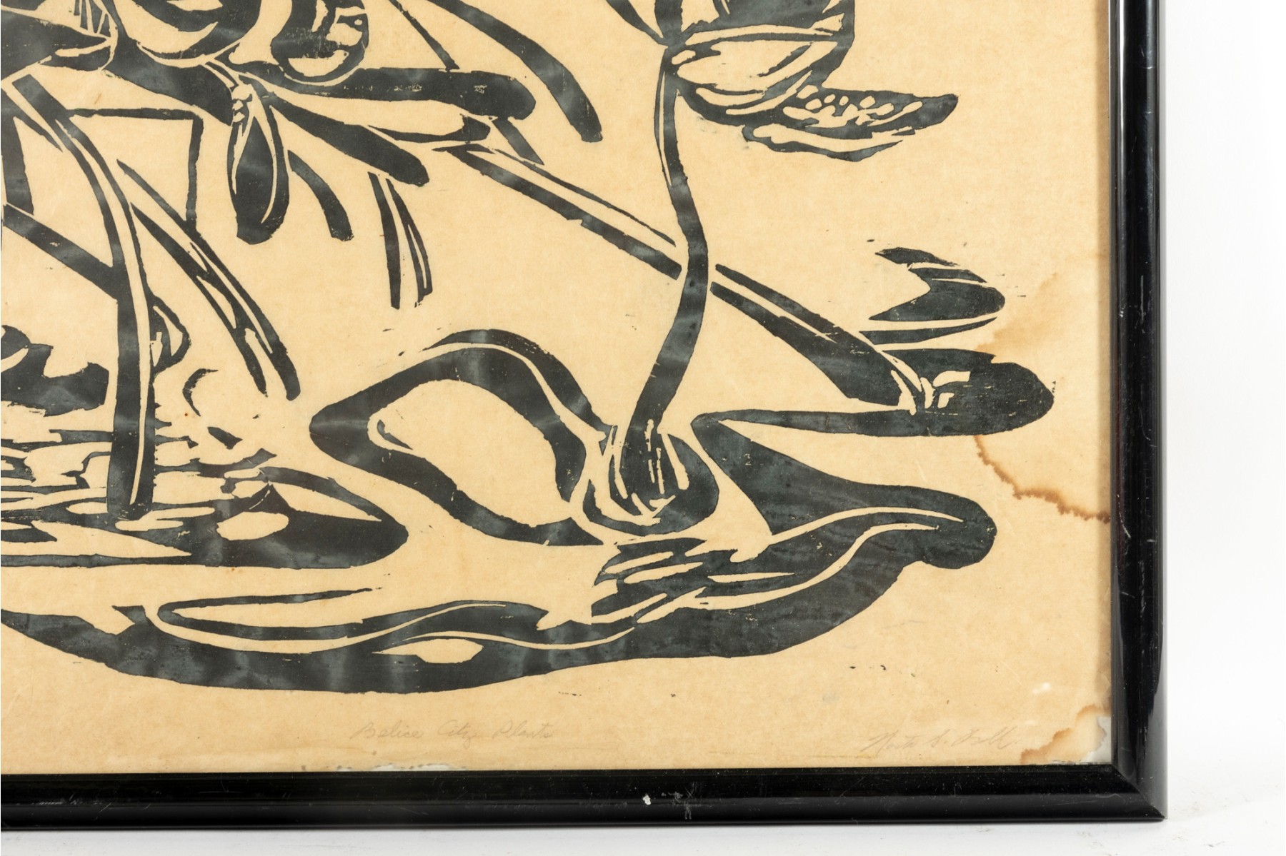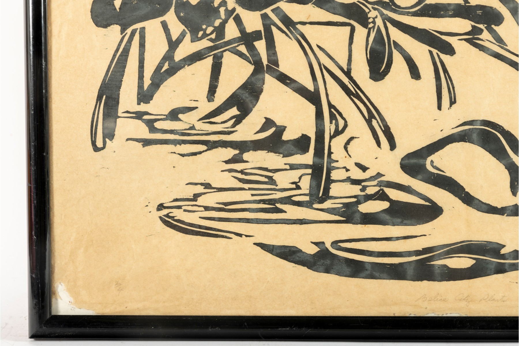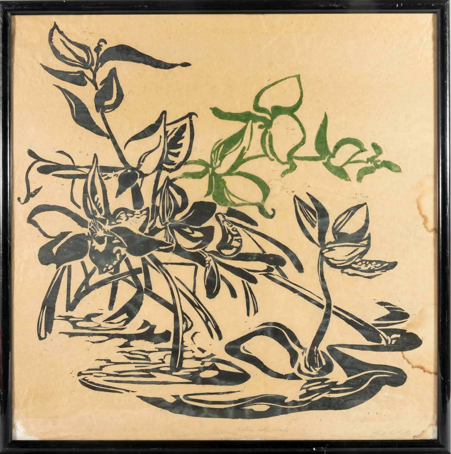 A vintage original oil on rice paper painting showcasing a series of Belize City plants in black/green, and is presented within a black metal frame, faced with glass.
