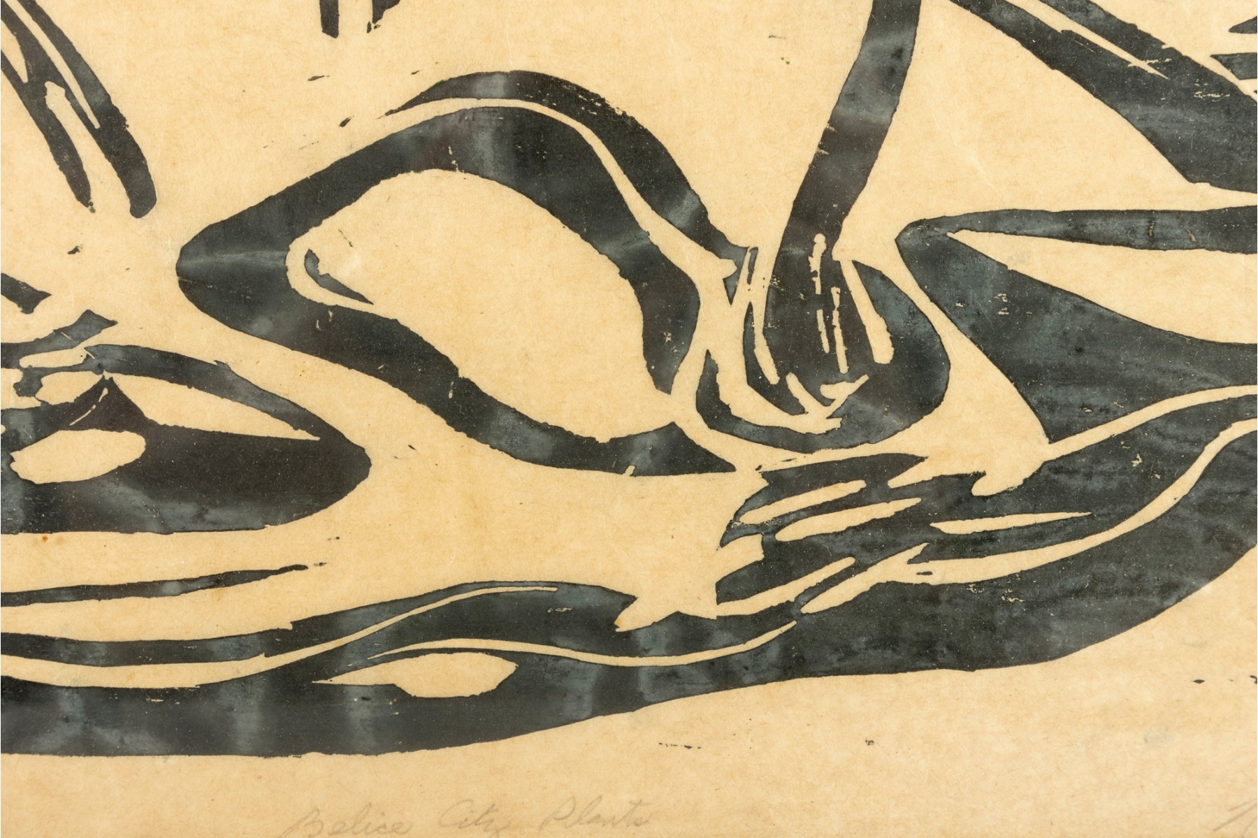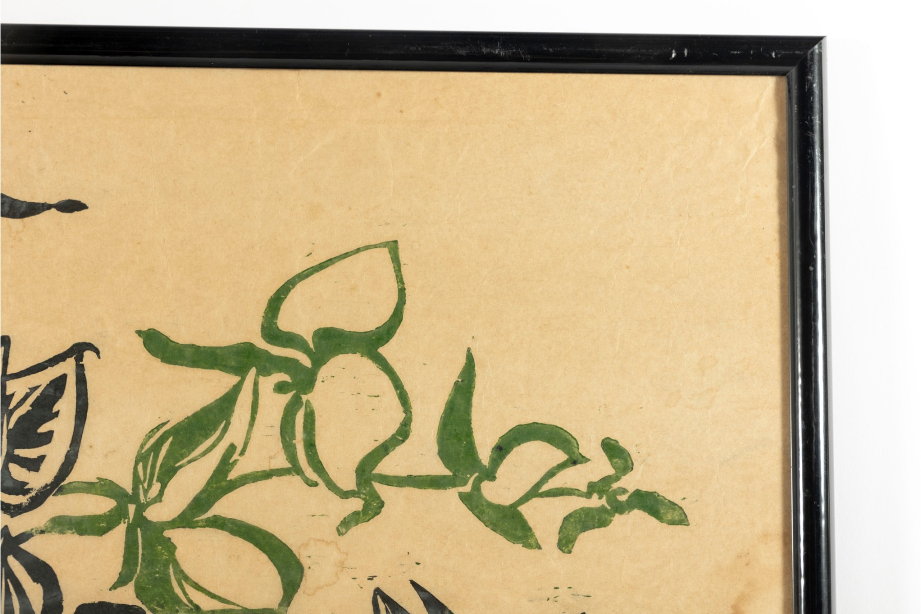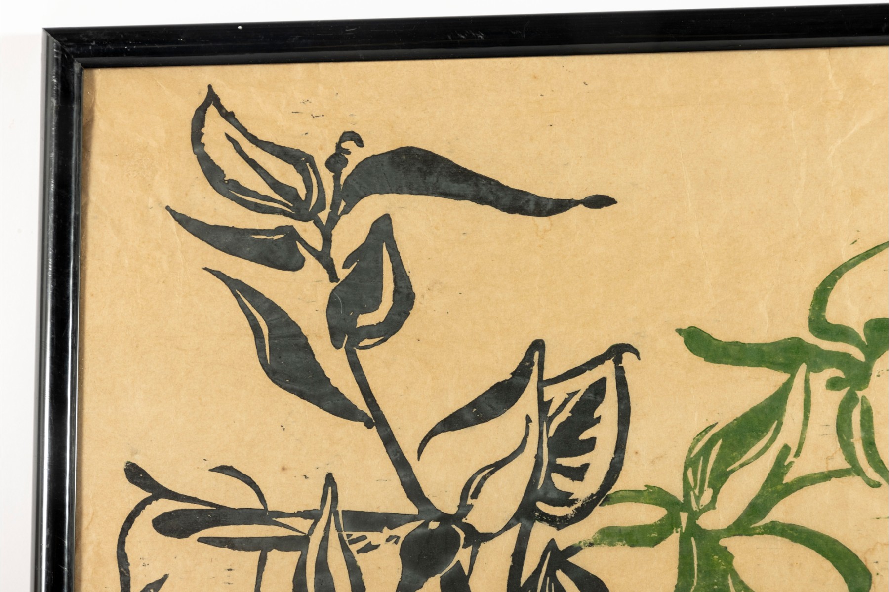 A vintage original oil on rice paper painting showcasing a series of Belize City plants in black/green, and is presented within a black metal frame, faced with glass.