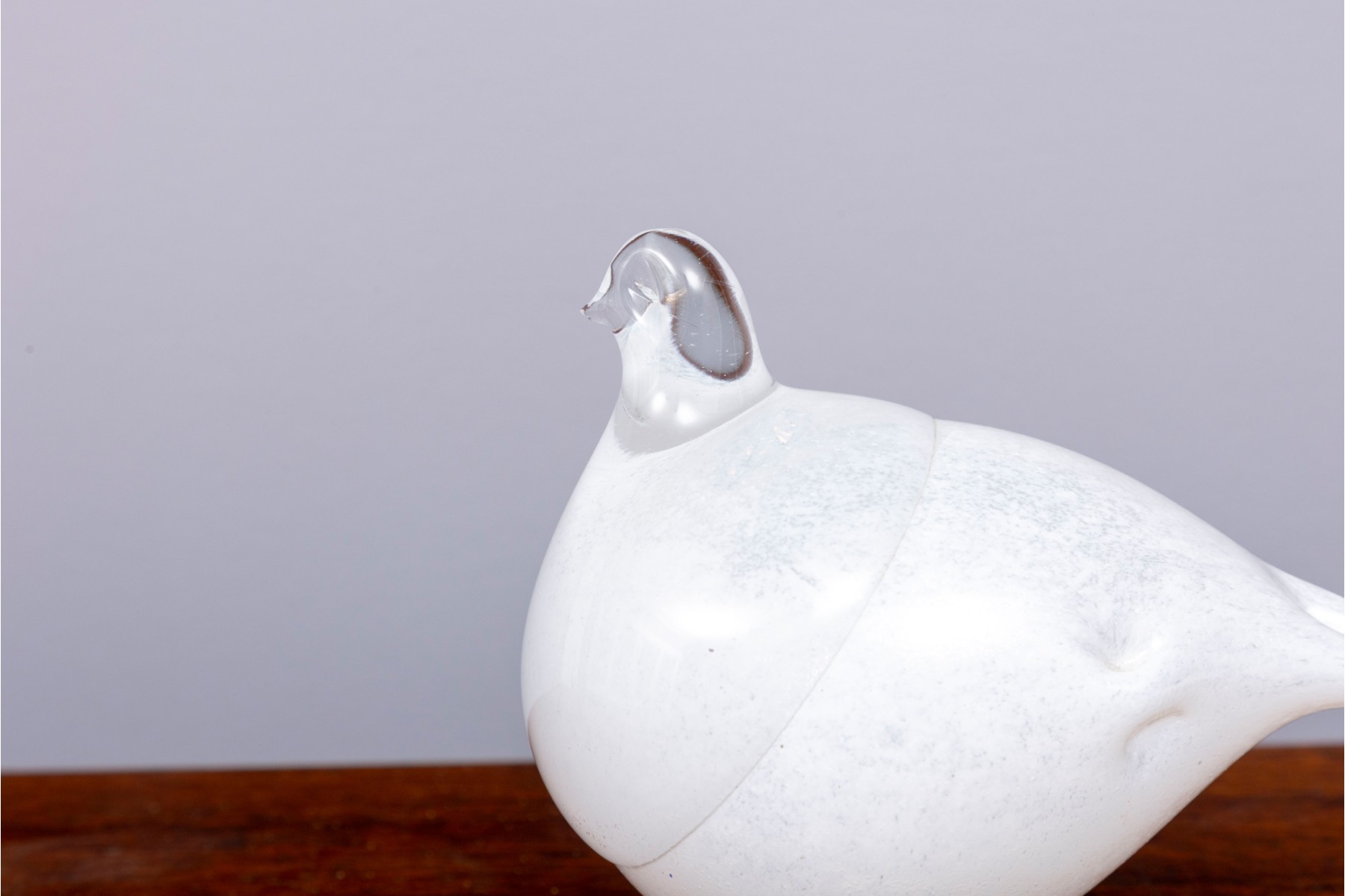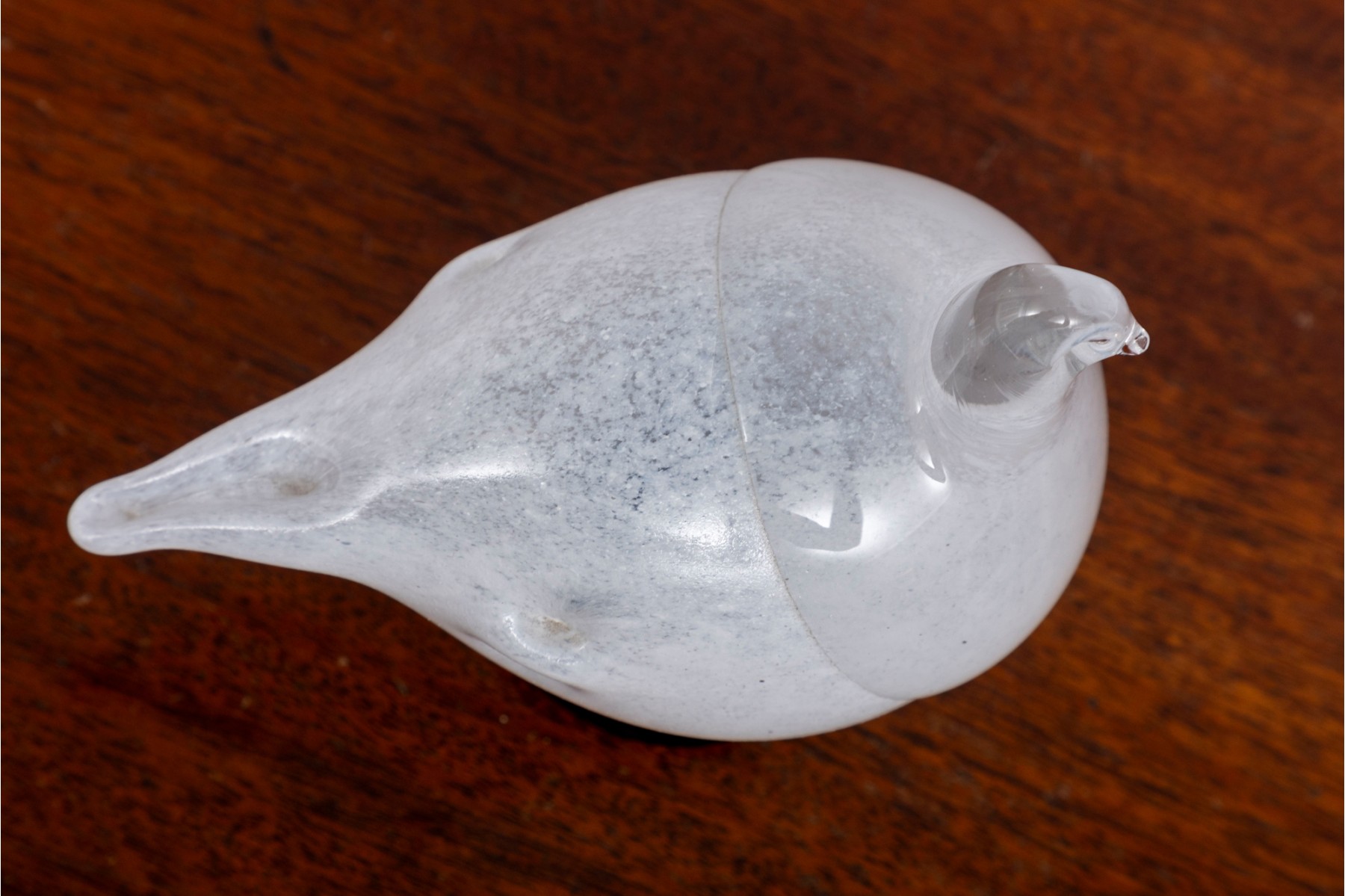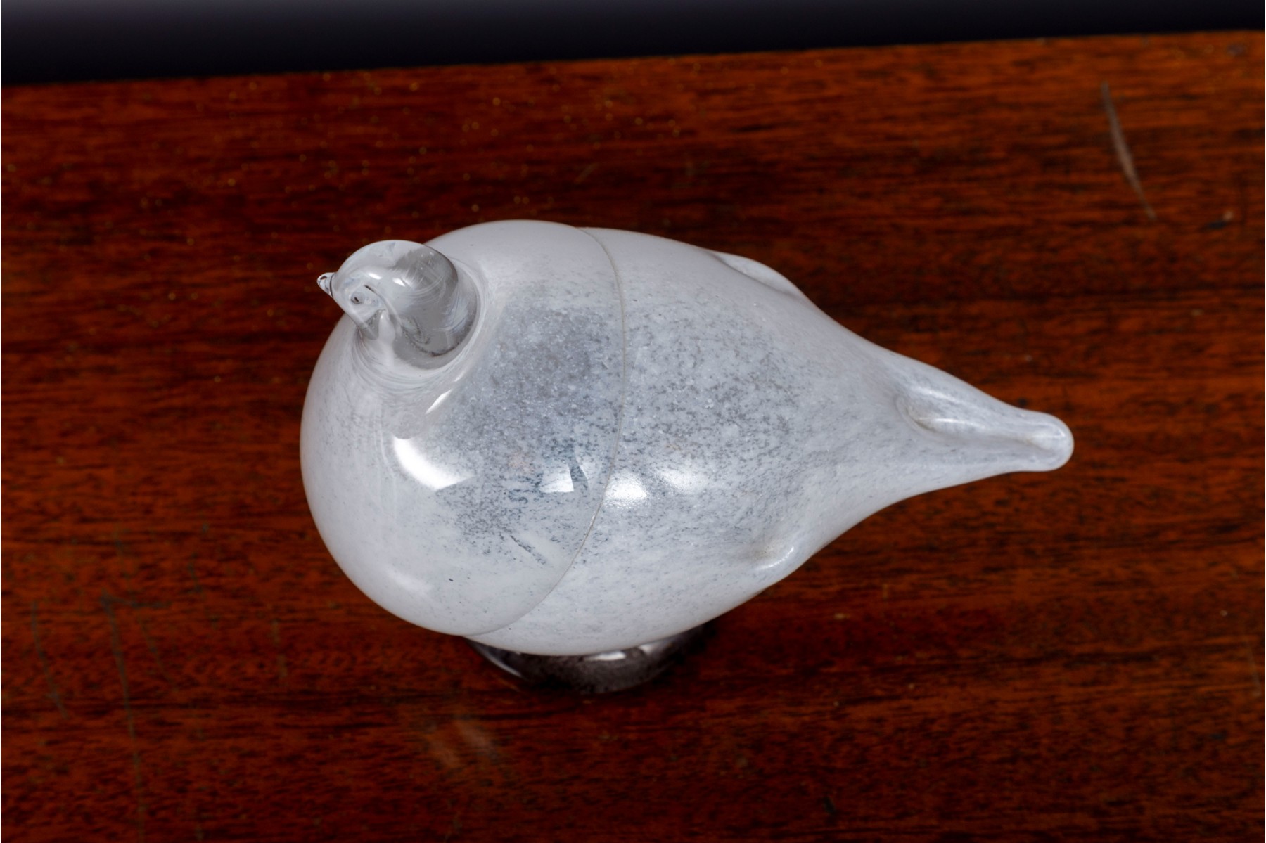 Oiva Toikka (Finnish, 1931-2019) art glass sculpture of a rotund bird in clear and white over a dark round foot.