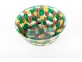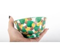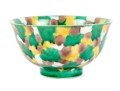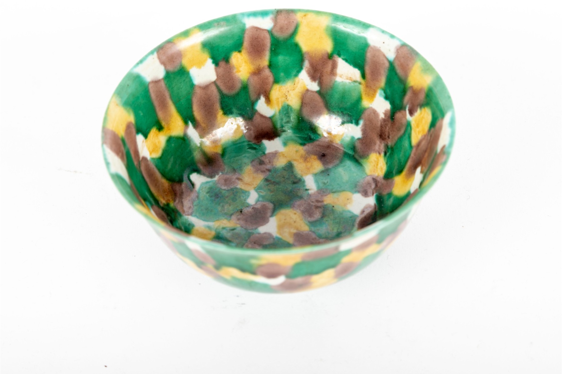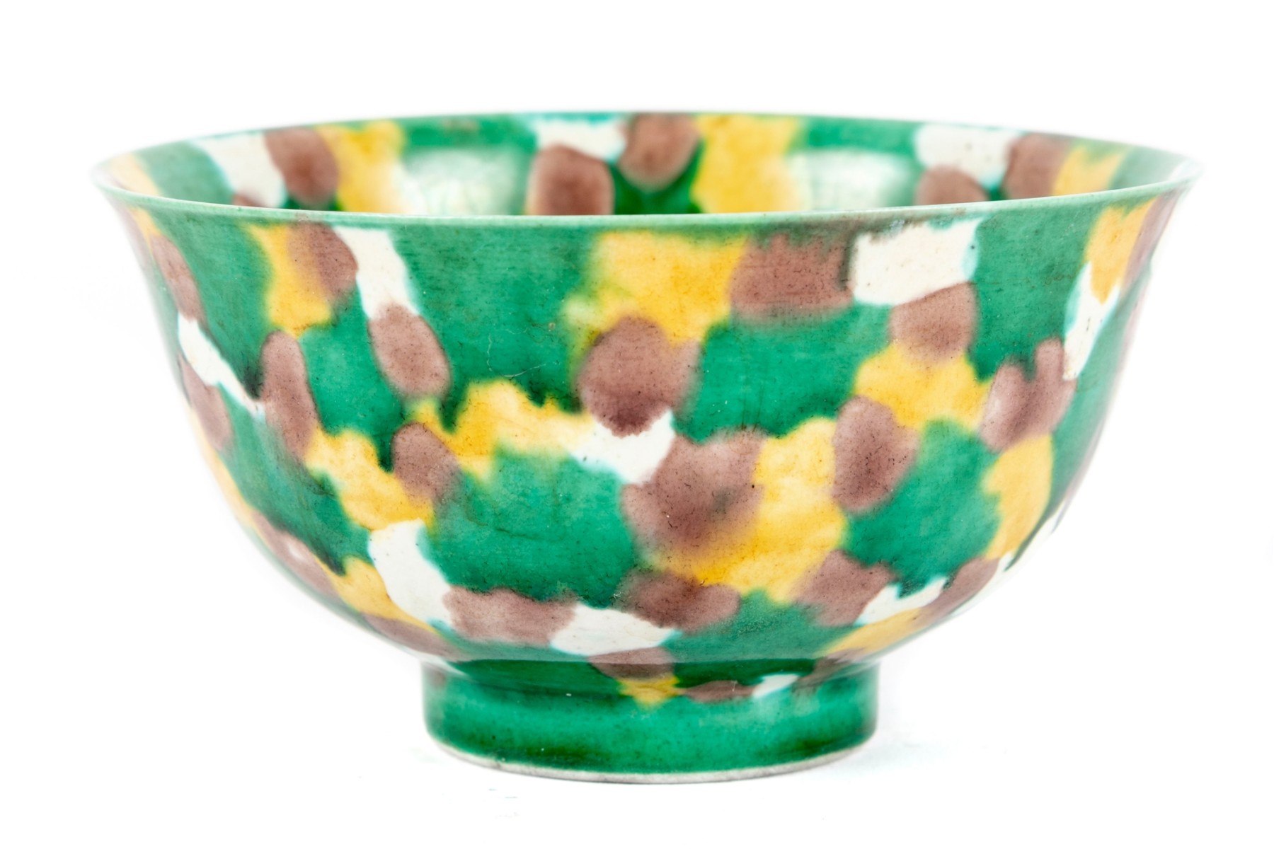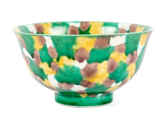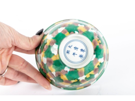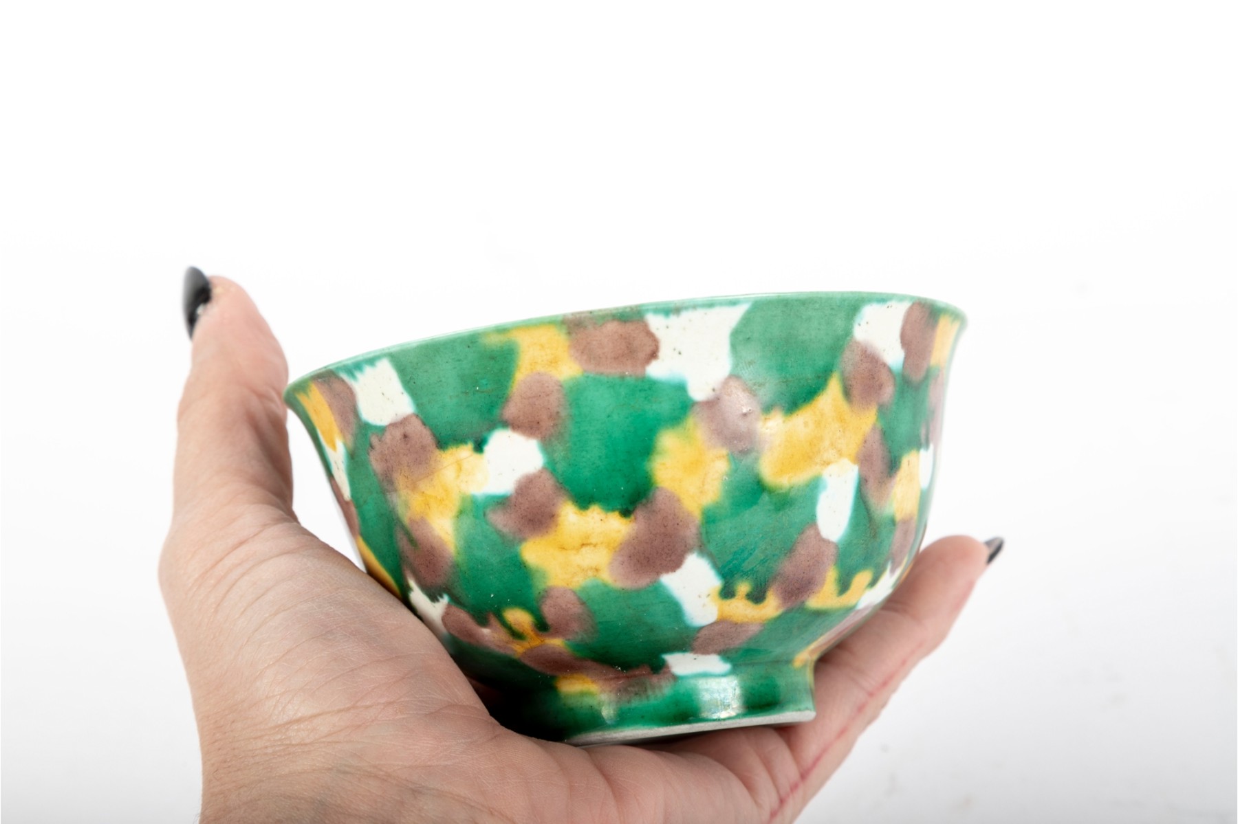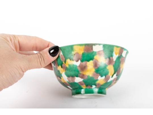 This antique rice bowl from the Kangxi Dynasty features a vibrant glaze in contending colors: green, white, yellow, and purple. The bowl showcases the hallmark splendor of Chinese ceramics from the period, characterized by its rich coloration and unique glazing techniques. The Kangxi reign mark is inscribed at the bottom in traditional characters.