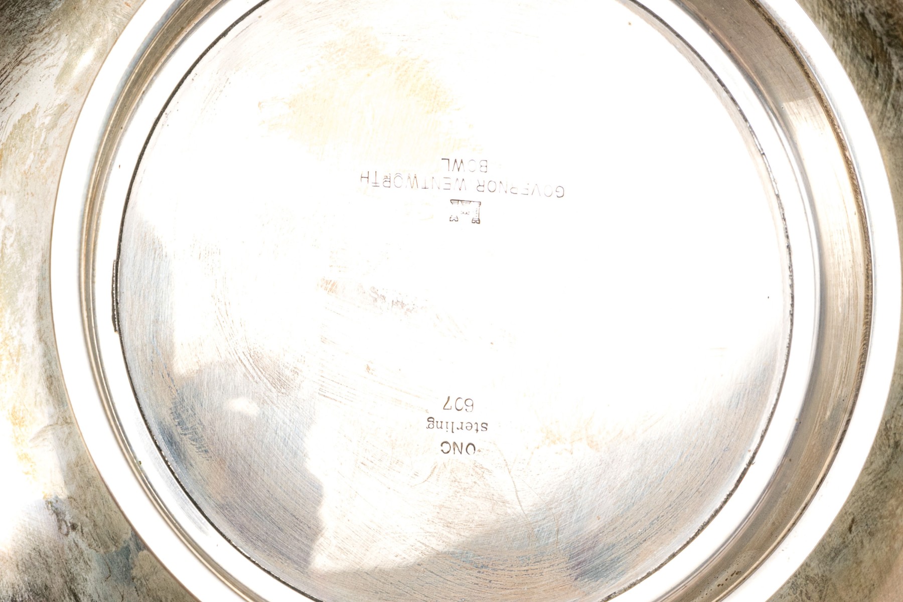 Marks on the base. A circular bowl with a scalloped rim and a ring base. Wentworth was the British colonial governor of NH at the time of the American revolution. The bowl is crafted in an 18th century style.