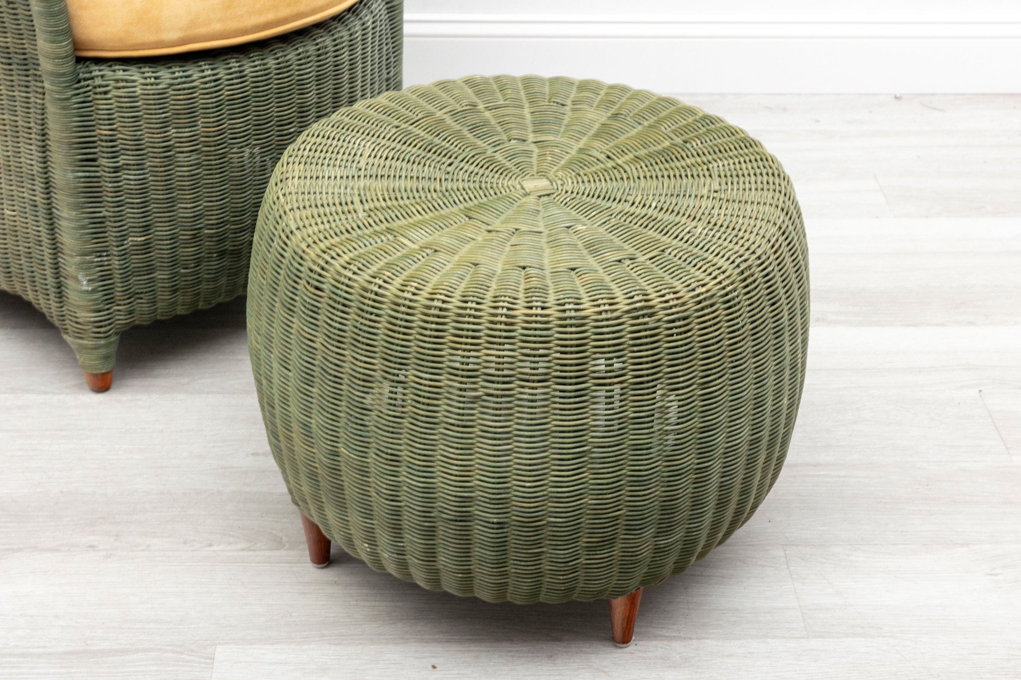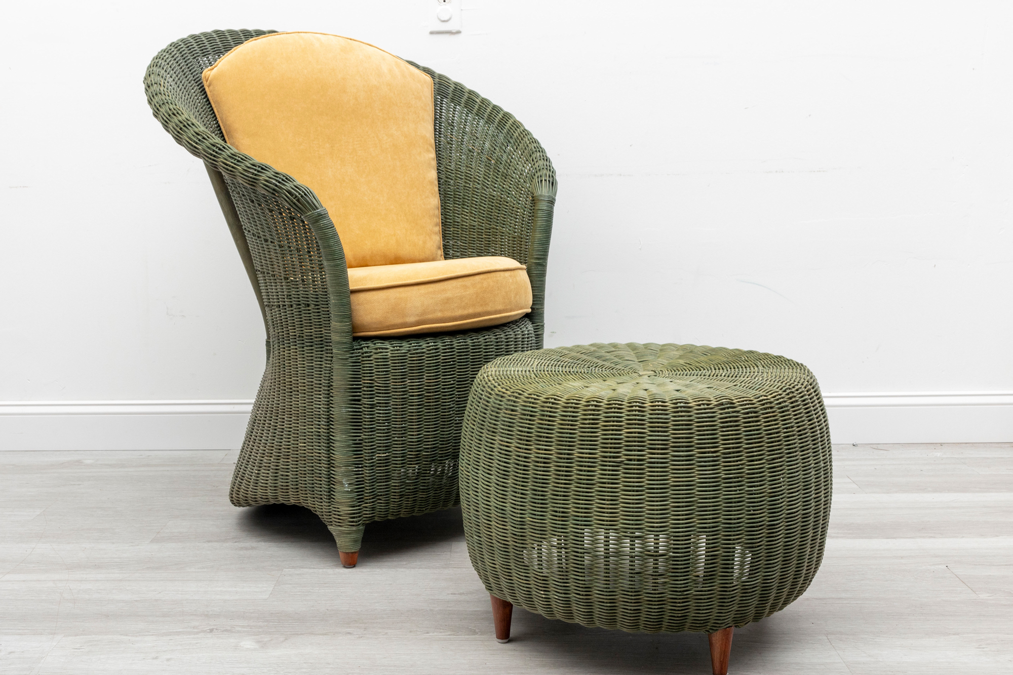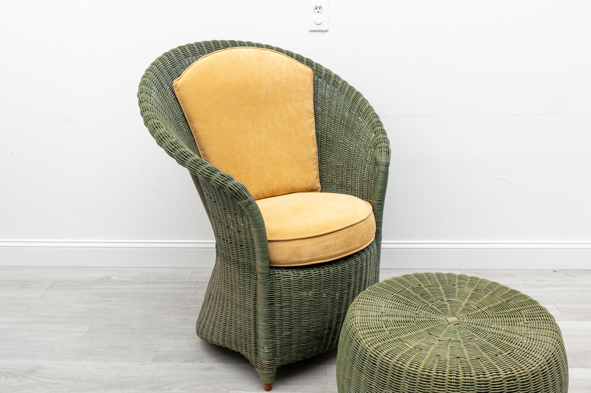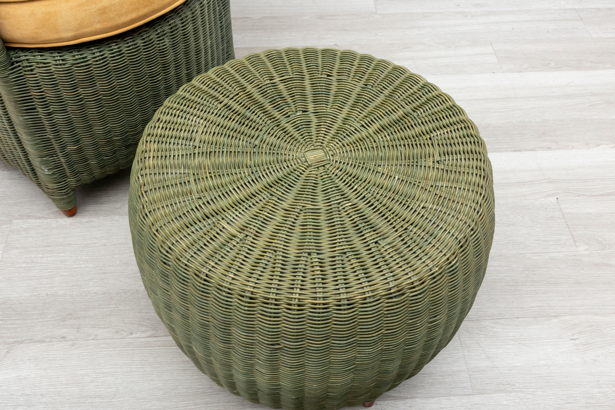An olive green wicker-woven rattan tub chair with khaki upholstered seat cushions. Matching ottoman included.