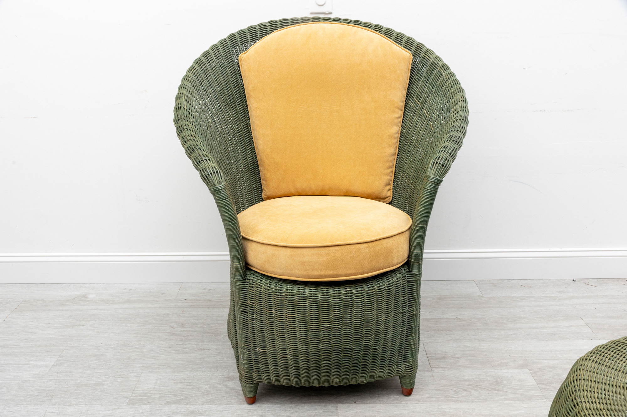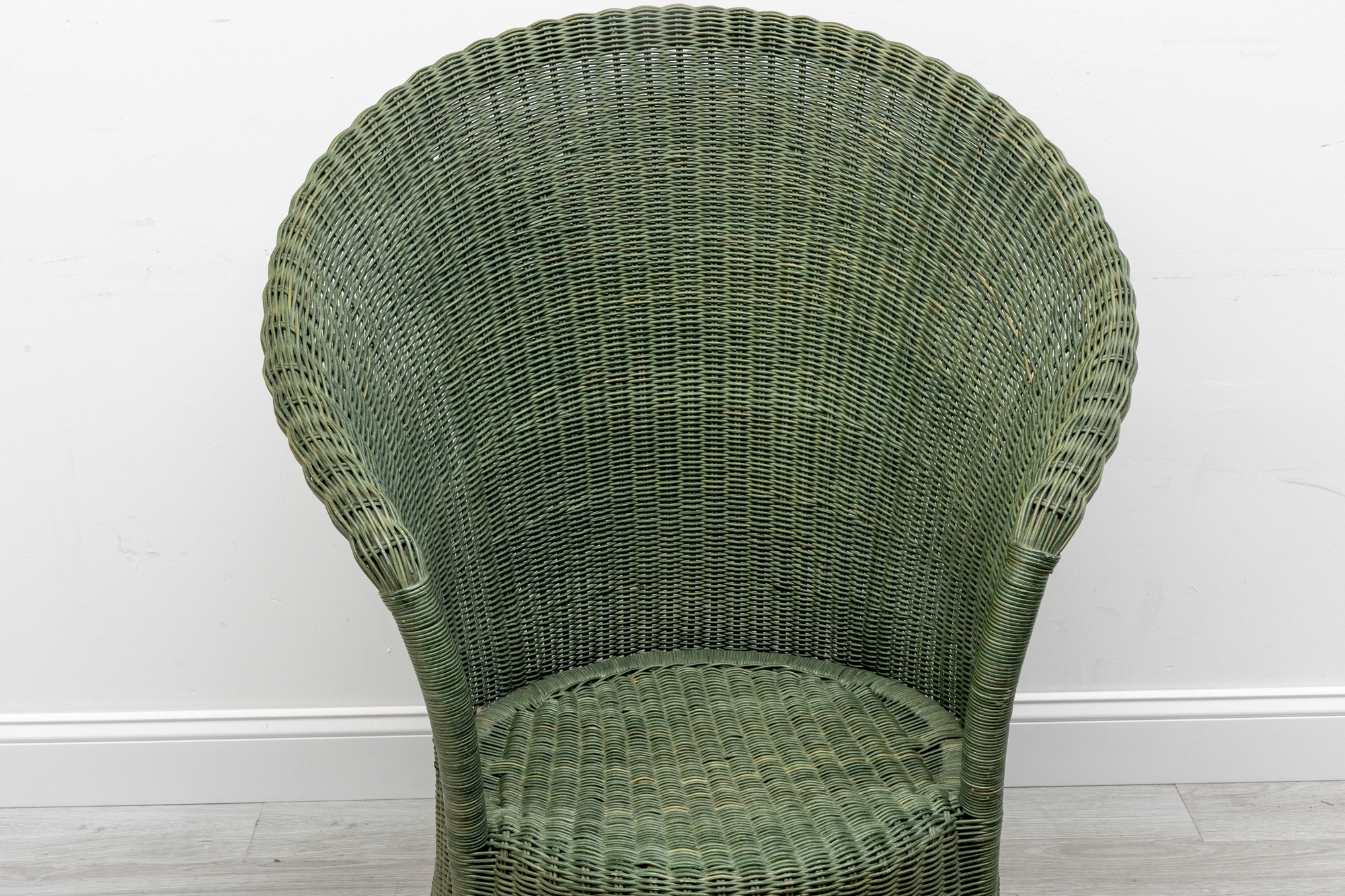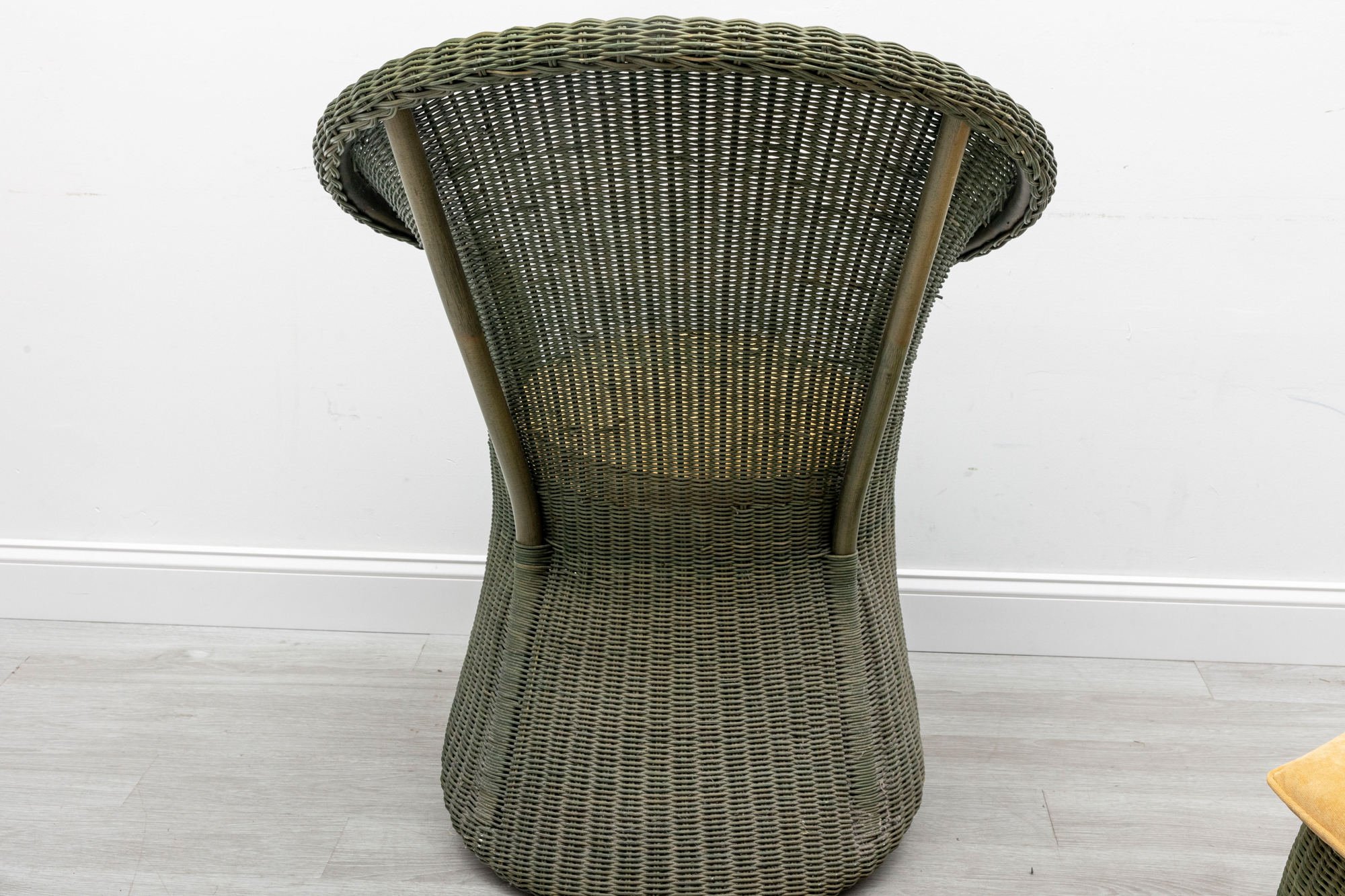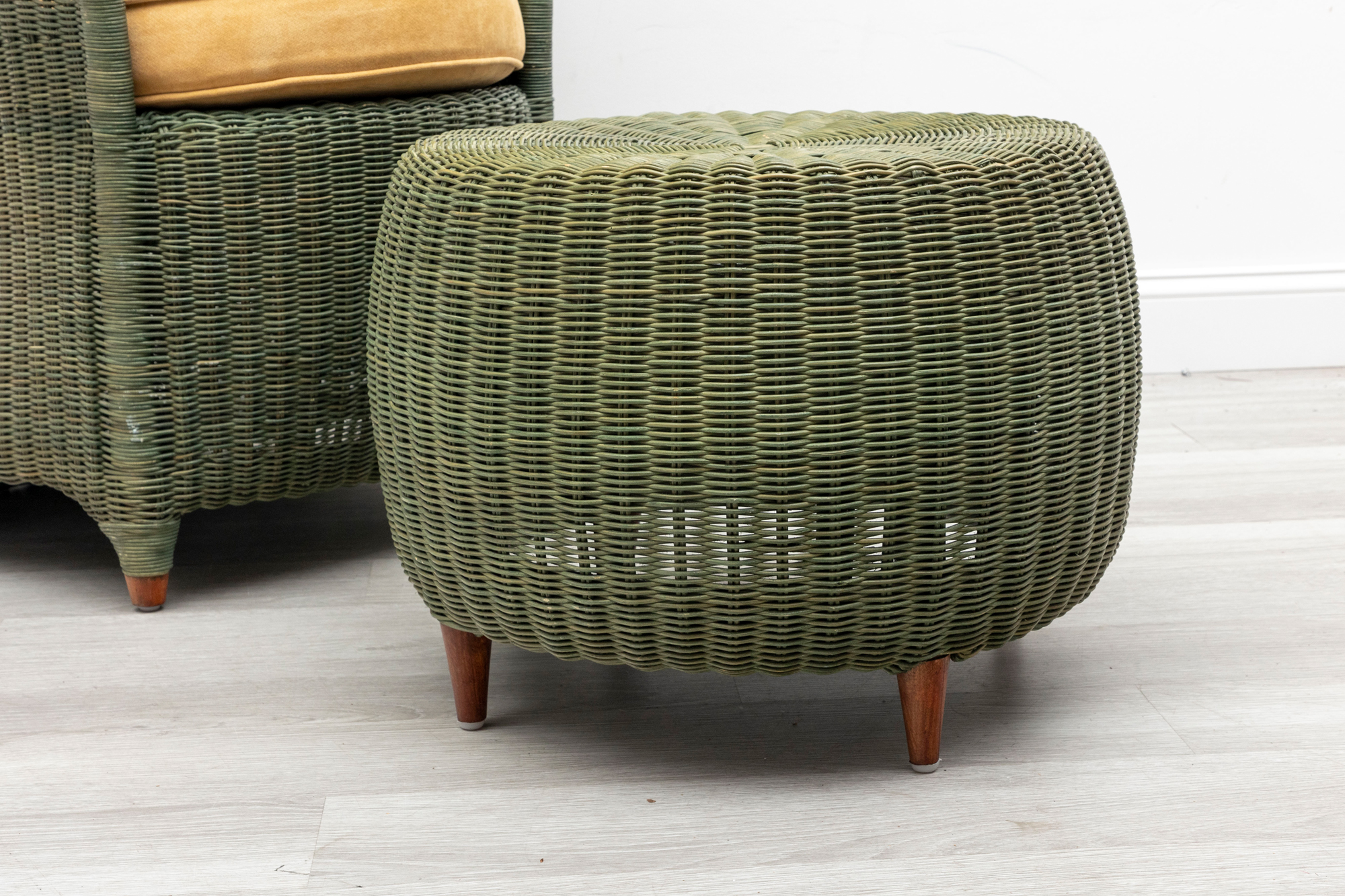 An olive green wicker-woven rattan tub chair with khaki upholstered seat cushions. Matching ottoman included.