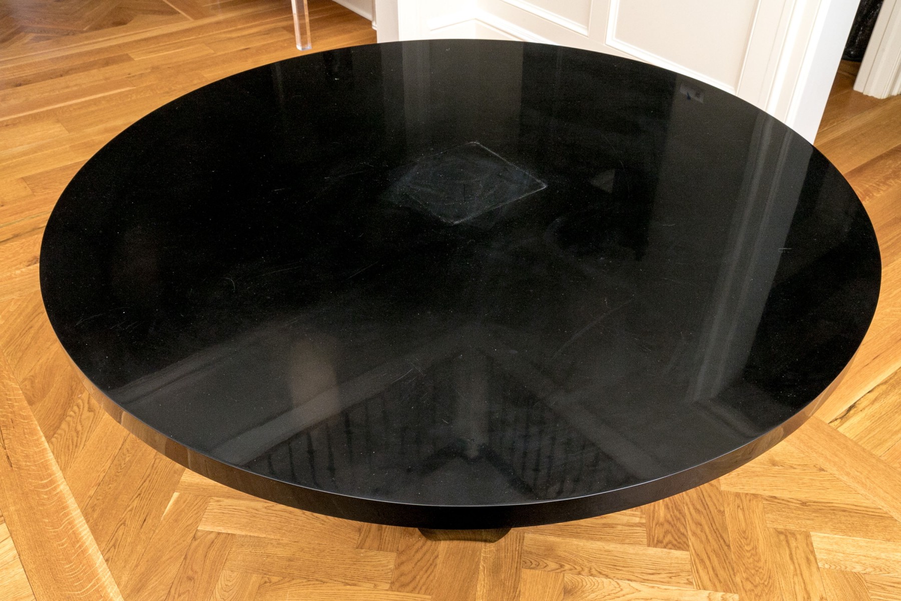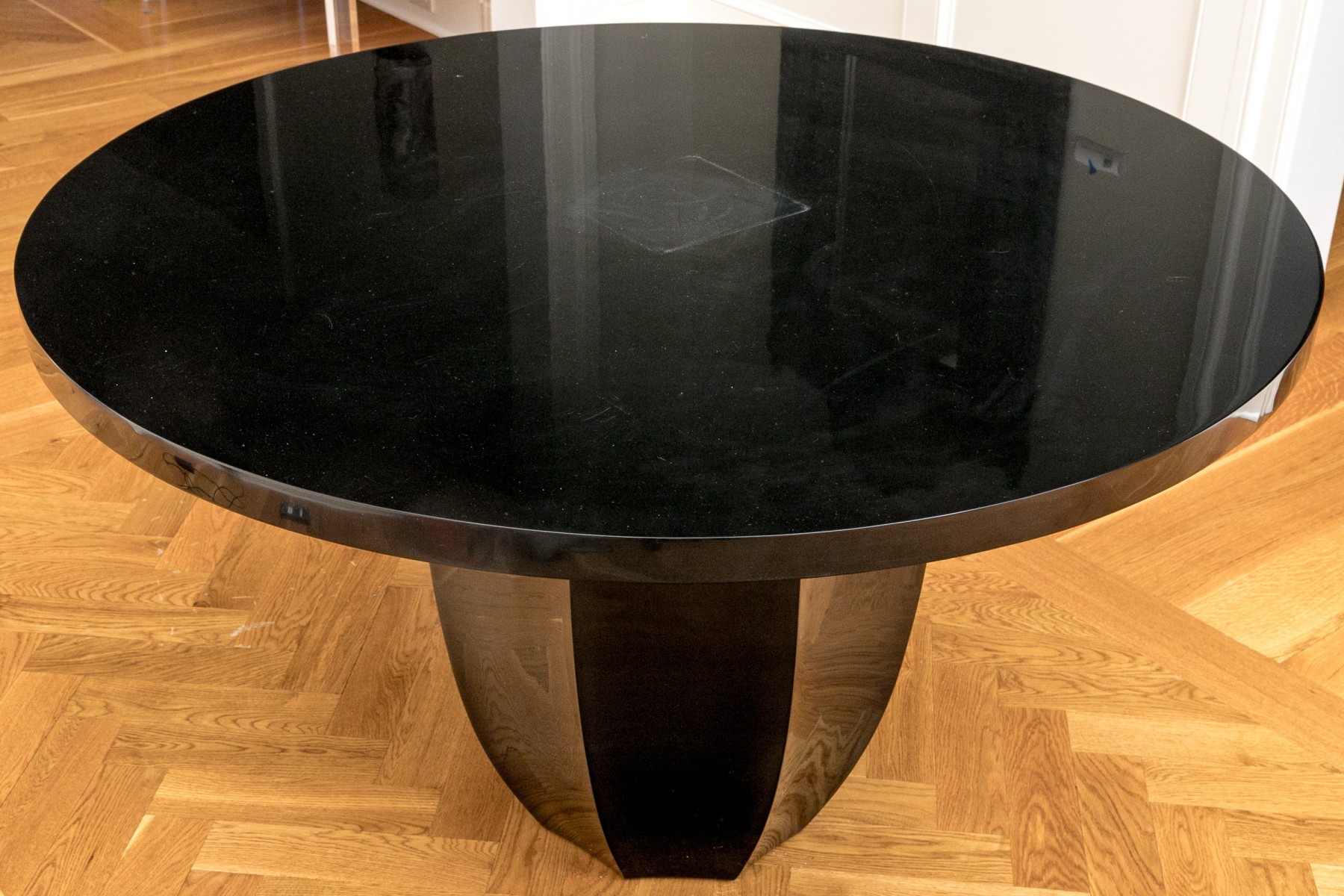 Condition: There is some surface scuffing and wear to the lacquered finish, one space can be seen in the lot images. There are other minor surface scuffs around but overall, the circular table presents handsomely.