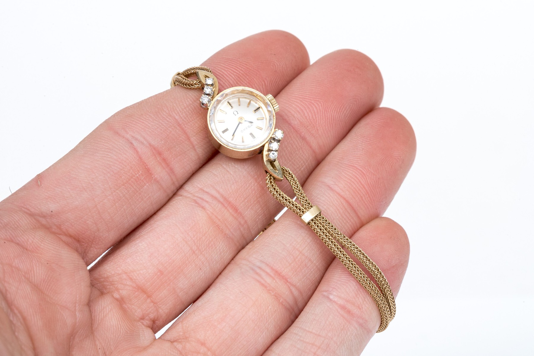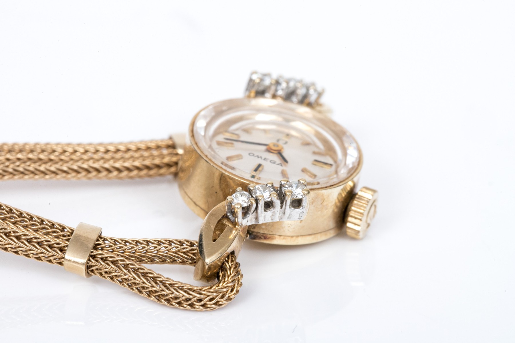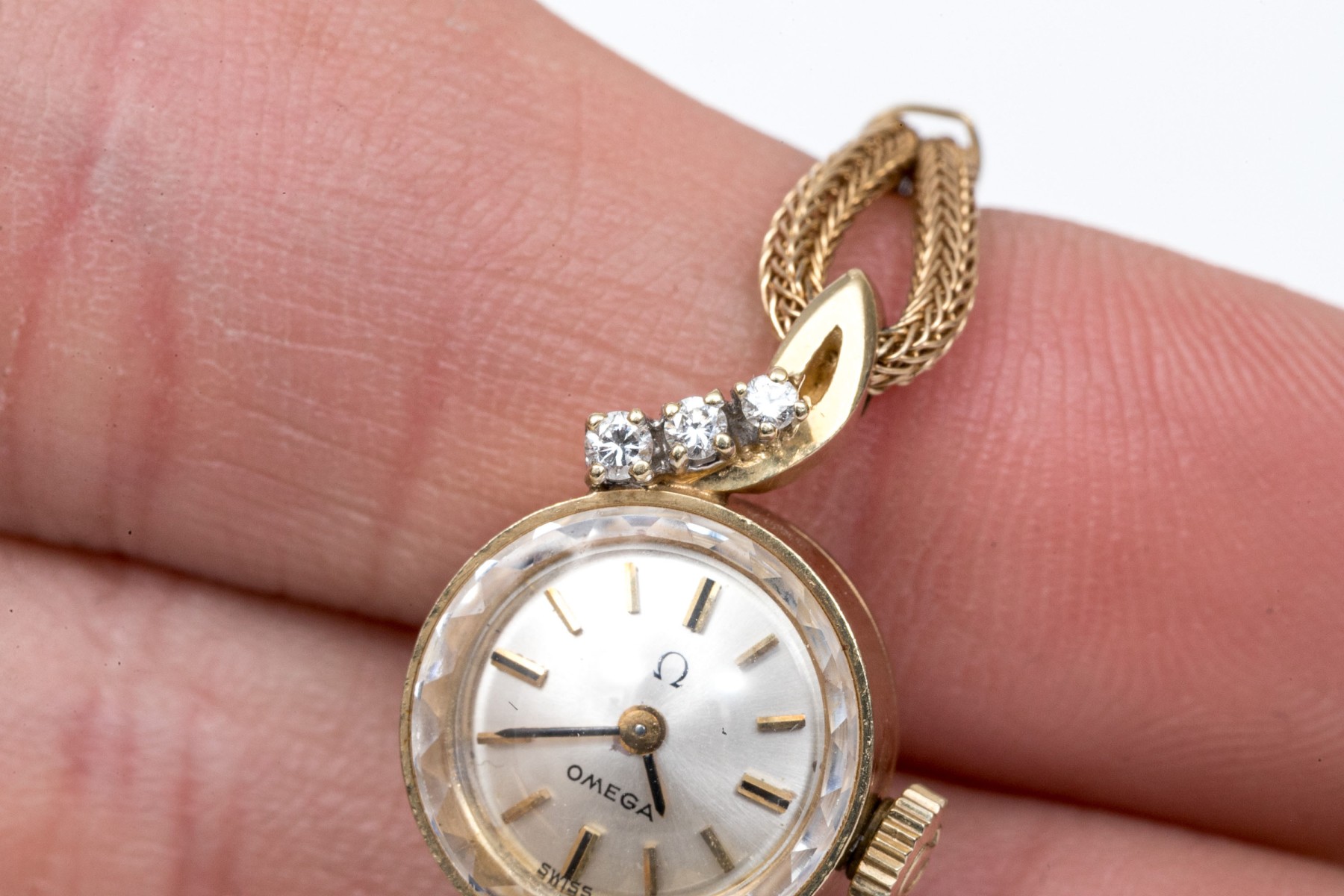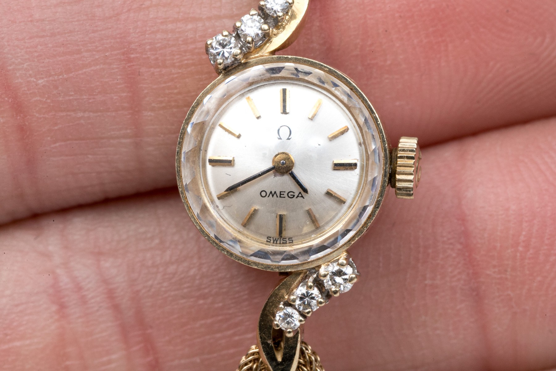 14k yellow gold watch. This lovely, ultra-small vintage Omega watch is a round case, silvered dial, with black and gold stick markers, hand wound mechanical, and a gold mesh strap and buckle, with a safety chain. The watch is finished with round faceted diamond lugs, 0.14 TCW, prong set