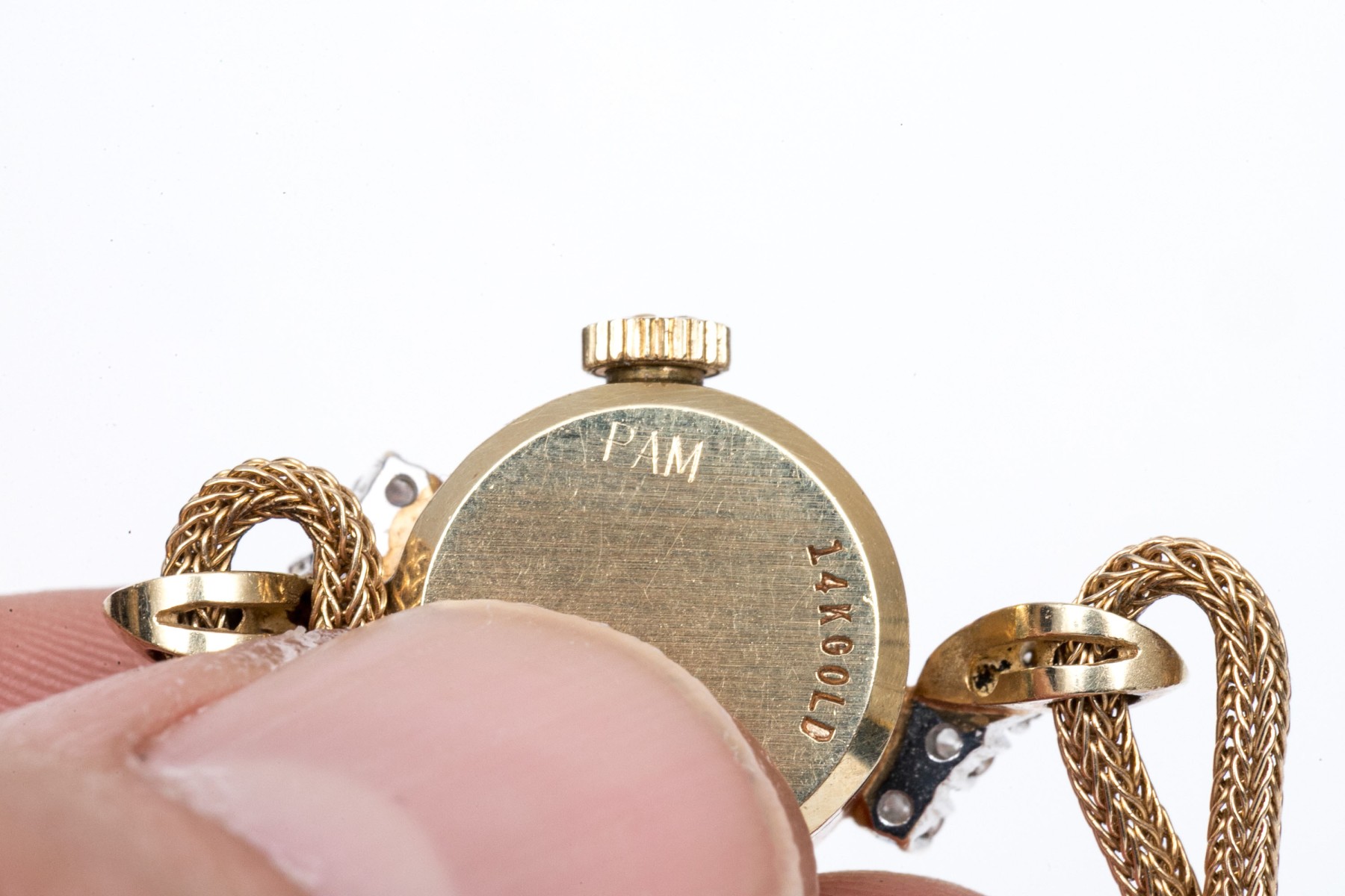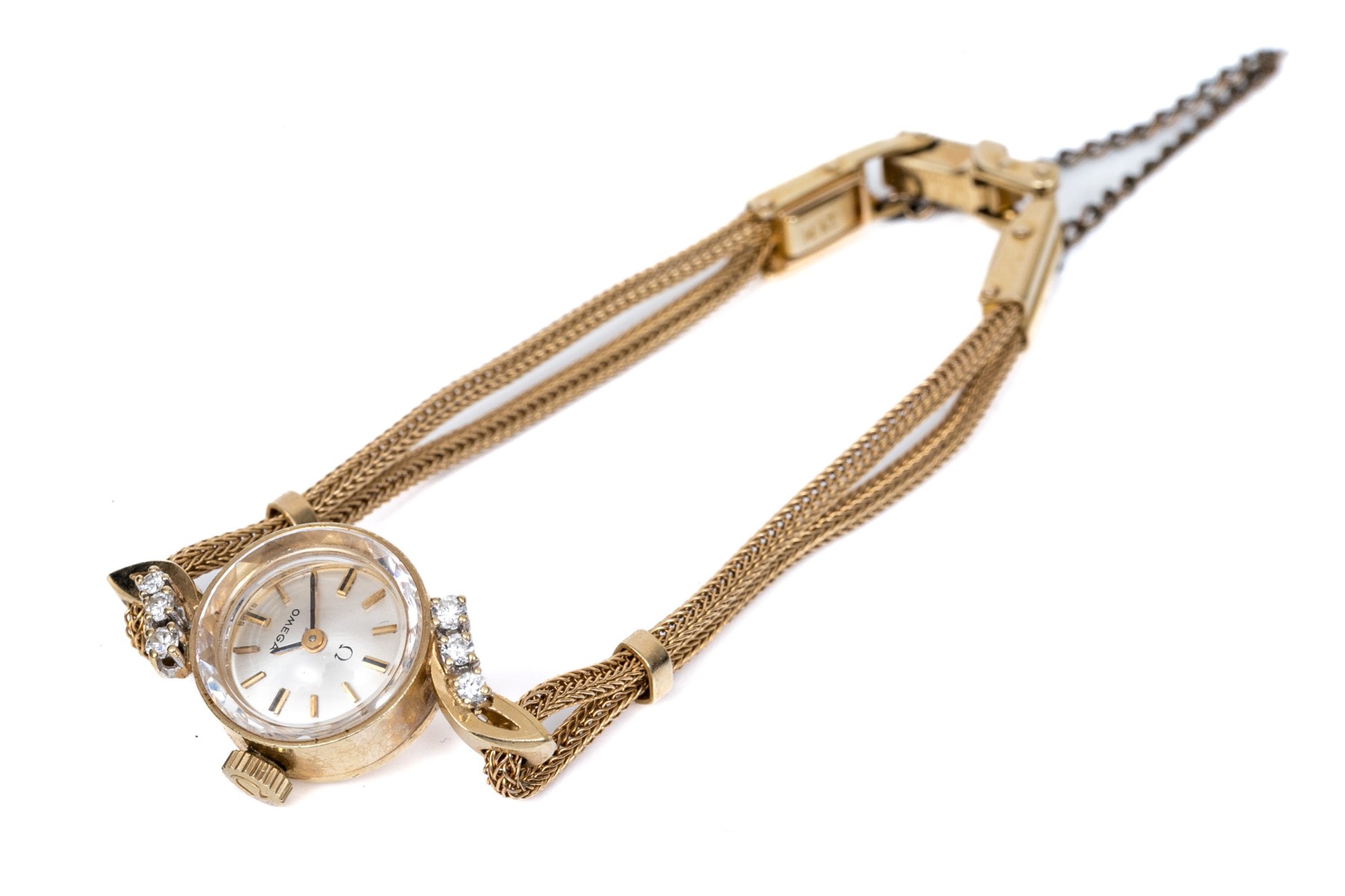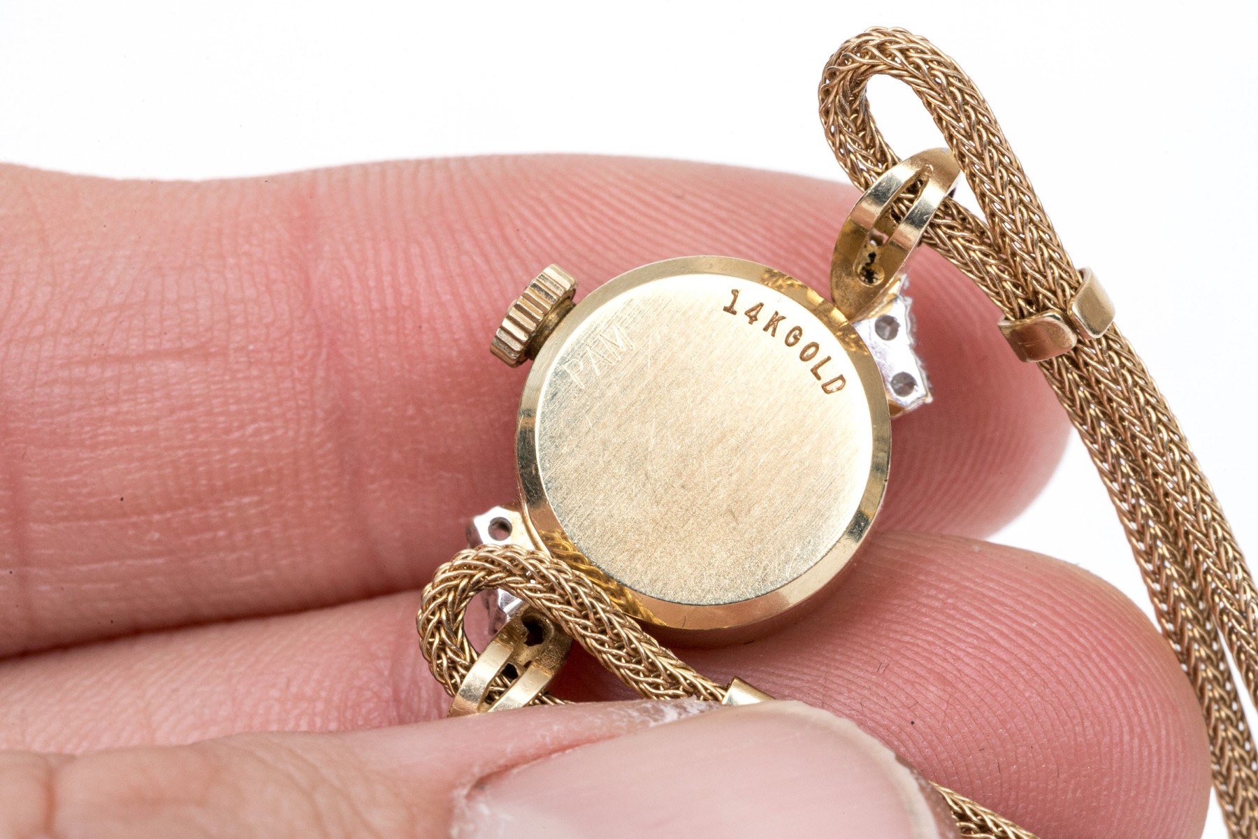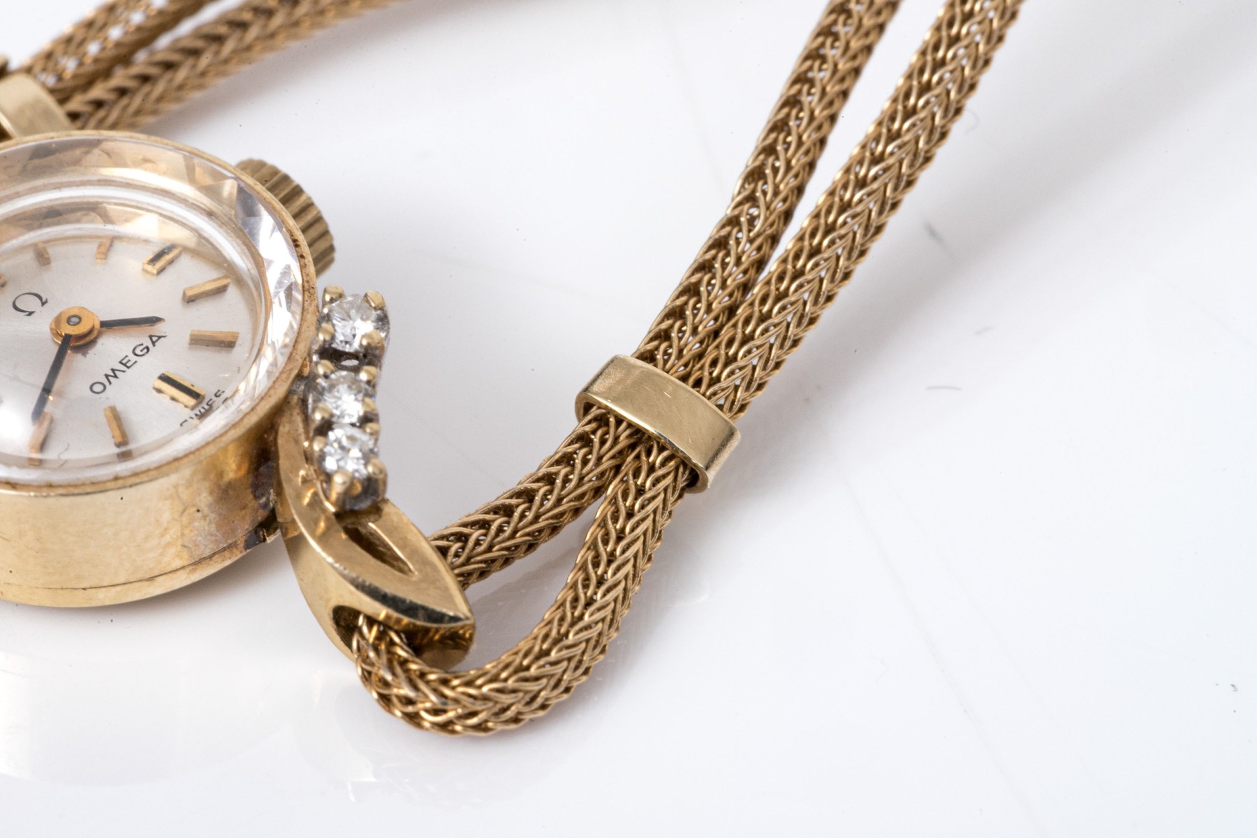 14k yellow gold watch. This lovely, ultra-small vintage Omega watch is a round case, silvered dial, with black and gold stick markers, hand wound mechanical, and a gold mesh strap and buckle, with a safety chain. The watch is finished with round faceted diamond lugs, 0.14 TCW, prong set