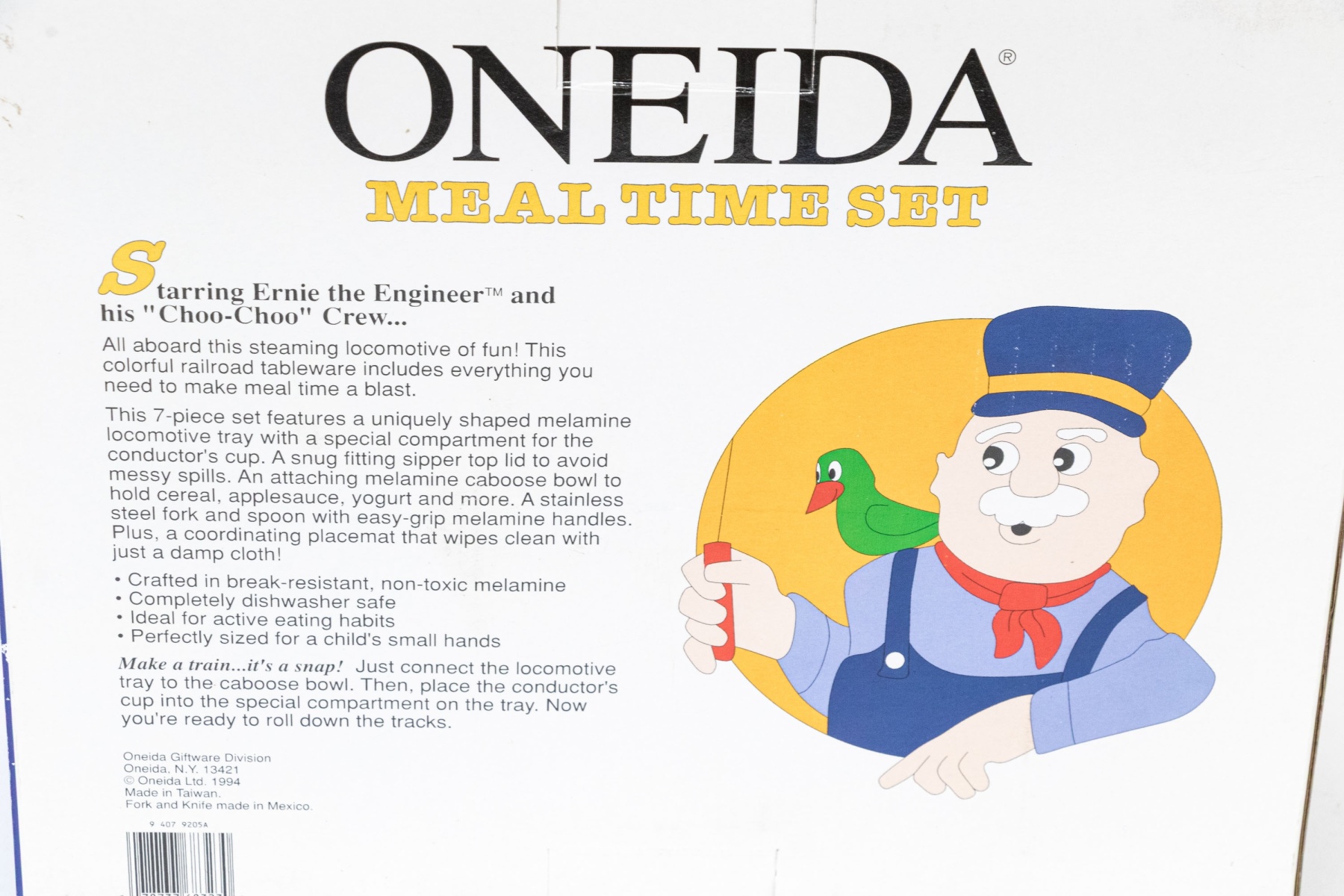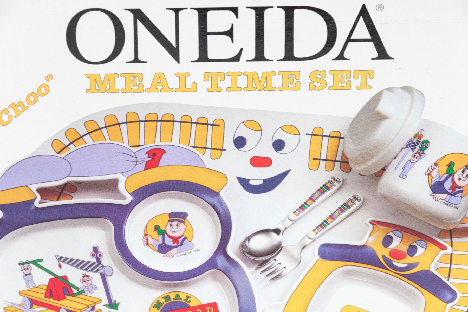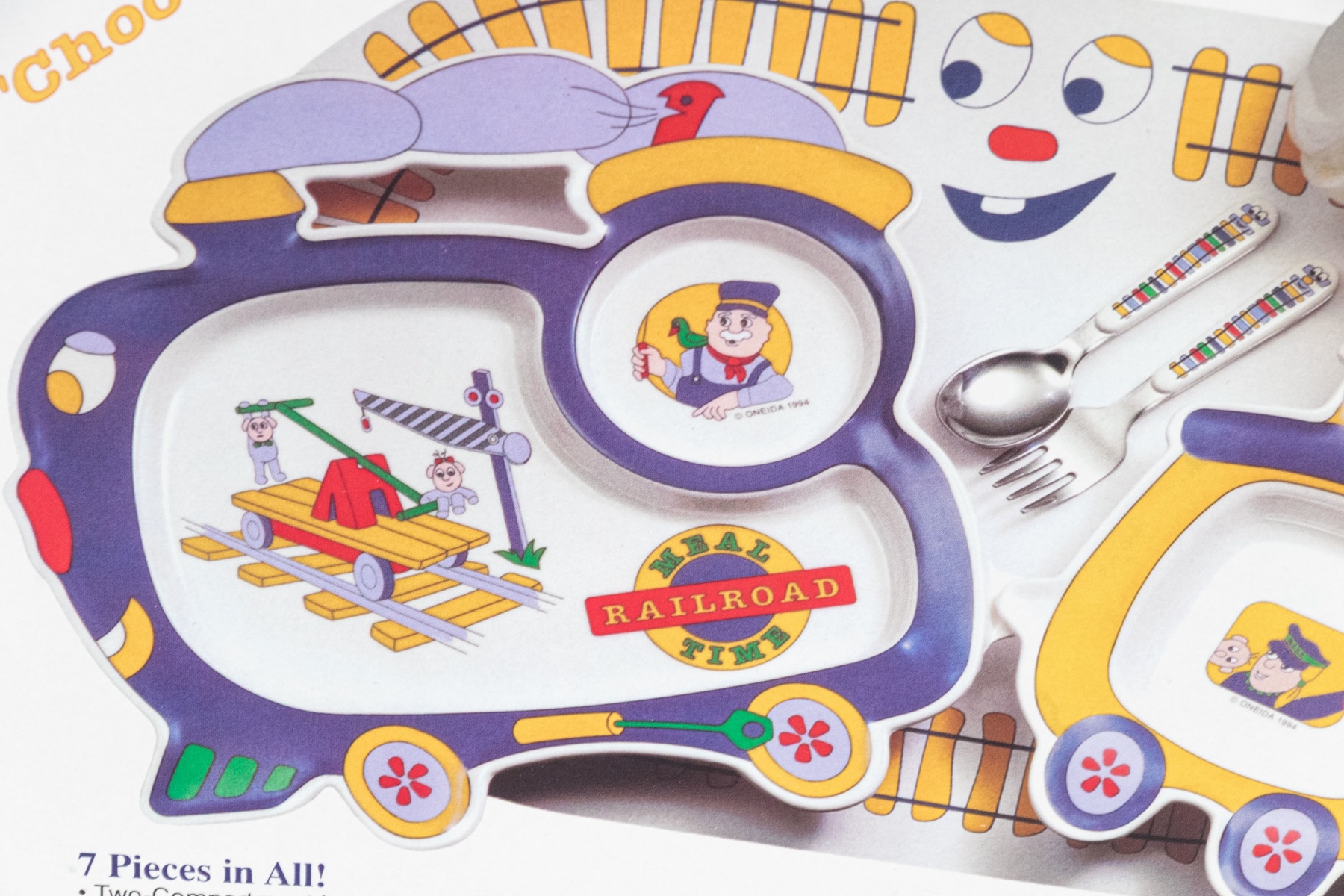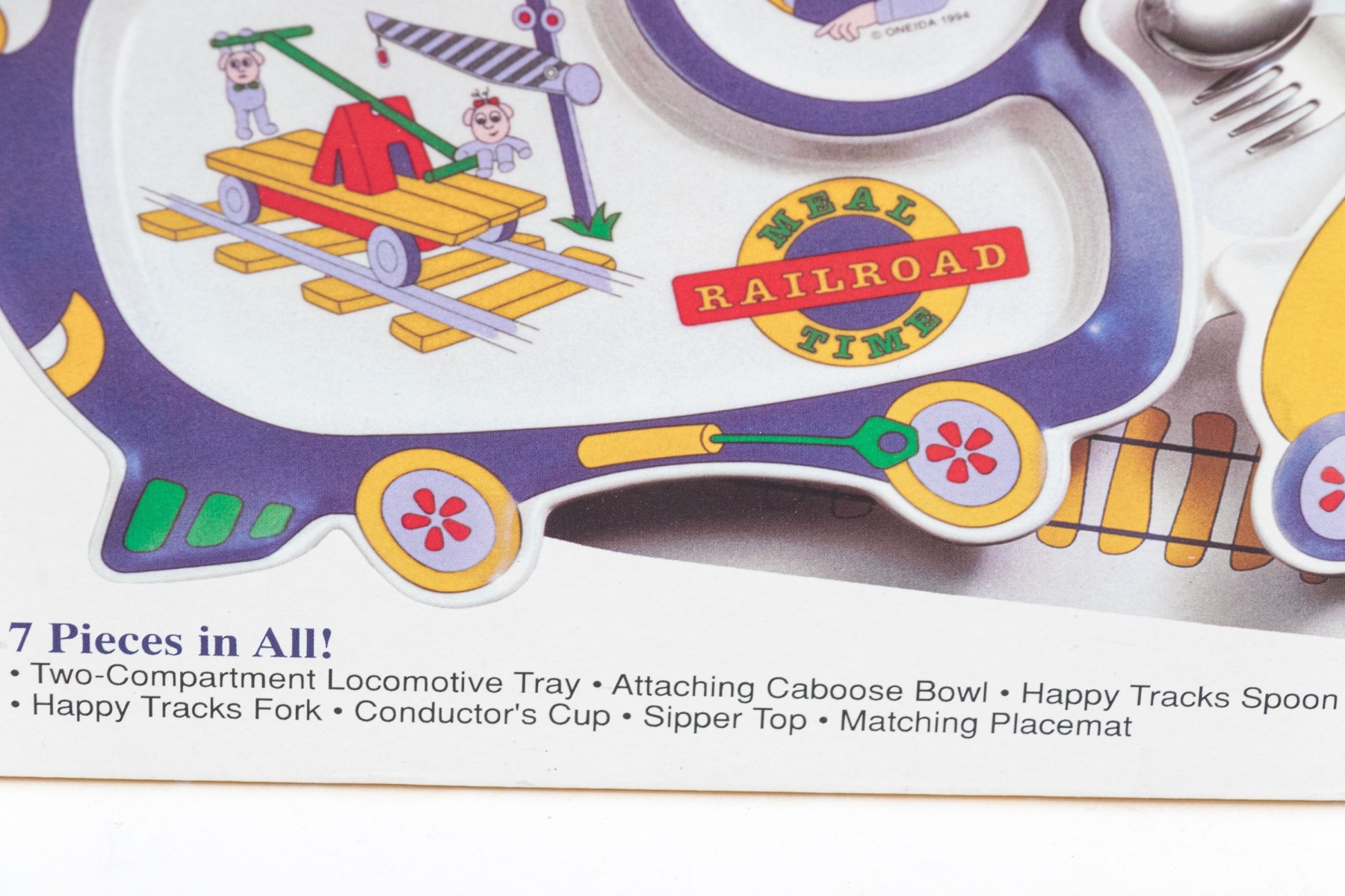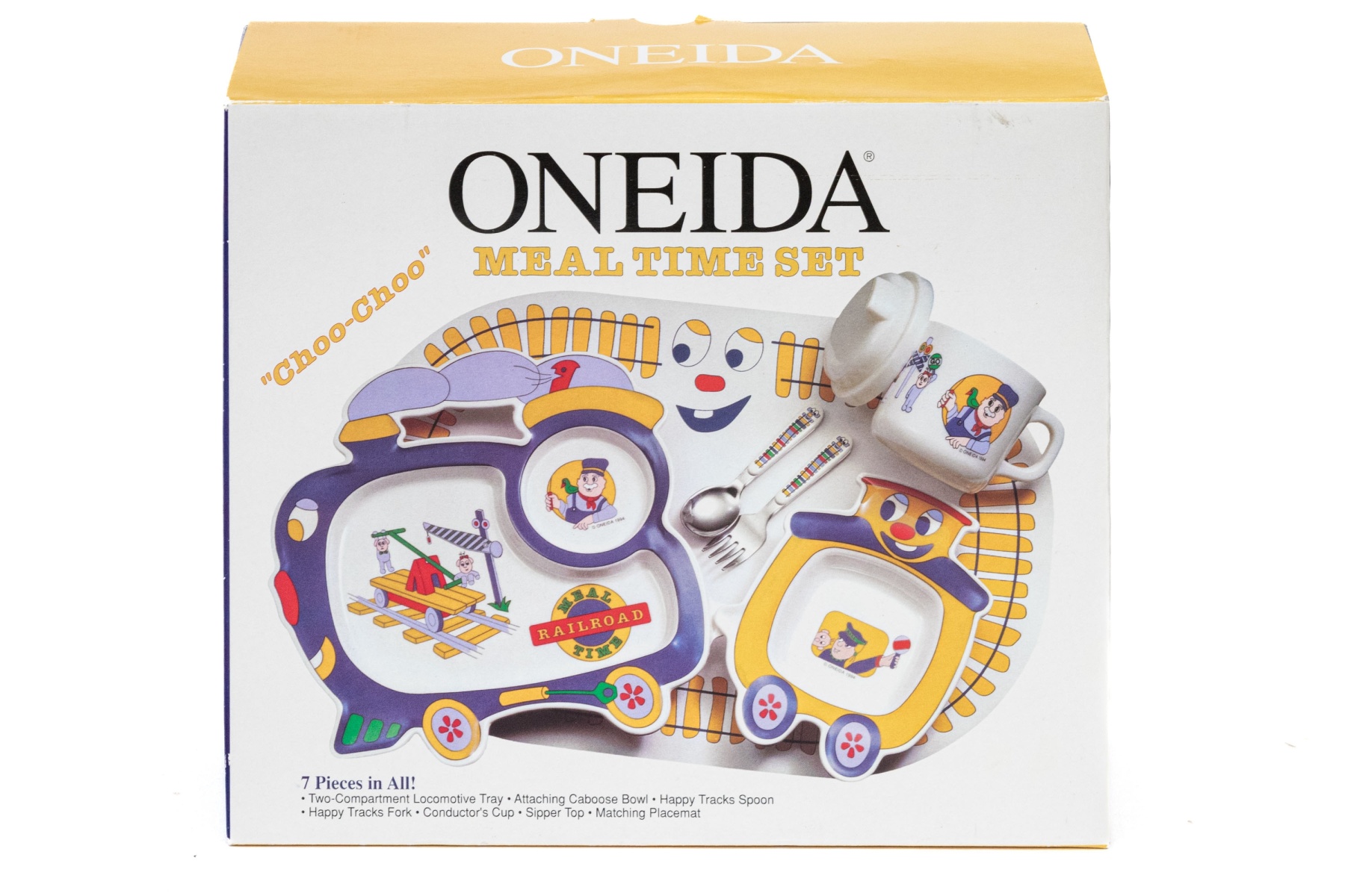 A charming Oneida "Choo-Choo" seven piece meal time set with a fun train theme, including a two-compartment locomotive tray, attaching caboose bowl, happy tracks spoon, happy tracks fork, conductor's cup, sipper top, an a matching placemat.