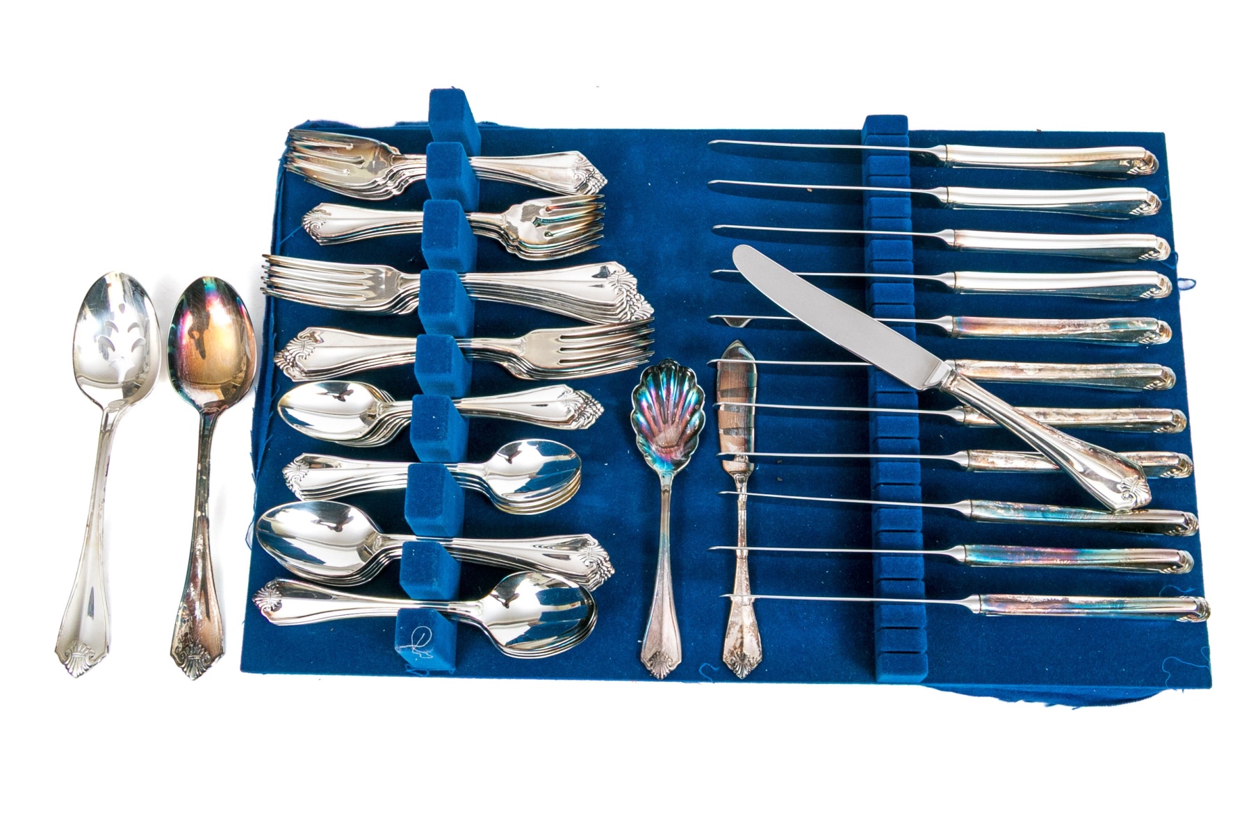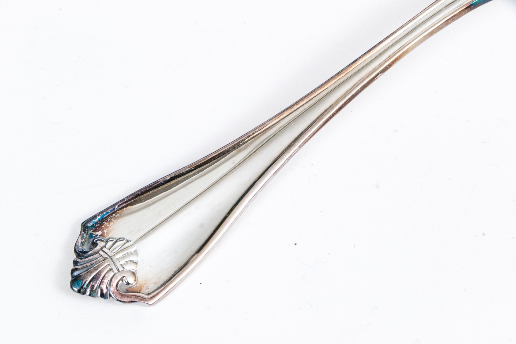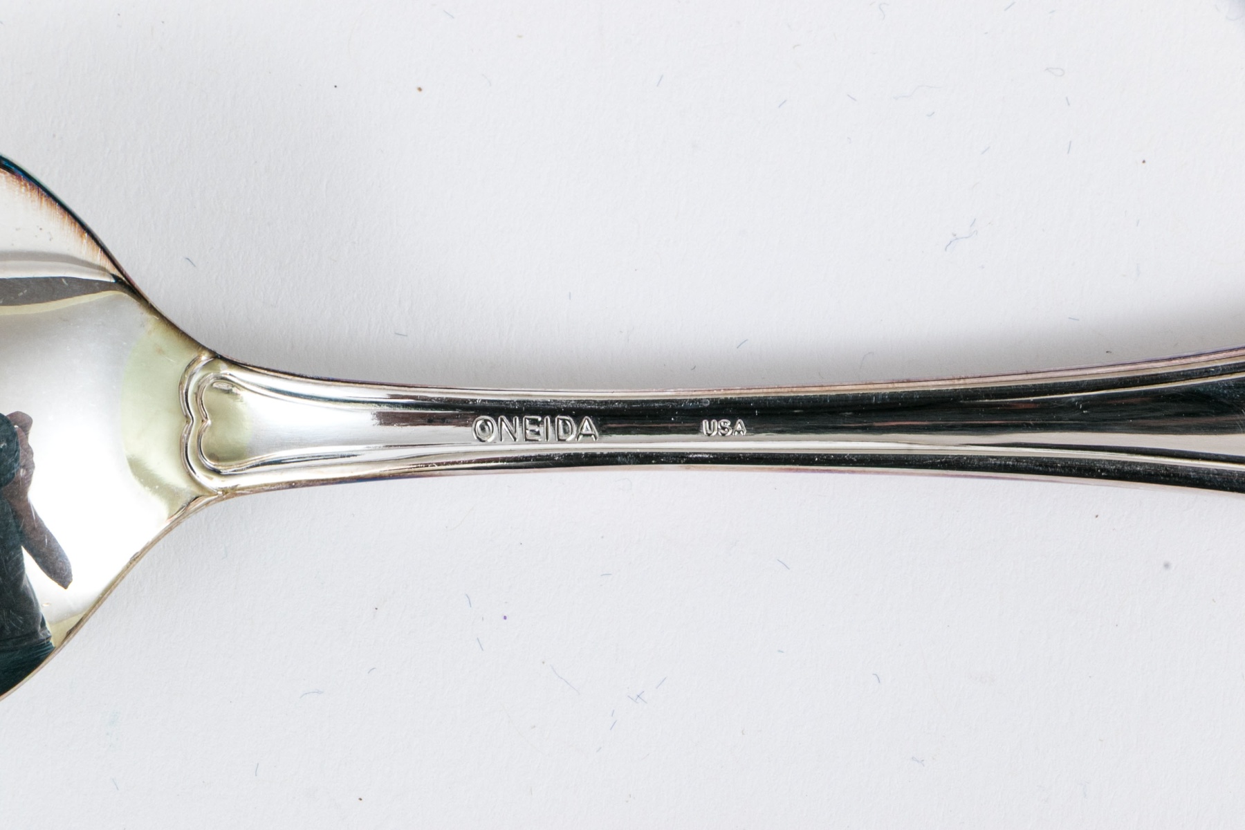 A wonderful collection of Oneida "King James" silver plated flatware designed with elegantly tapered stems and flared shield-form handles with wheat sheaf motifs in relief.