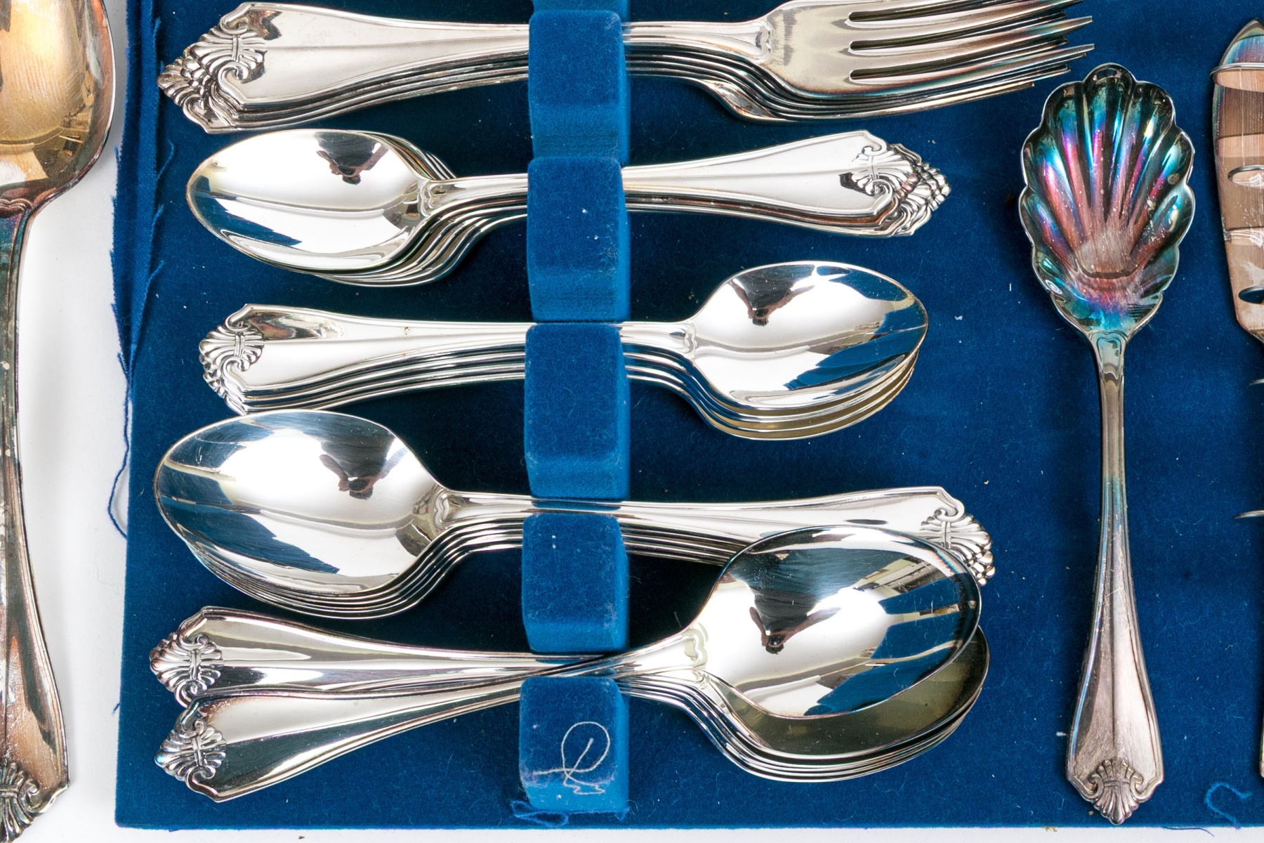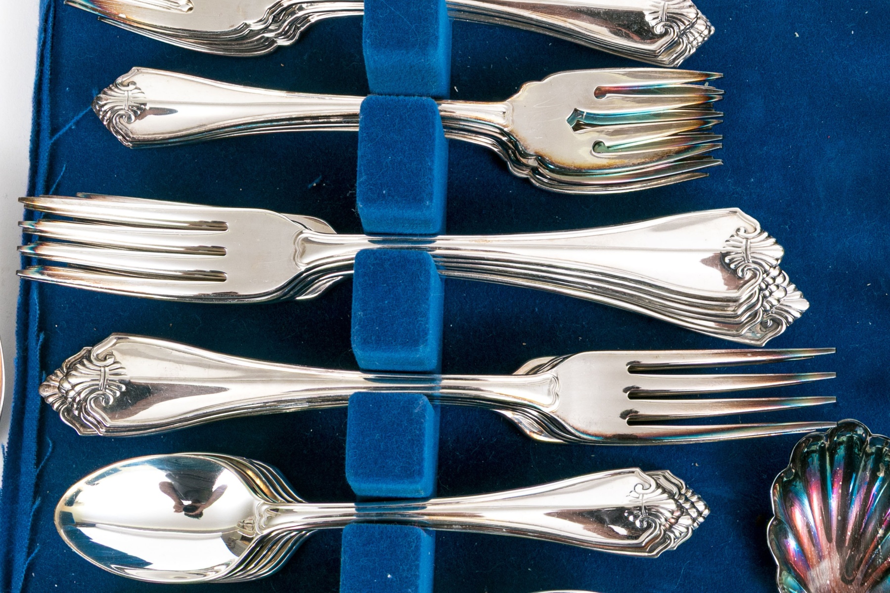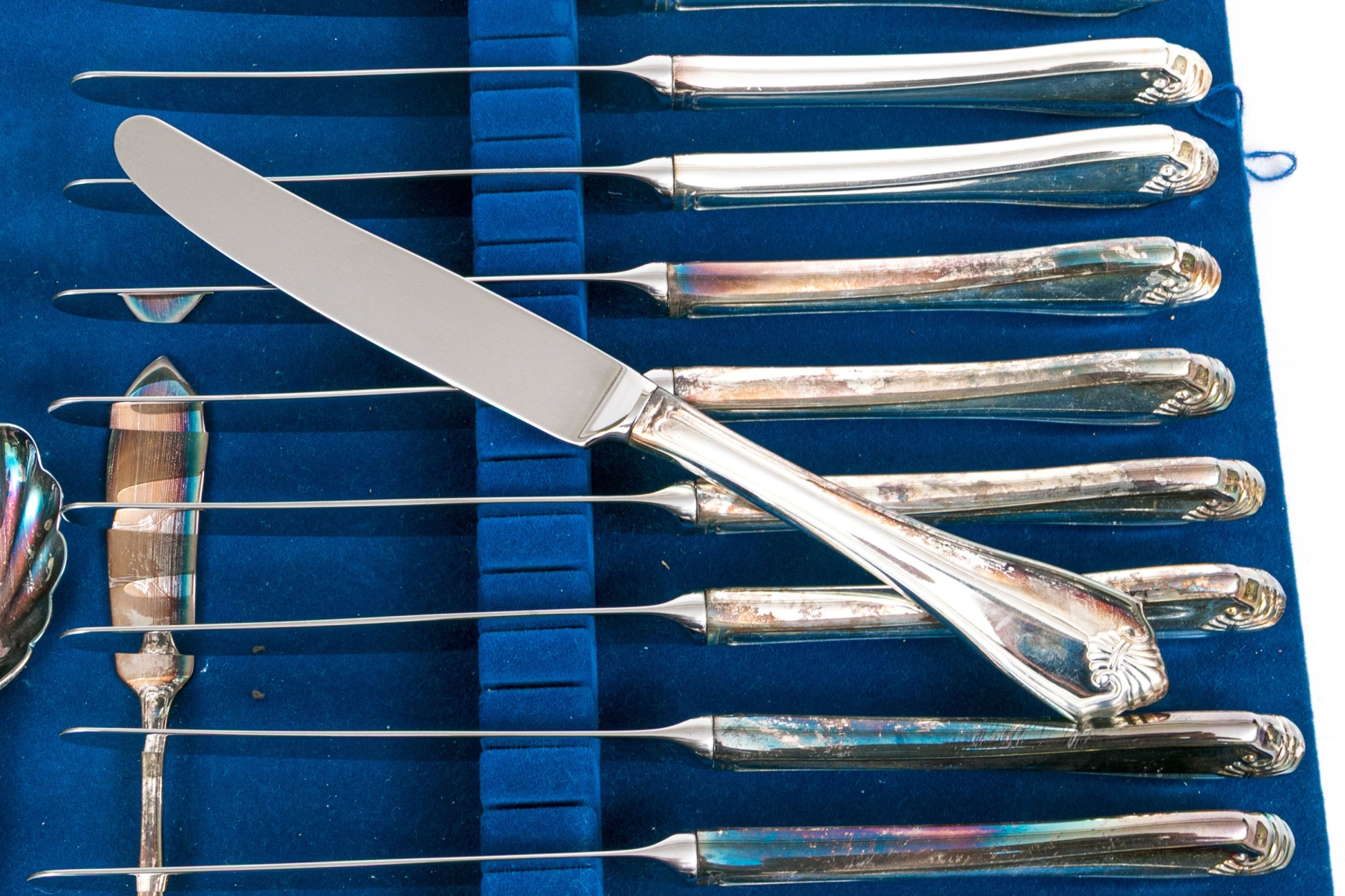 A wonderful collection of Oneida "King James" silver plated flatware designed with elegantly tapered stems and flared shield-form handles with wheat sheaf motifs in relief.
