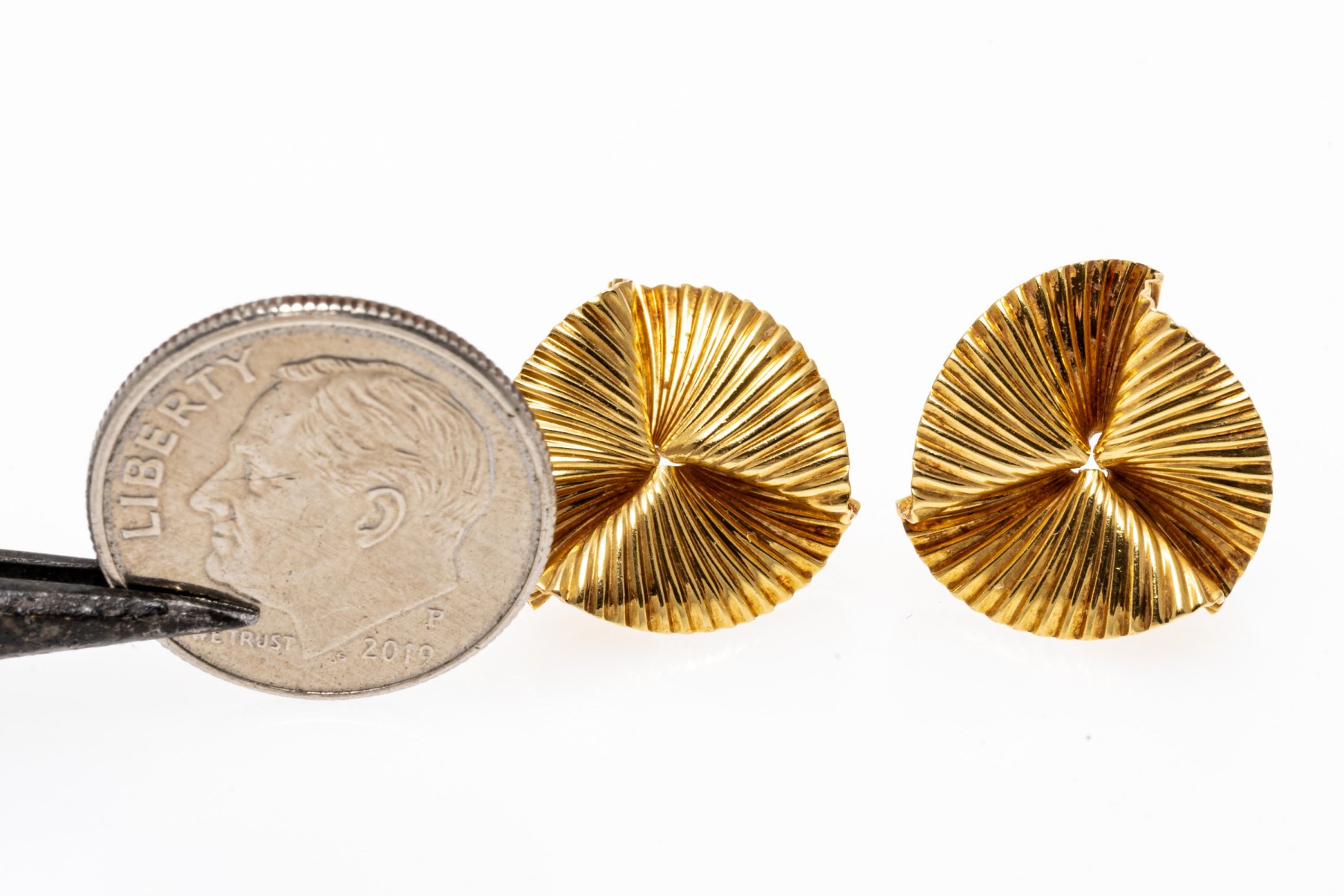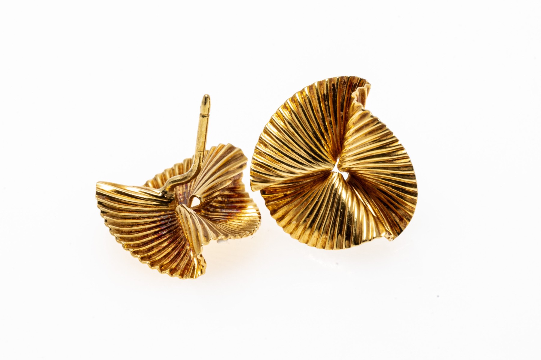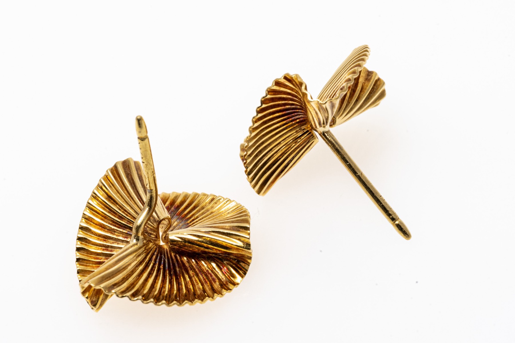 A pair of 18K yellow gold earrings. These earrings have an opposing, ribbed fan design. Post backings.