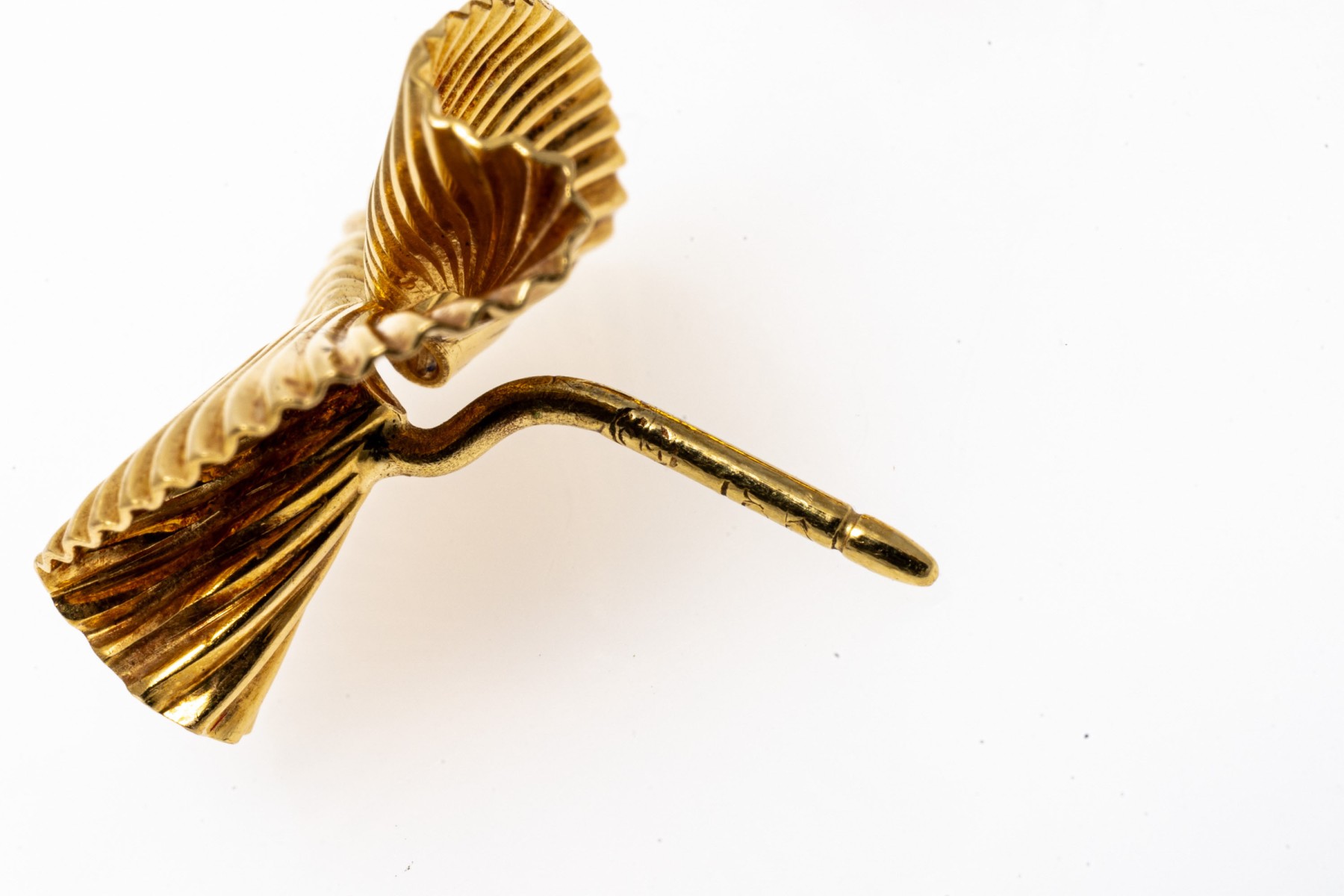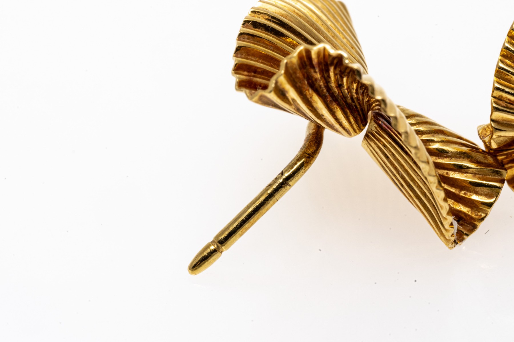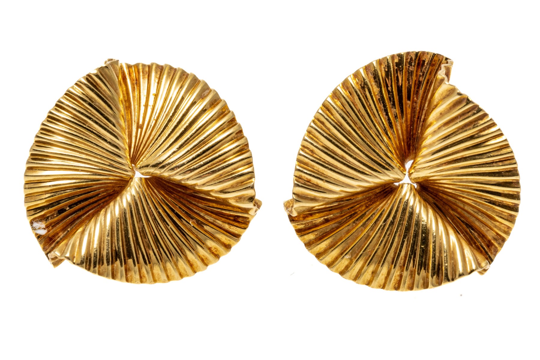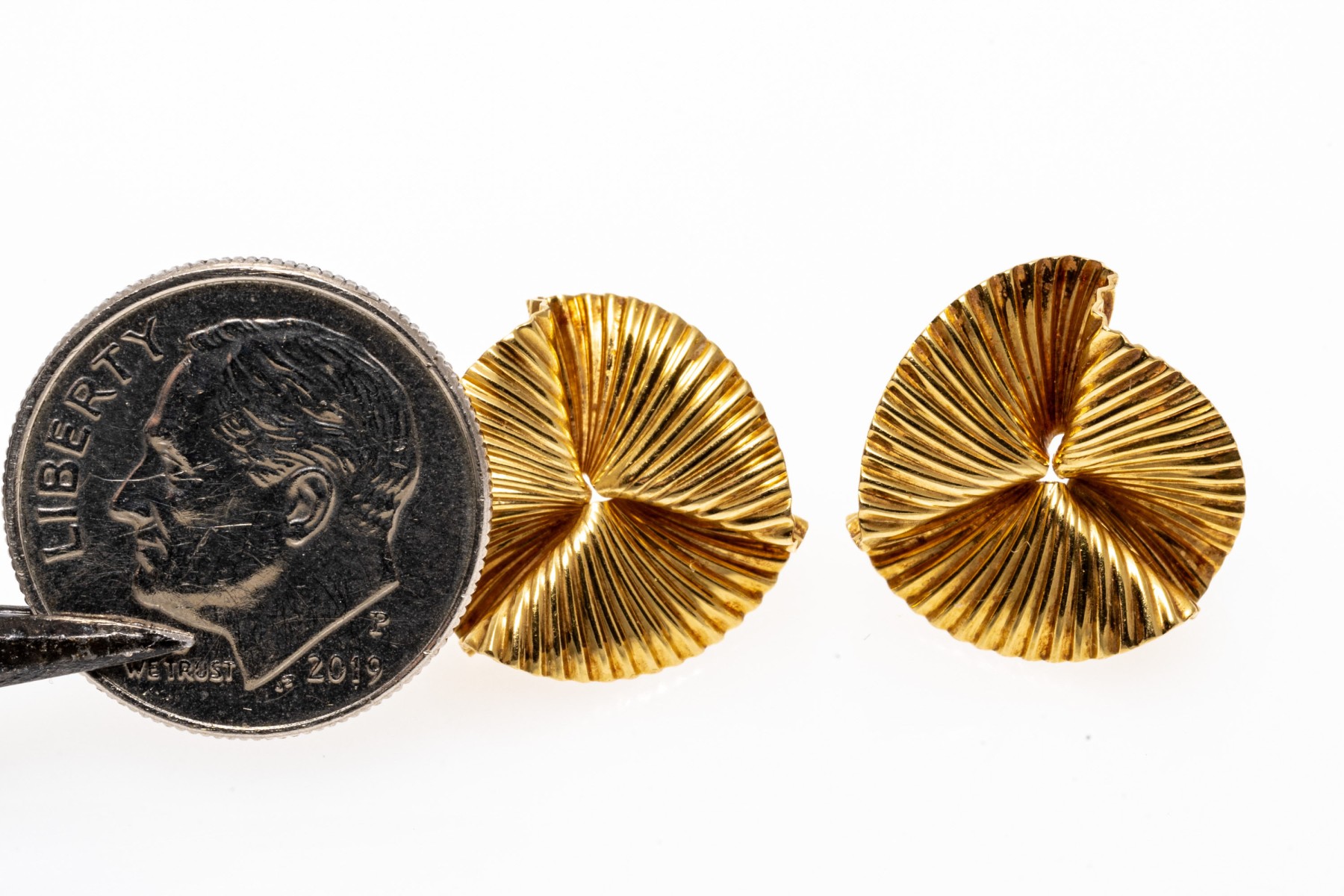A pair of 18K yellow gold earrings. These earrings have an opposing, ribbed fan design. Post backings.
