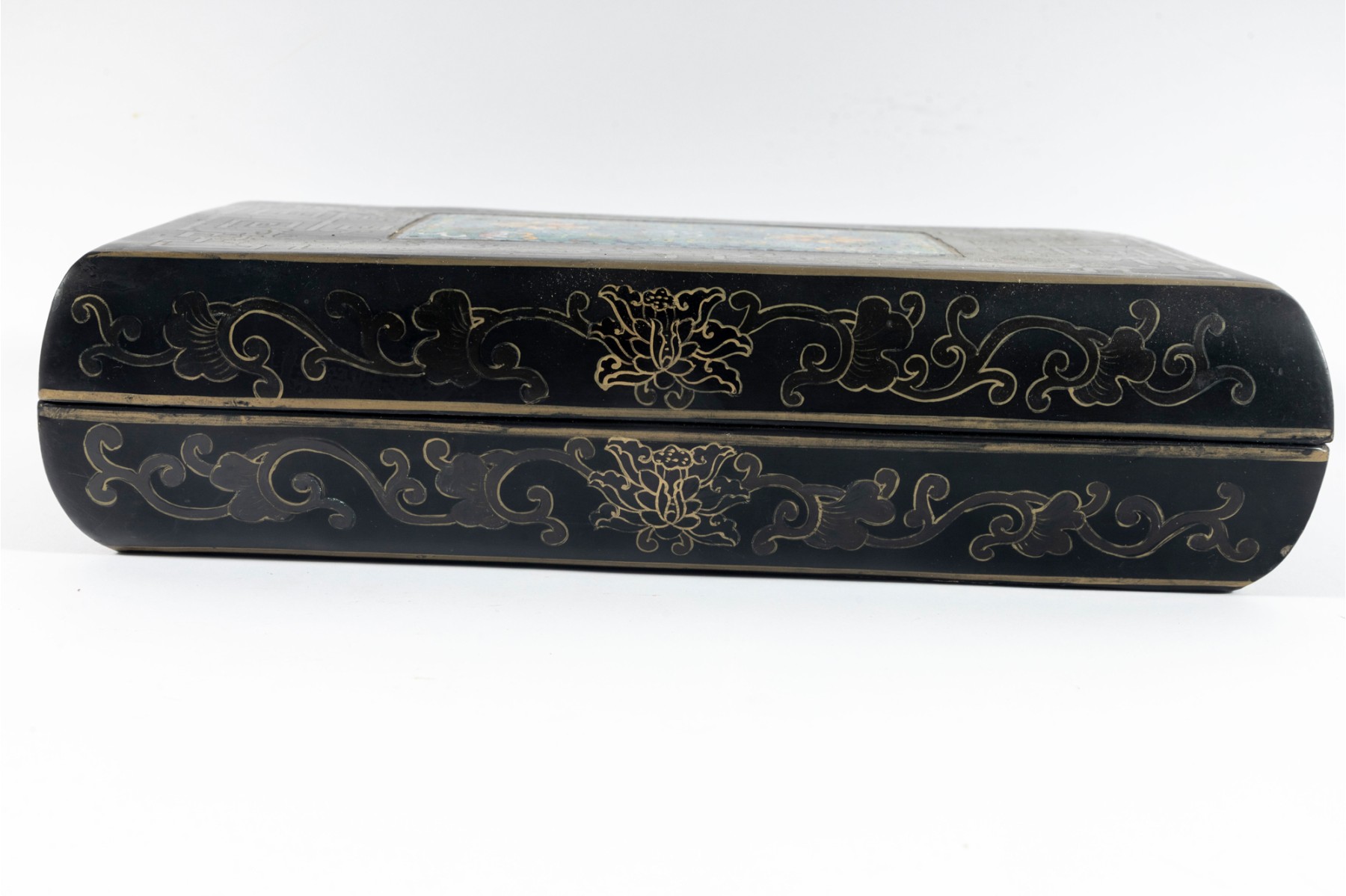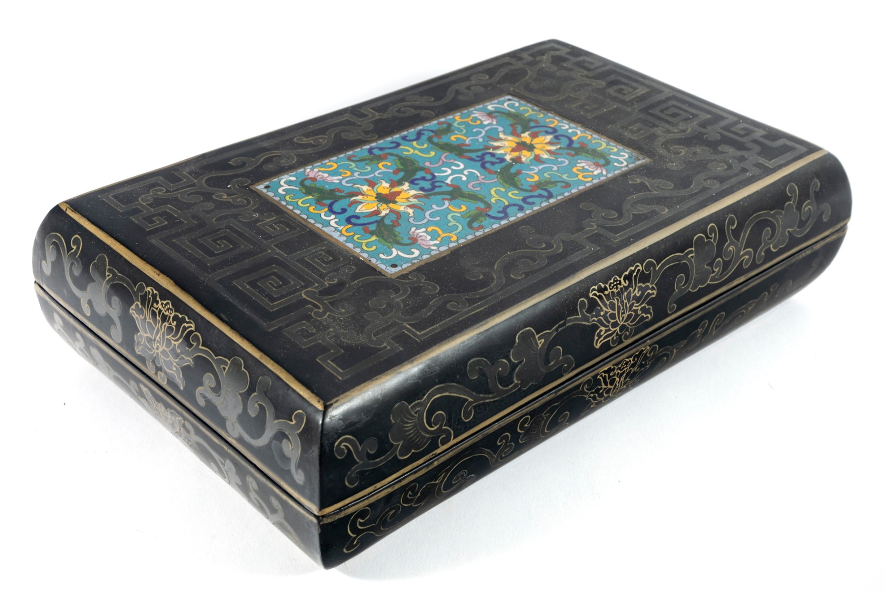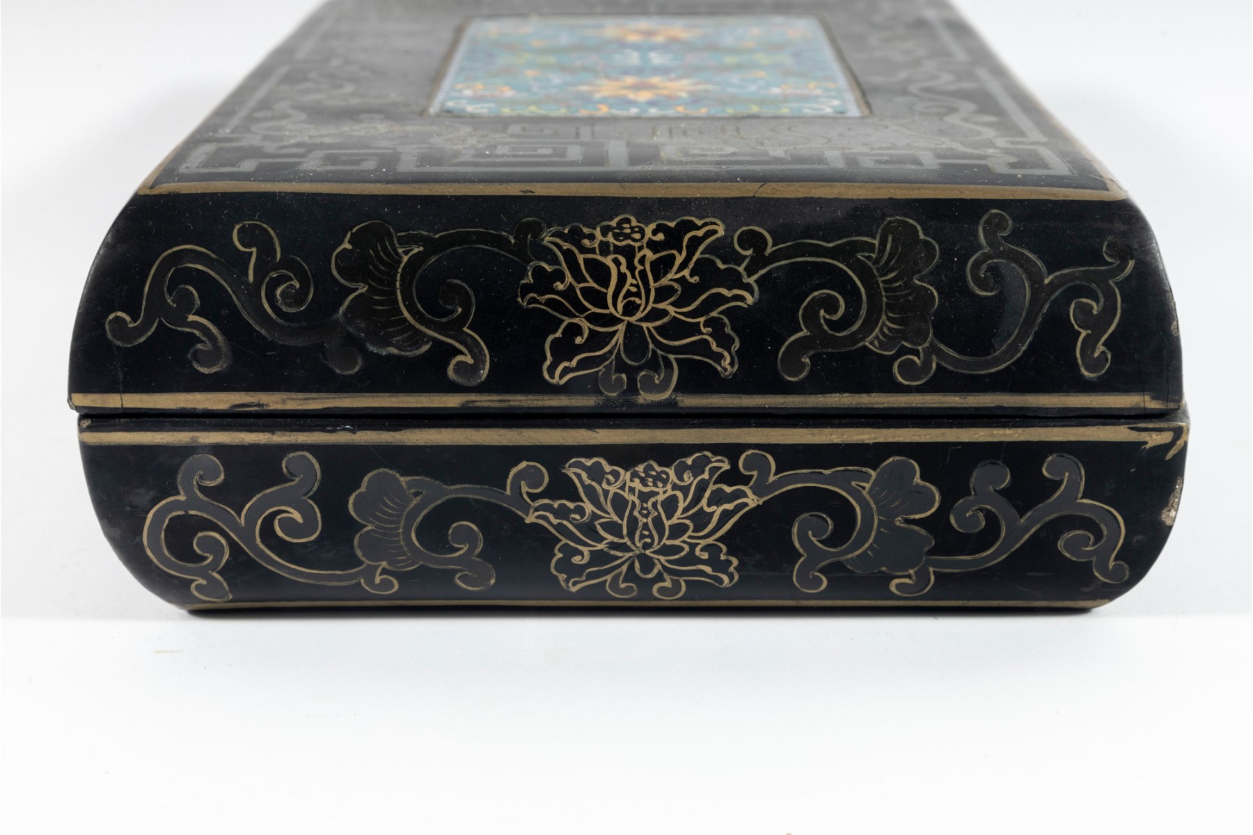 A simple black lacquered wood capsule with top cloisonne enamel details embellished with gold-tone floral trim extending out to the sides.