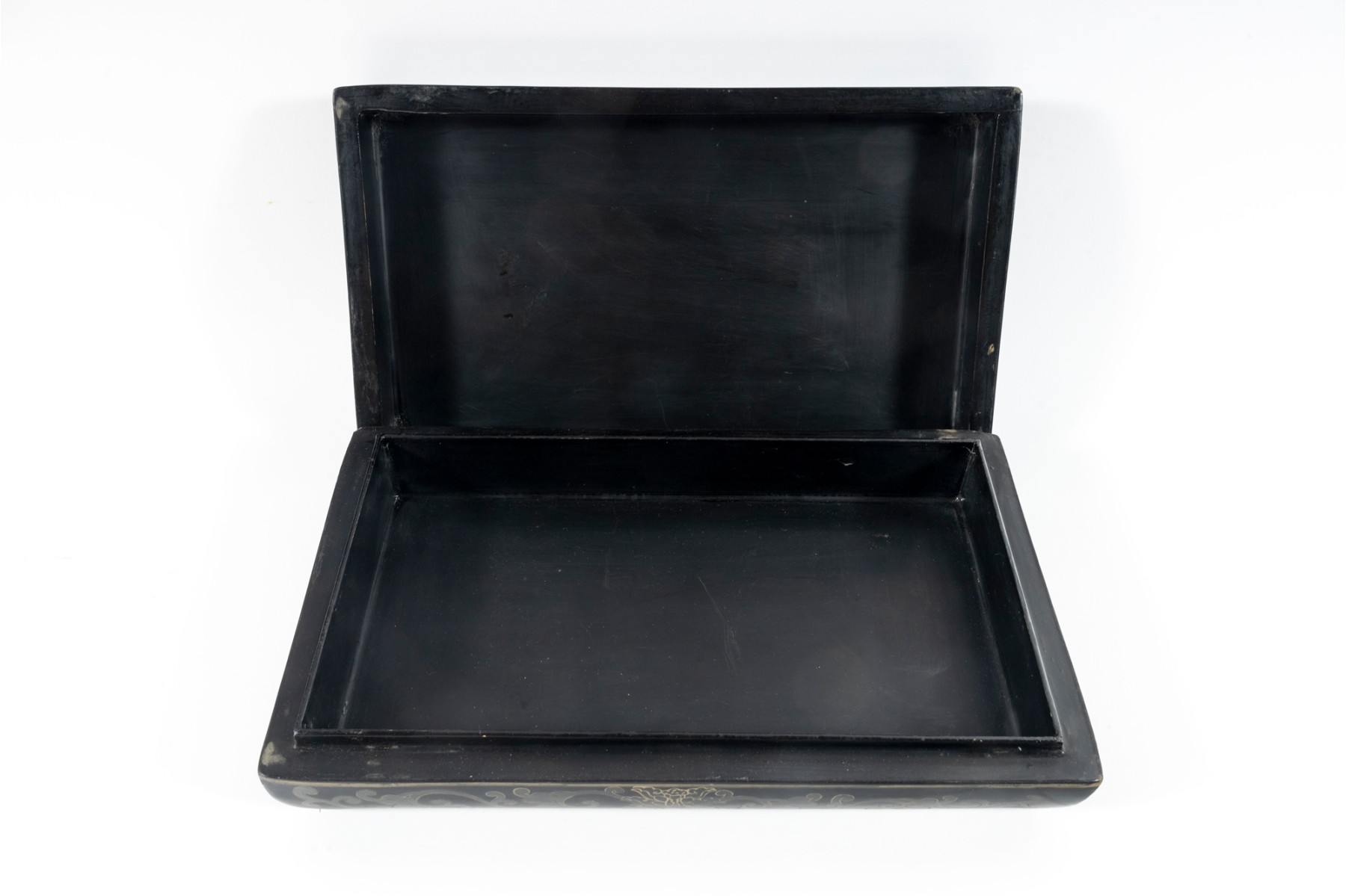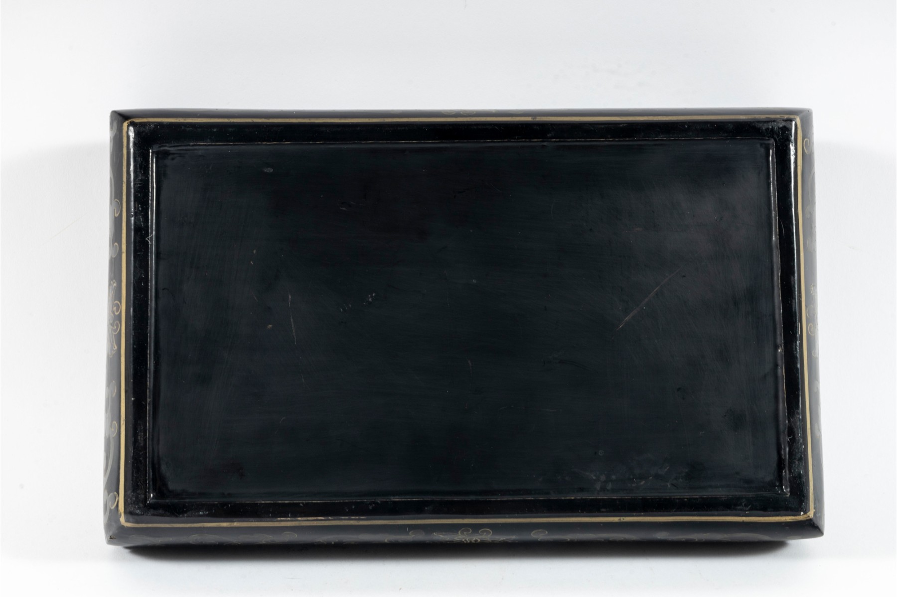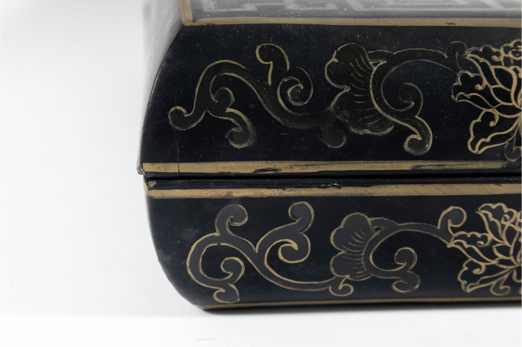 A simple black lacquered wood capsule with top cloisonne enamel details embellished with gold-tone floral trim extending out to the sides.