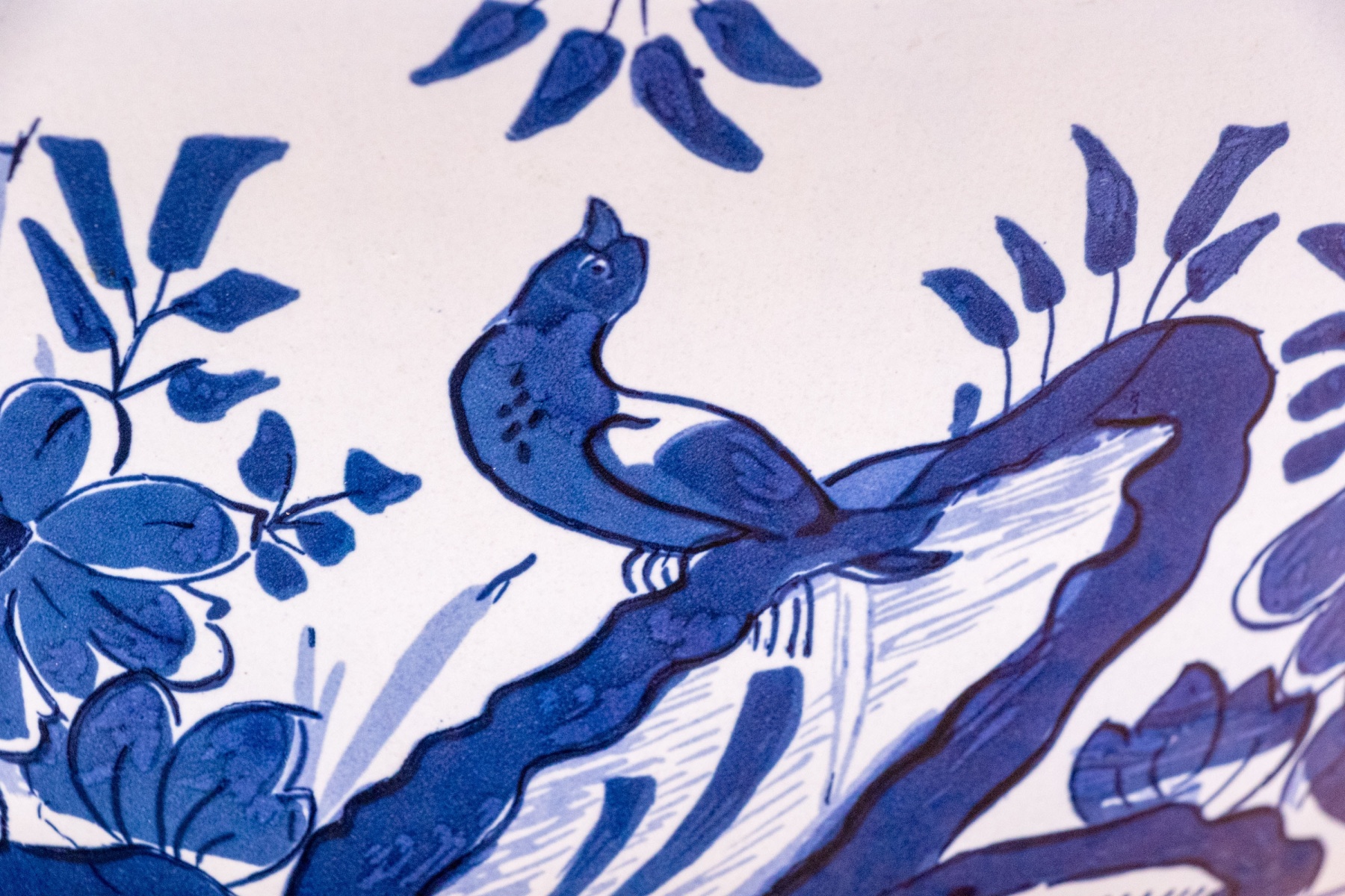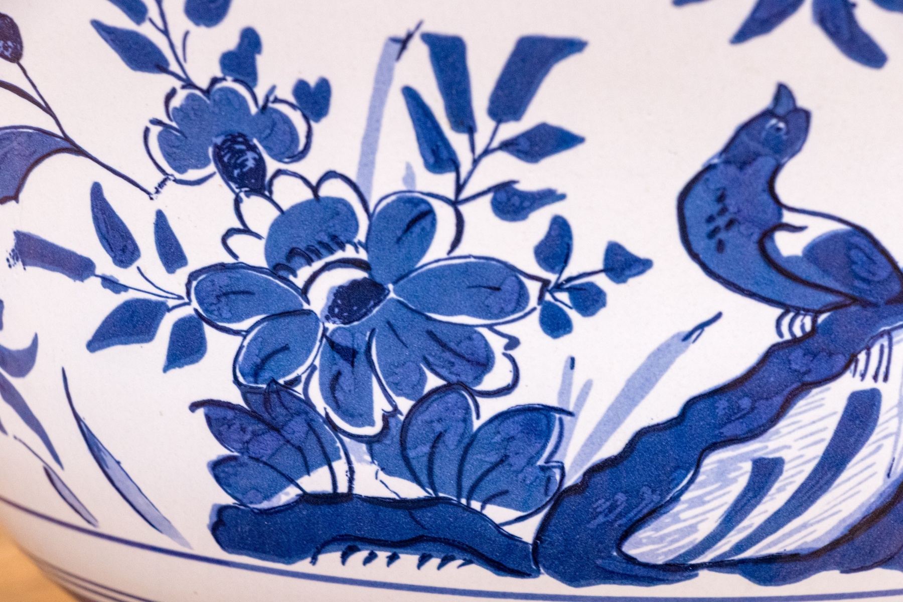 The inverted bell form bowl with flared mouth rim, stands on a circular foot ring. The bowl is marked underfoot. The bowl with vibrant cobalt underglaze decoration depicting flowers, perched birds and landscape motifs, with additional blue and white motifs to the interior.