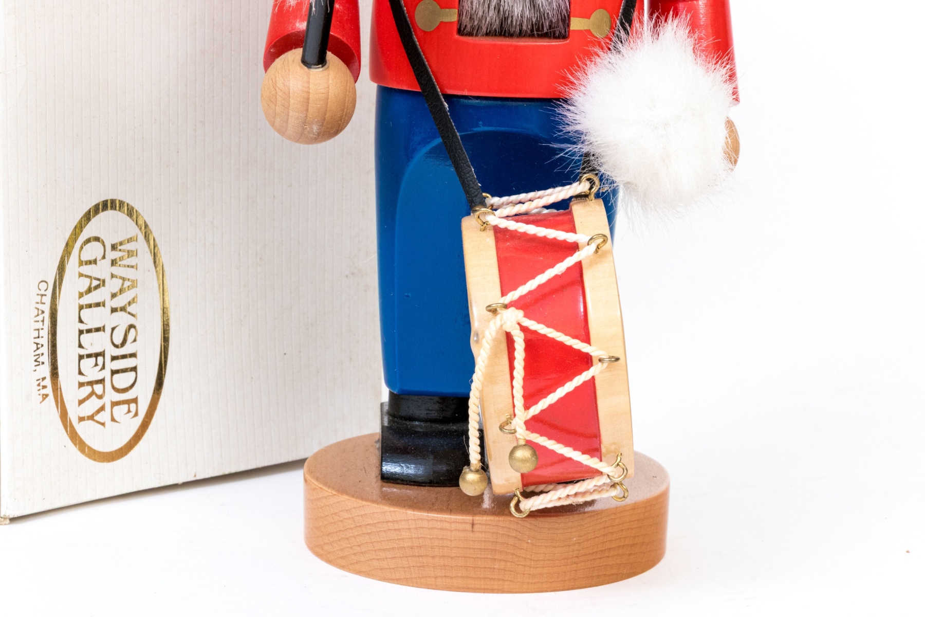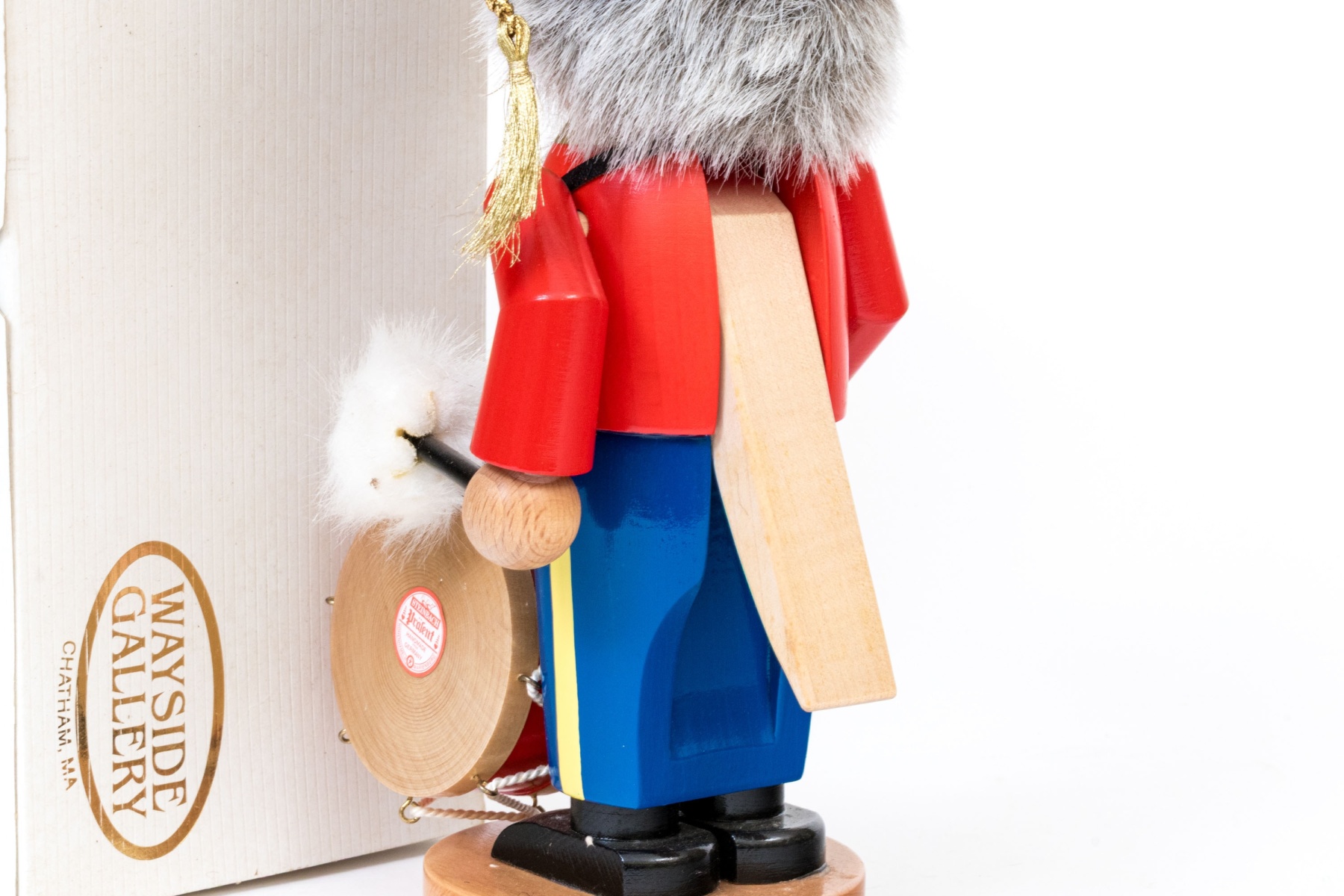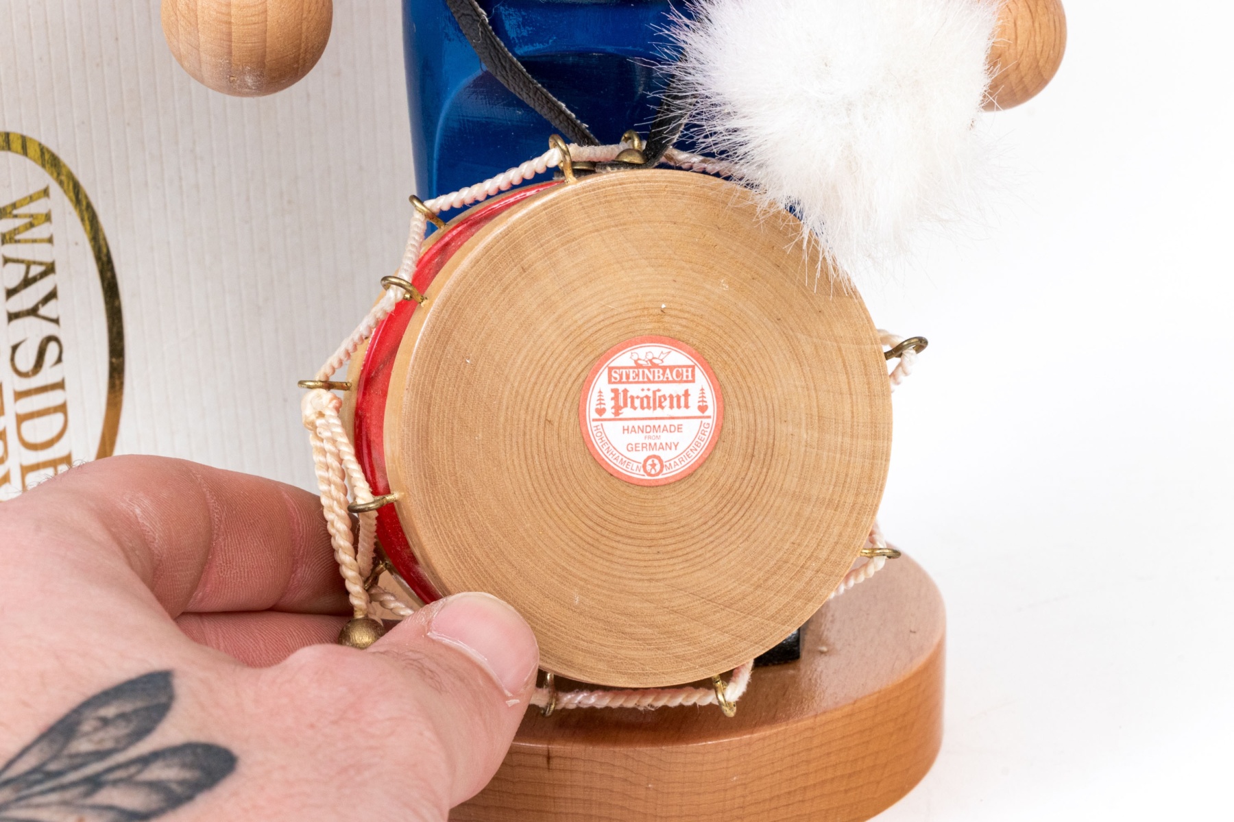 A charming Steinbach Volkskunst handcrafted nutcracker in the form of a toy soldier raised on circular base the figure is hand-crafted with fine level details. Brand information underfoot along with personal inscription.