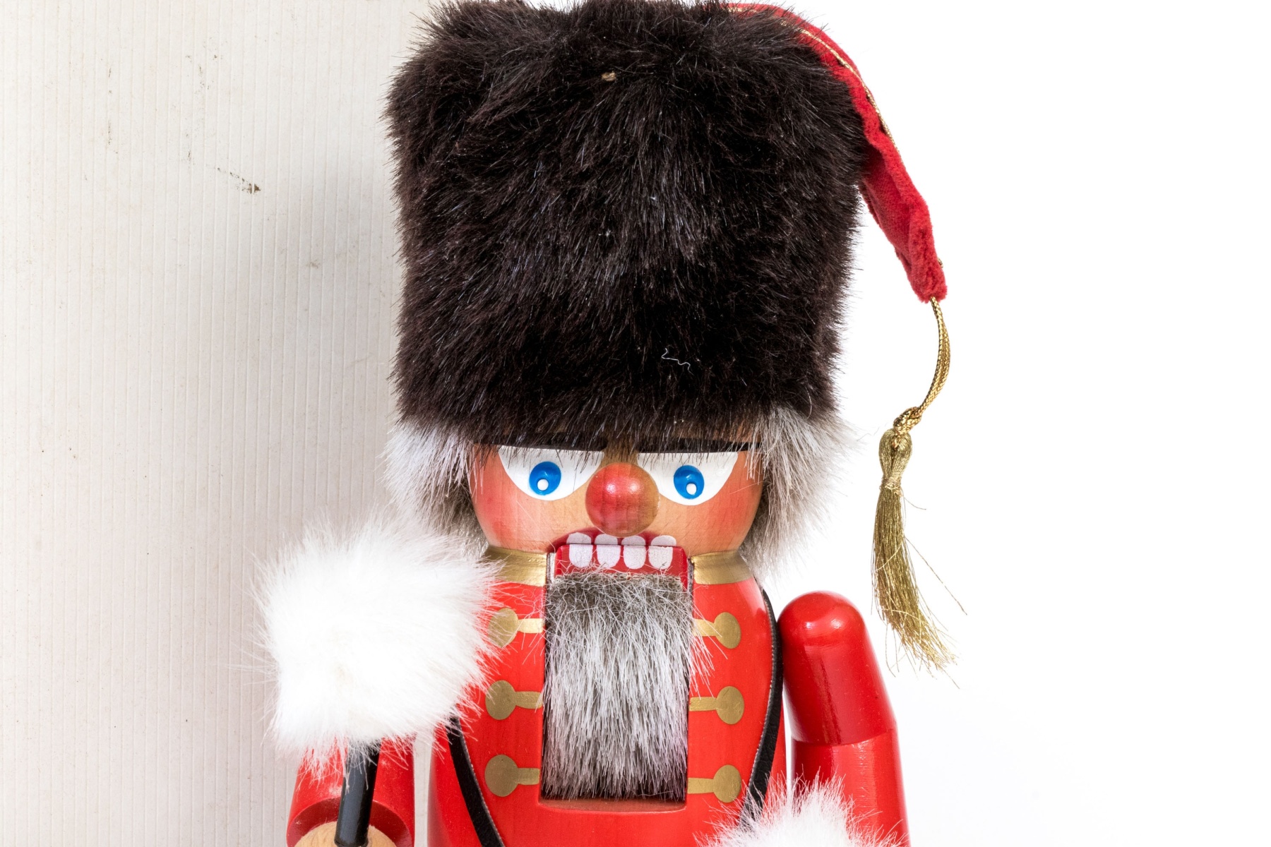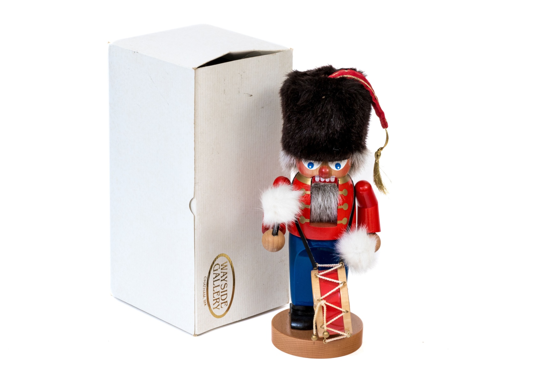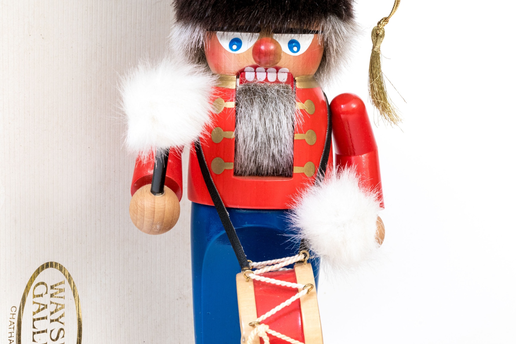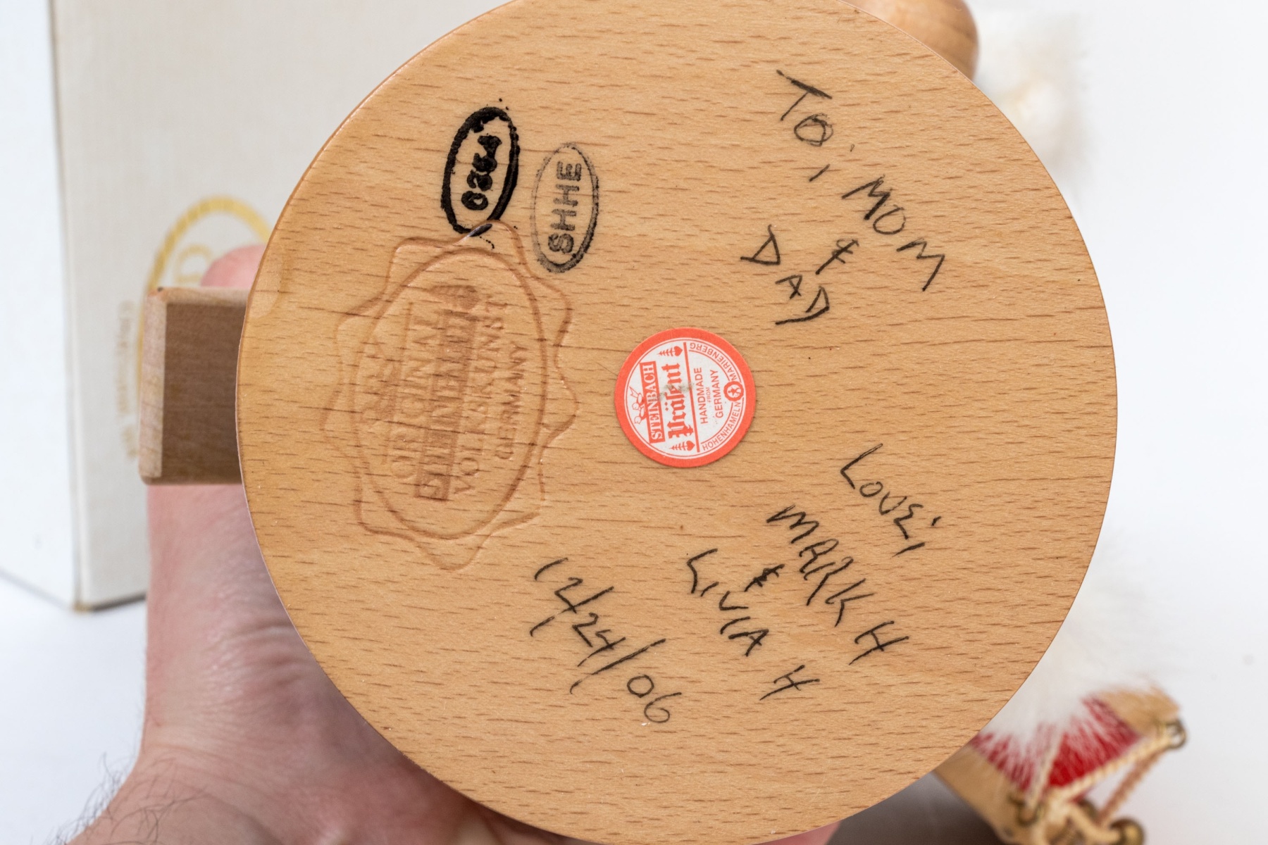 A charming Steinbach Volkskunst handcrafted nutcracker in the form of a toy soldier raised on circular base the figure is hand-crafted with fine level details. Brand information underfoot along with personal inscription.