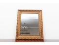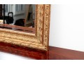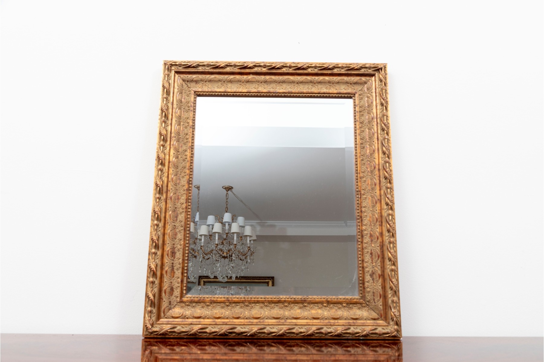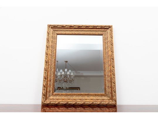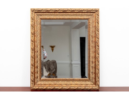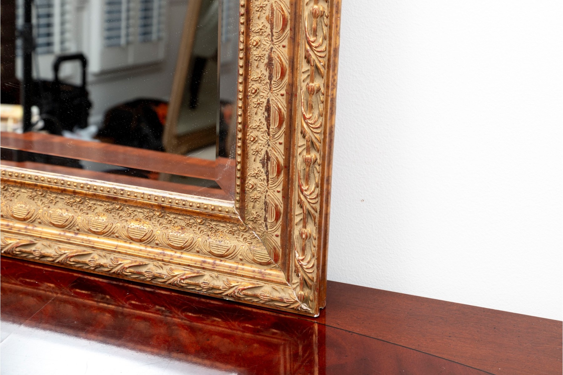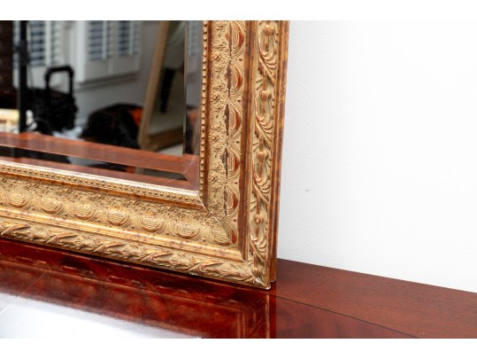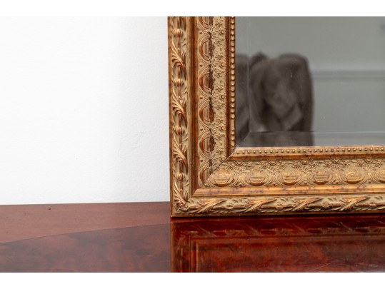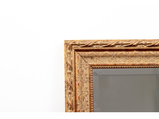 A contemporary wall mirror -- beveled glass framed by ornately carved detail, gilt with a distressed finish.