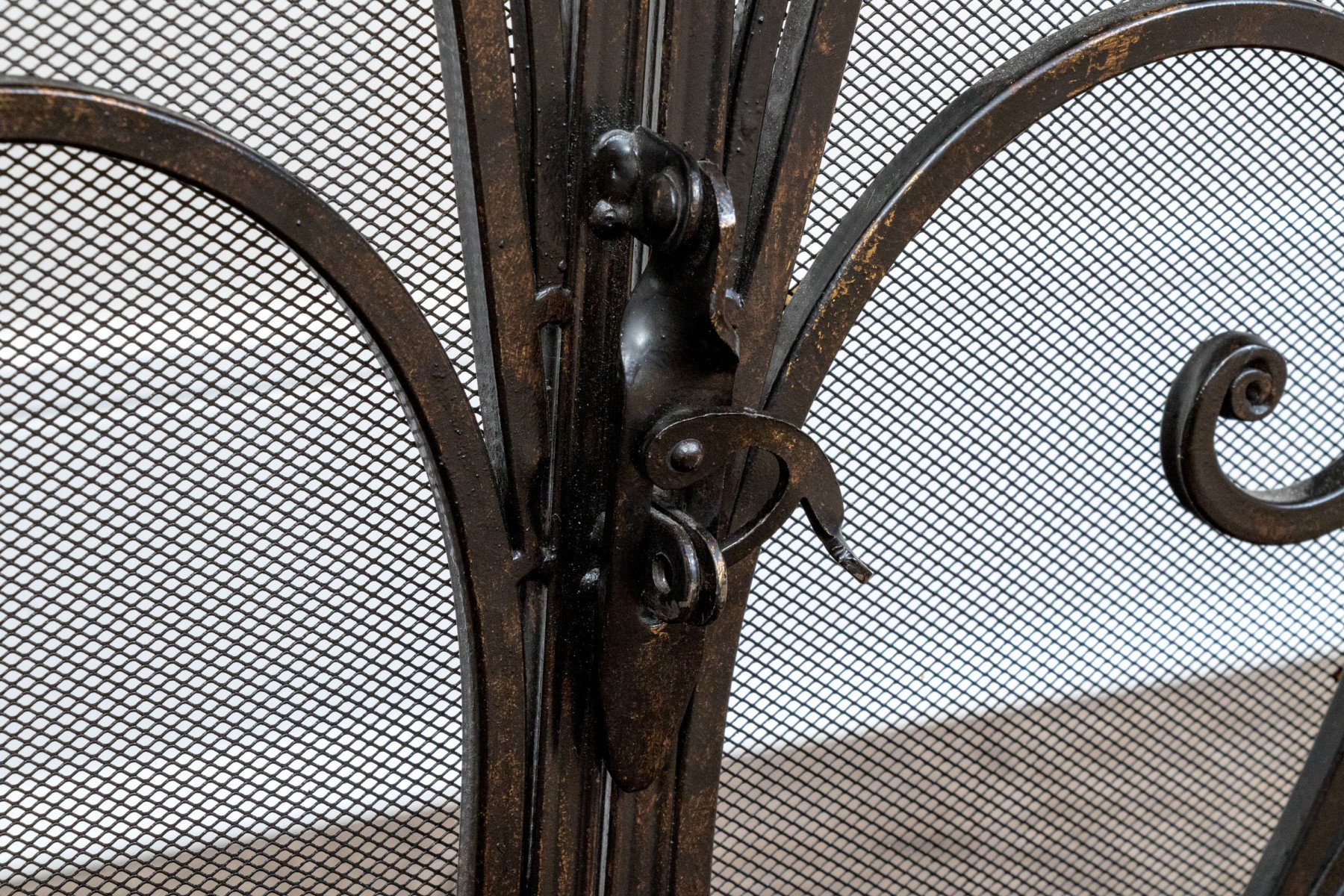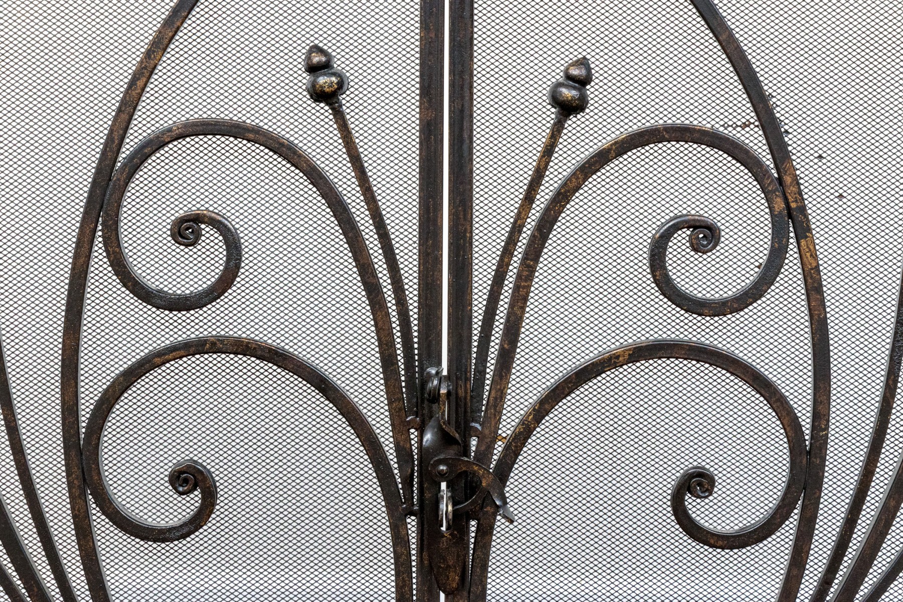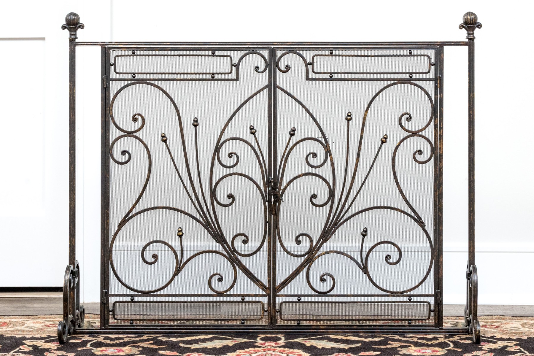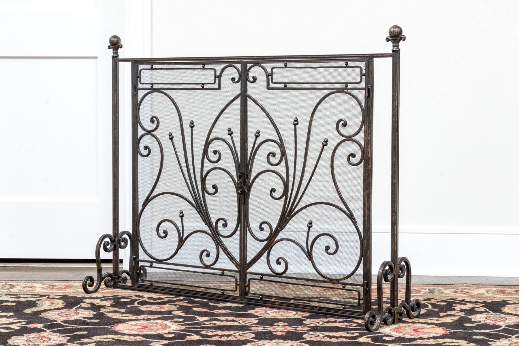 A handsome Art Nouveau style black finished fire spark screen with overlaid scrolling decoration over the mesh interior with a pair of doors that can be opened to access the fireplace when placing more wood in for example.
